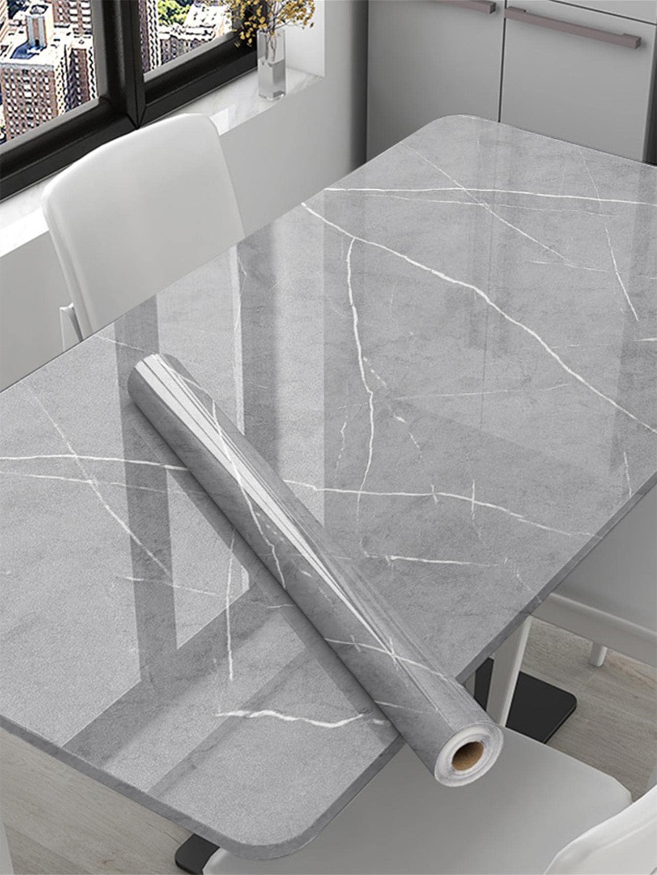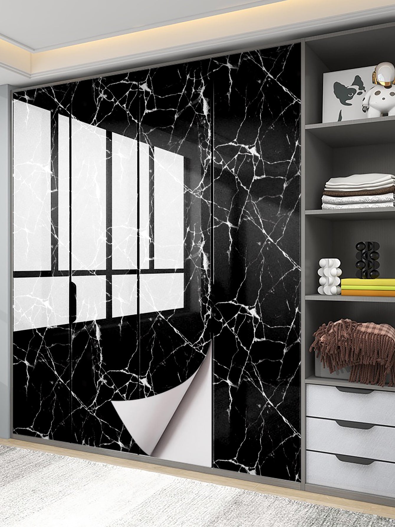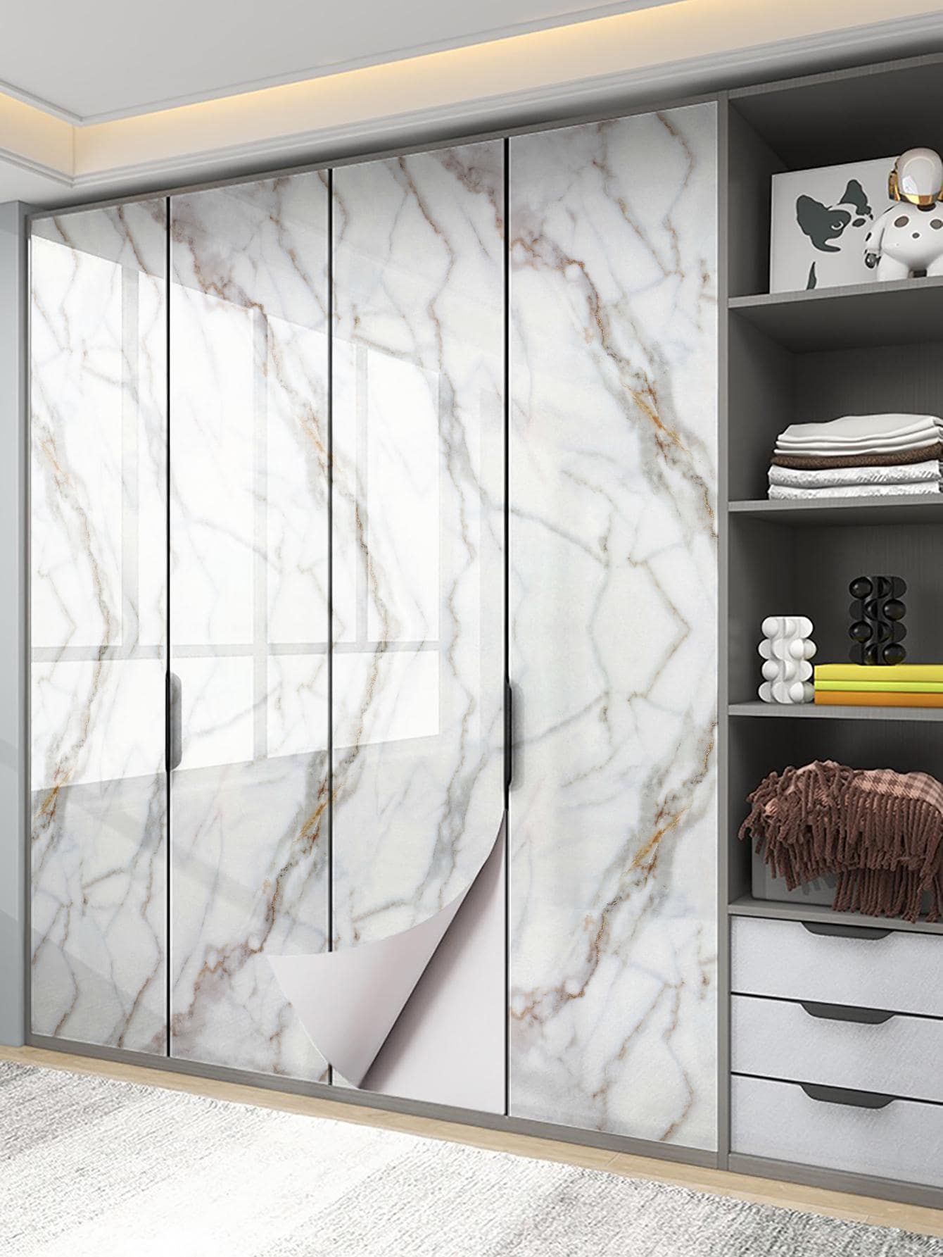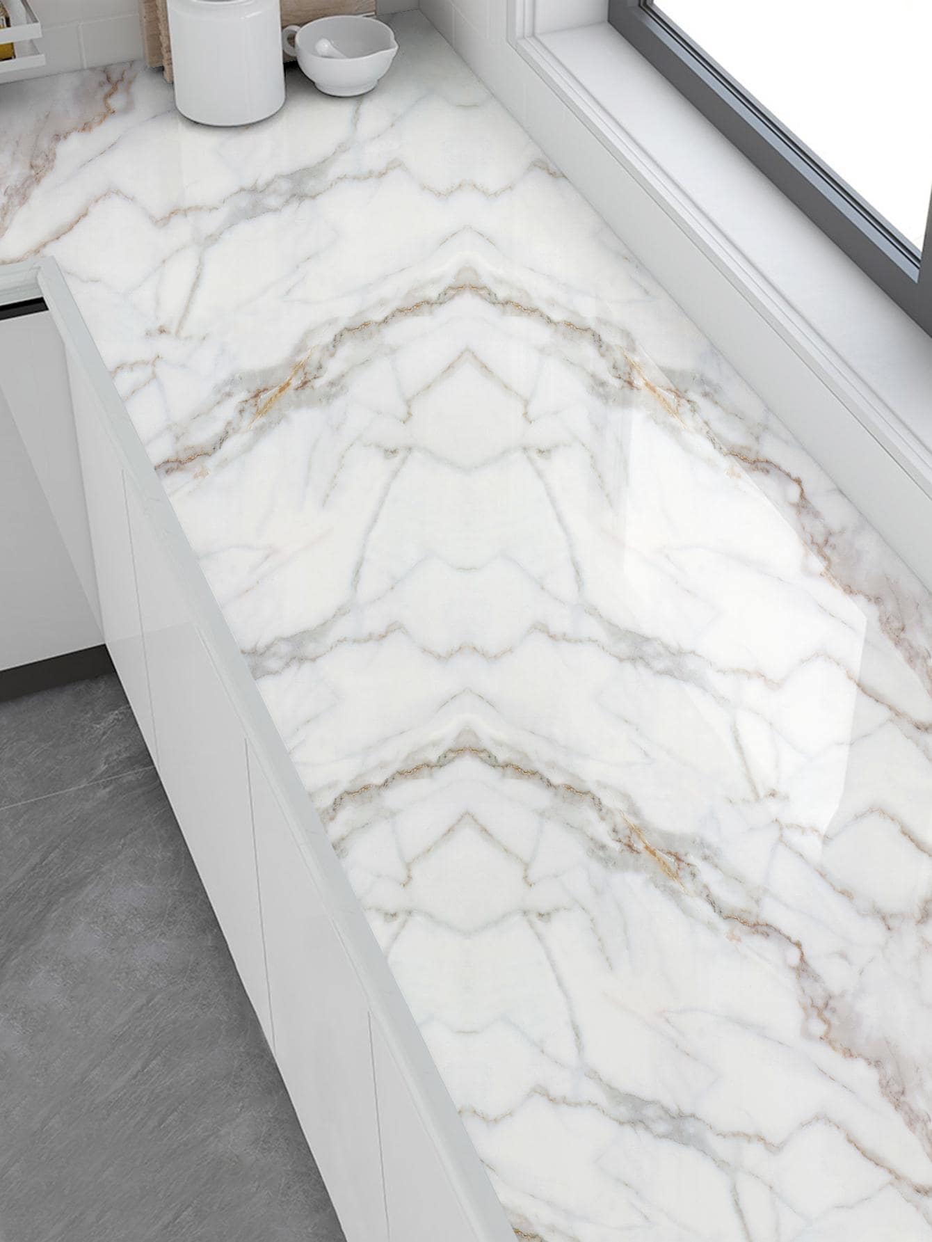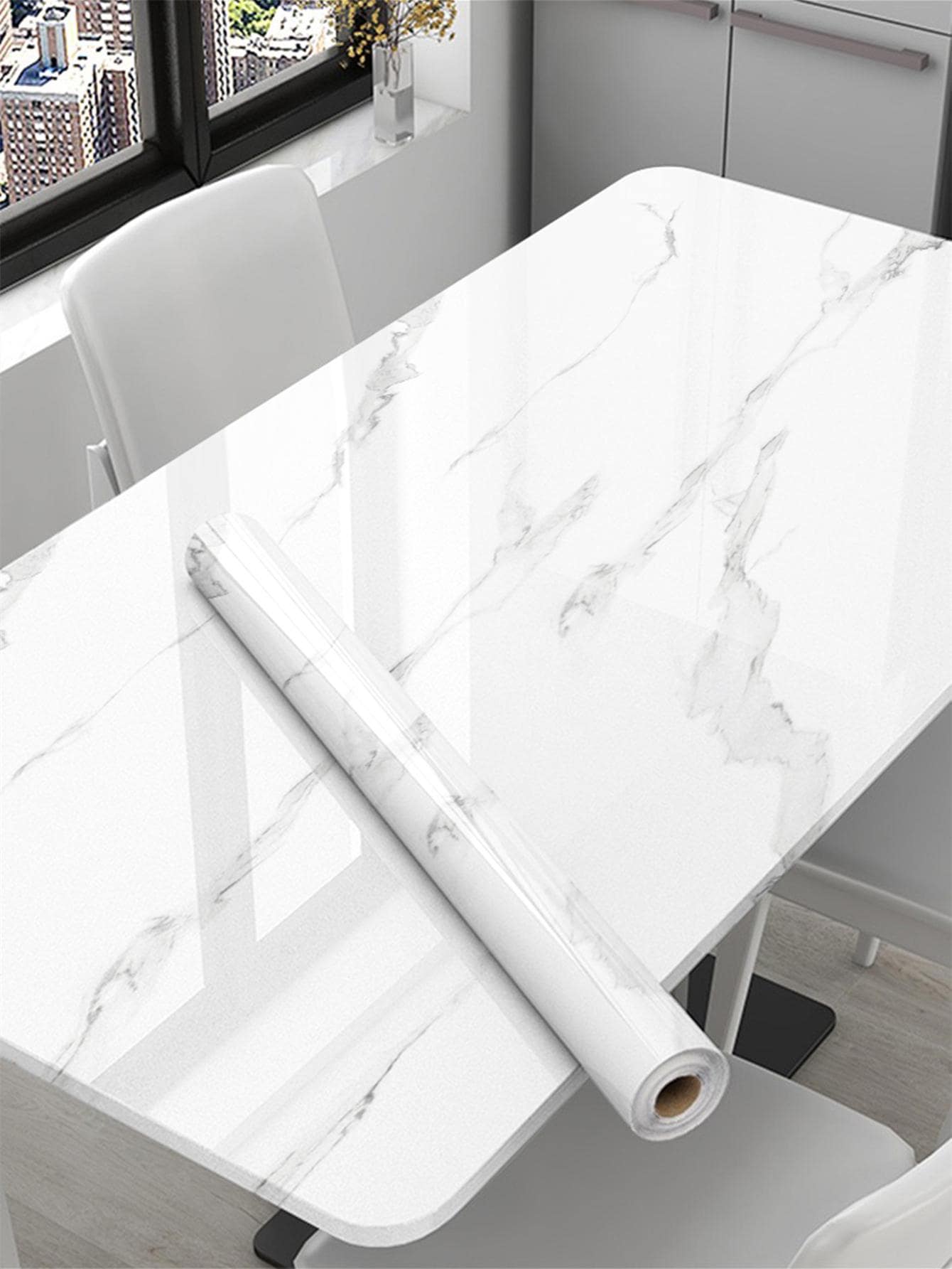 La superficie autoadesiva garantisce un'applicazione rapida e senza residui, mentre il motivo marmo aggiunge profondità e carattere allo spazio.