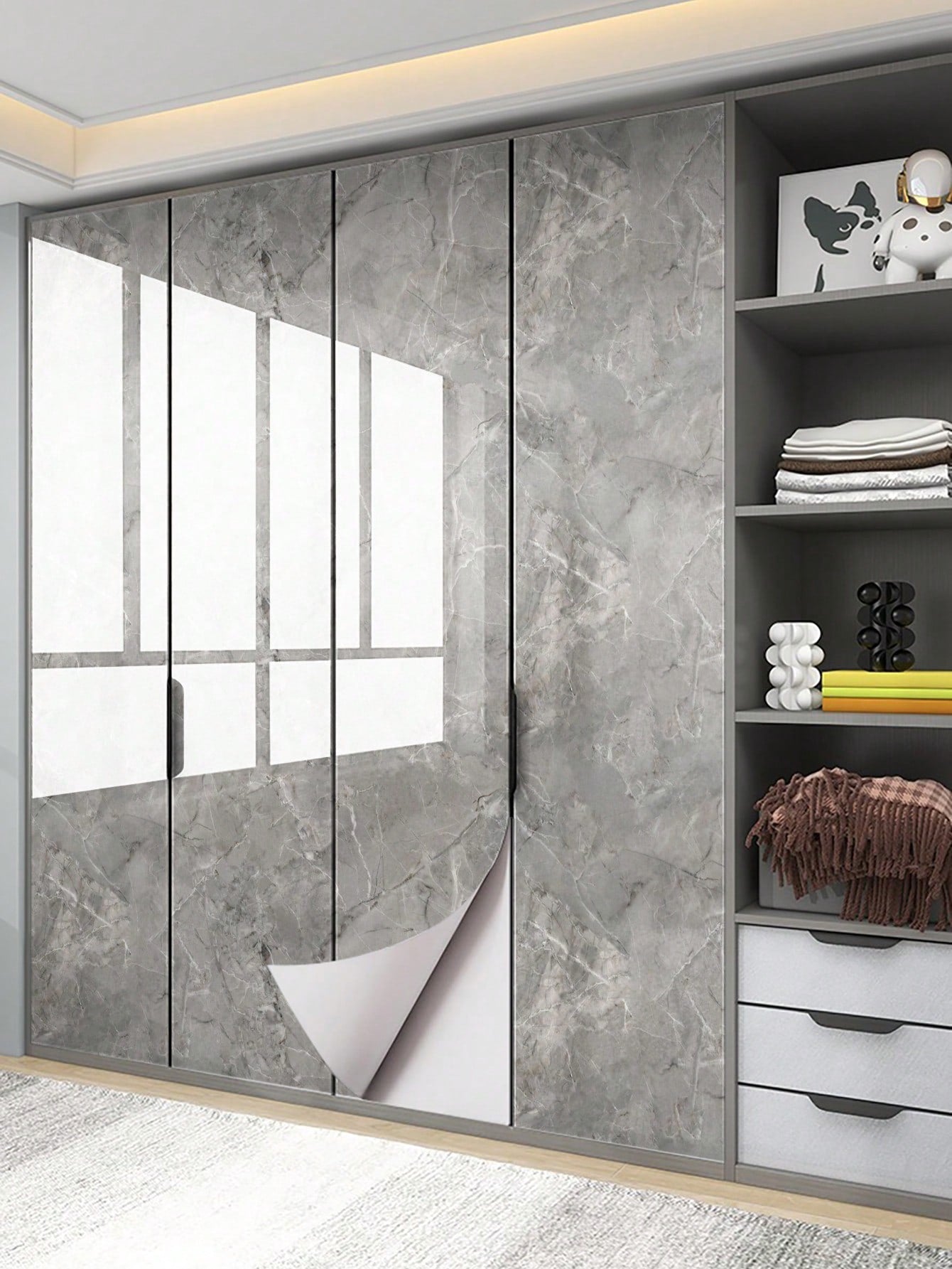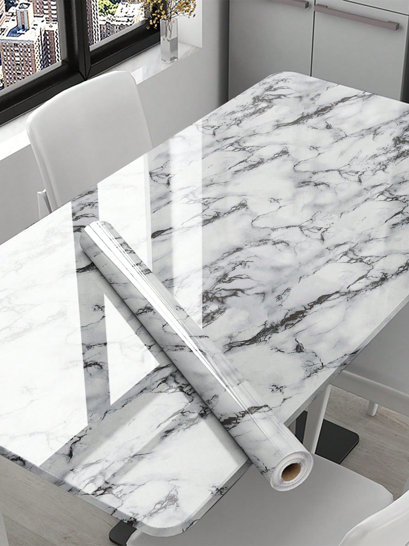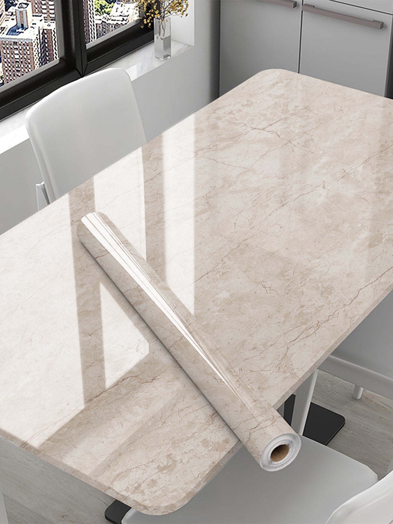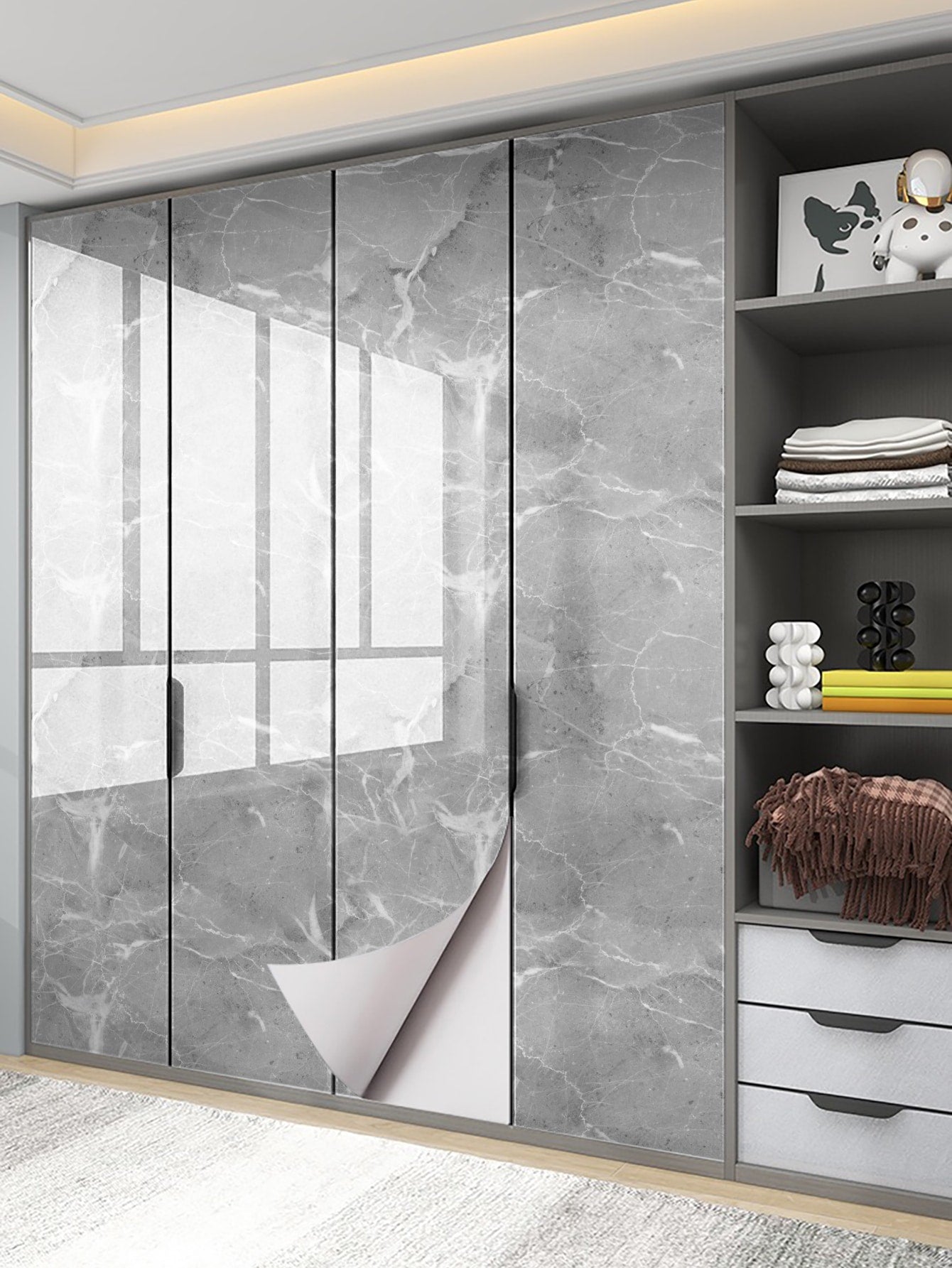La superficie autoadesiva garantisce un'applicazione rapida e senza residui, mentre il motivo marmo aggiunge profondità e carattere allo spazio.