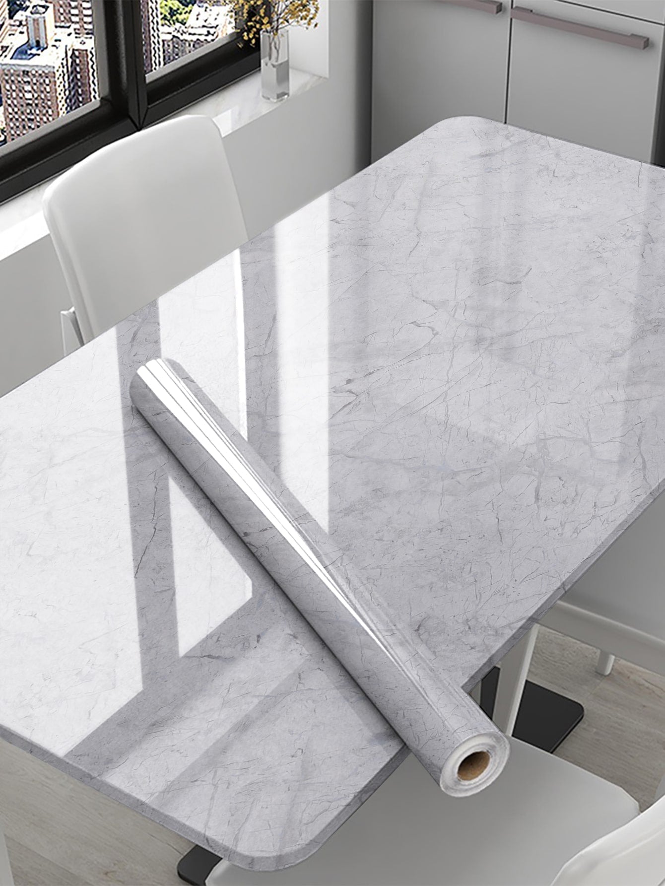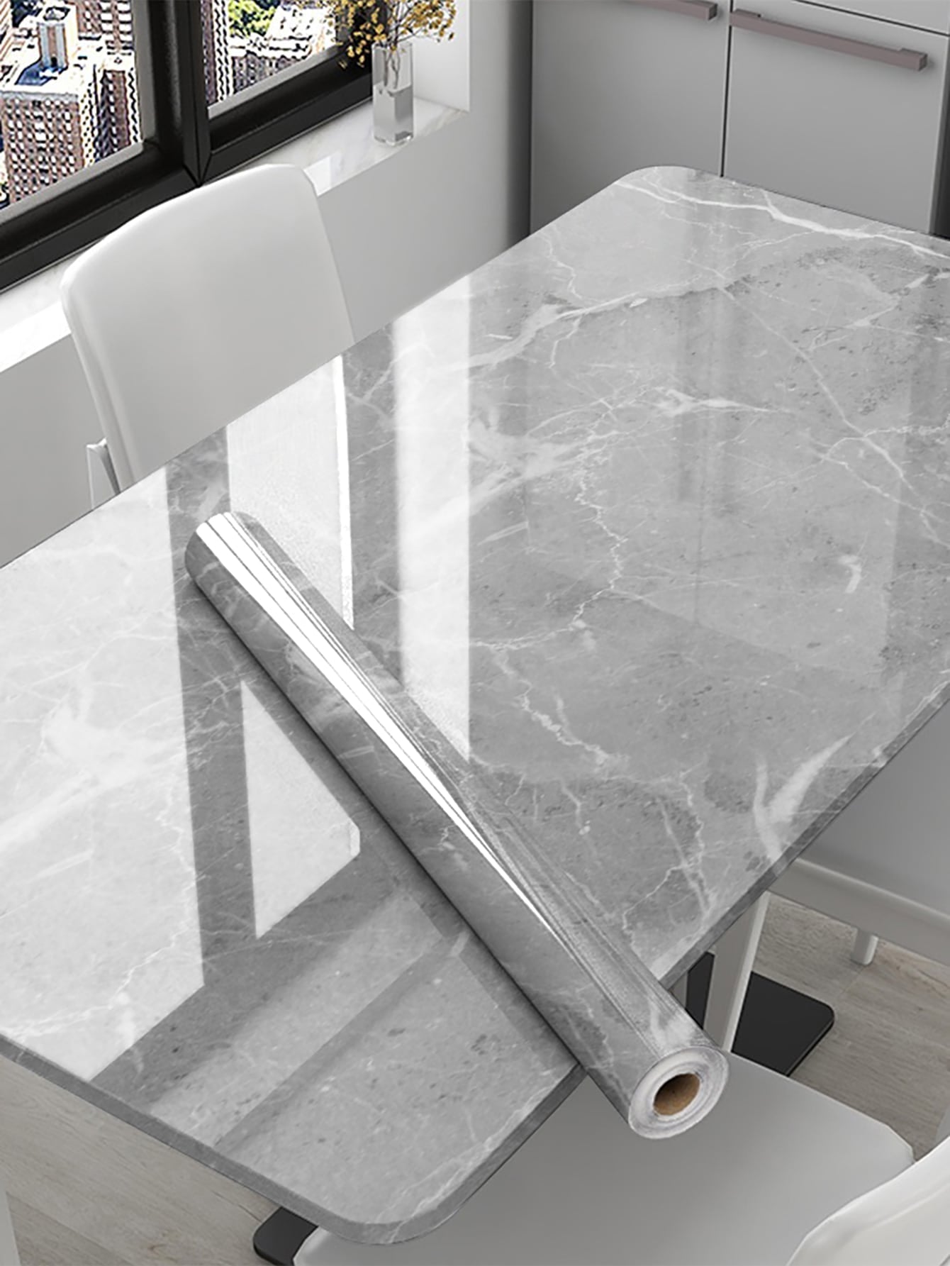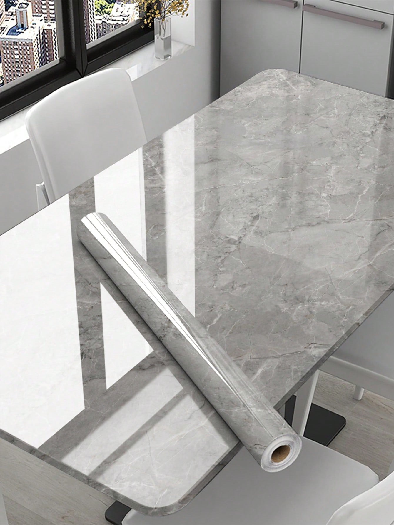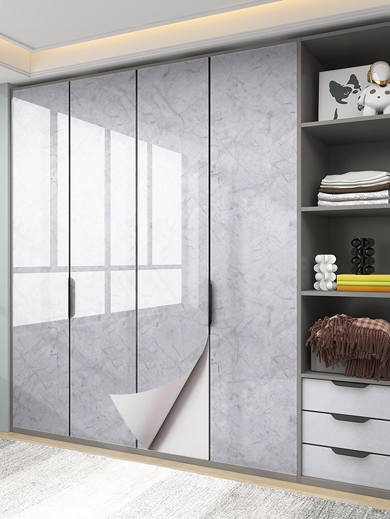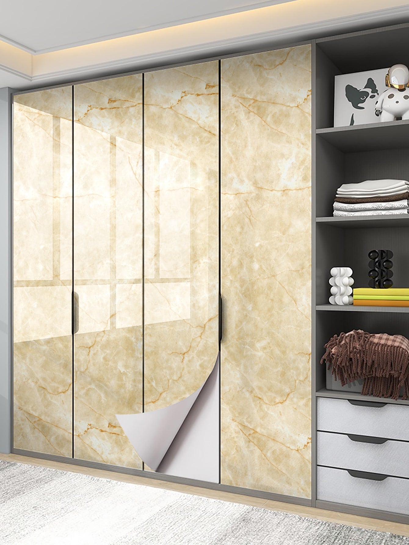 La superficie autoadesiva garantisce un'applicazione rapida e senza residui, mentre il motivo marmo aggiunge profondità e carattere allo spazio.