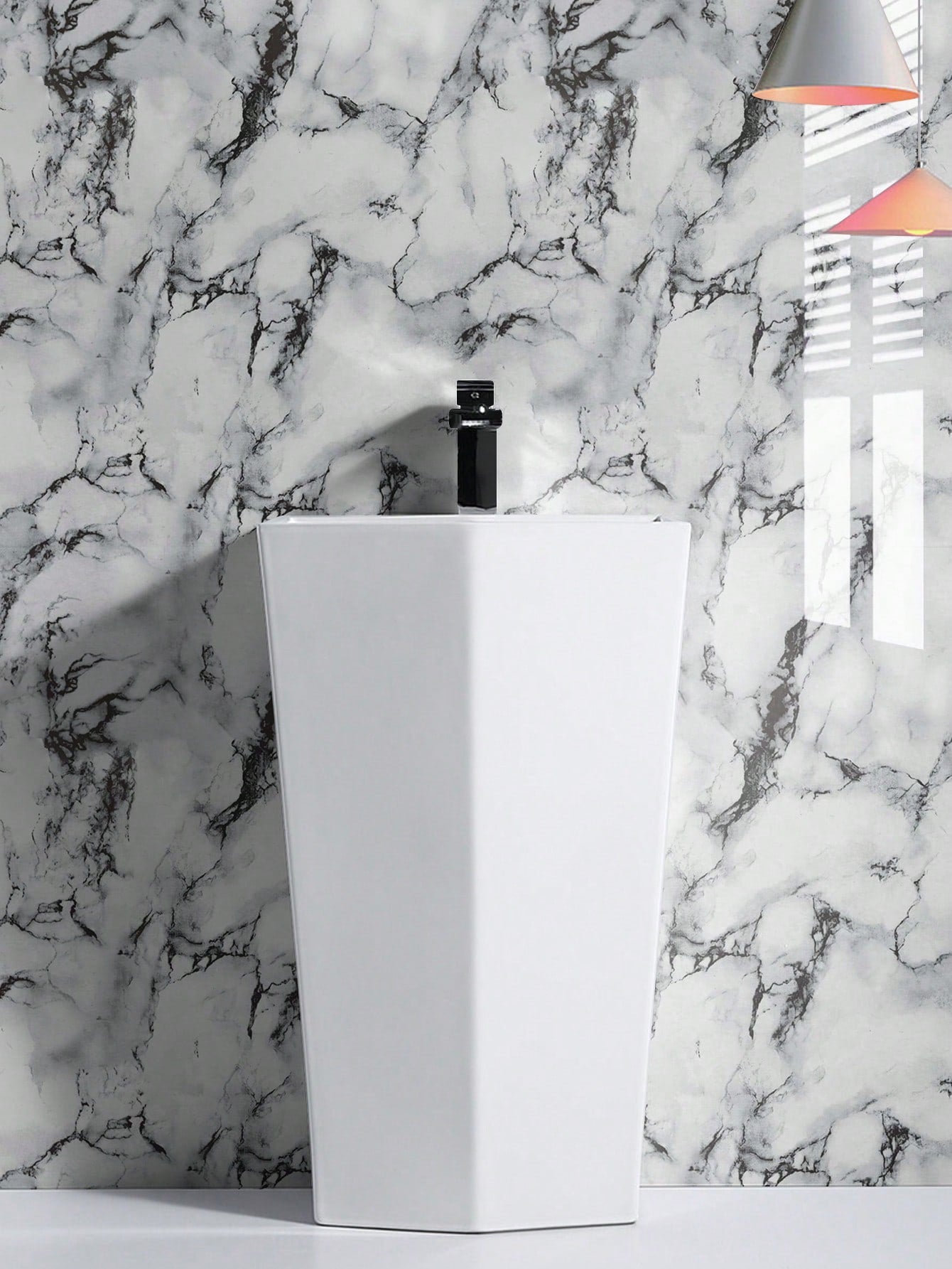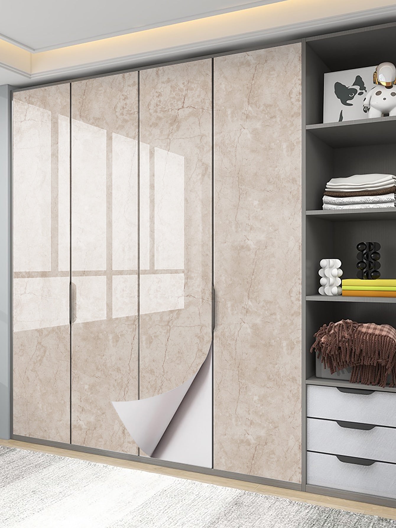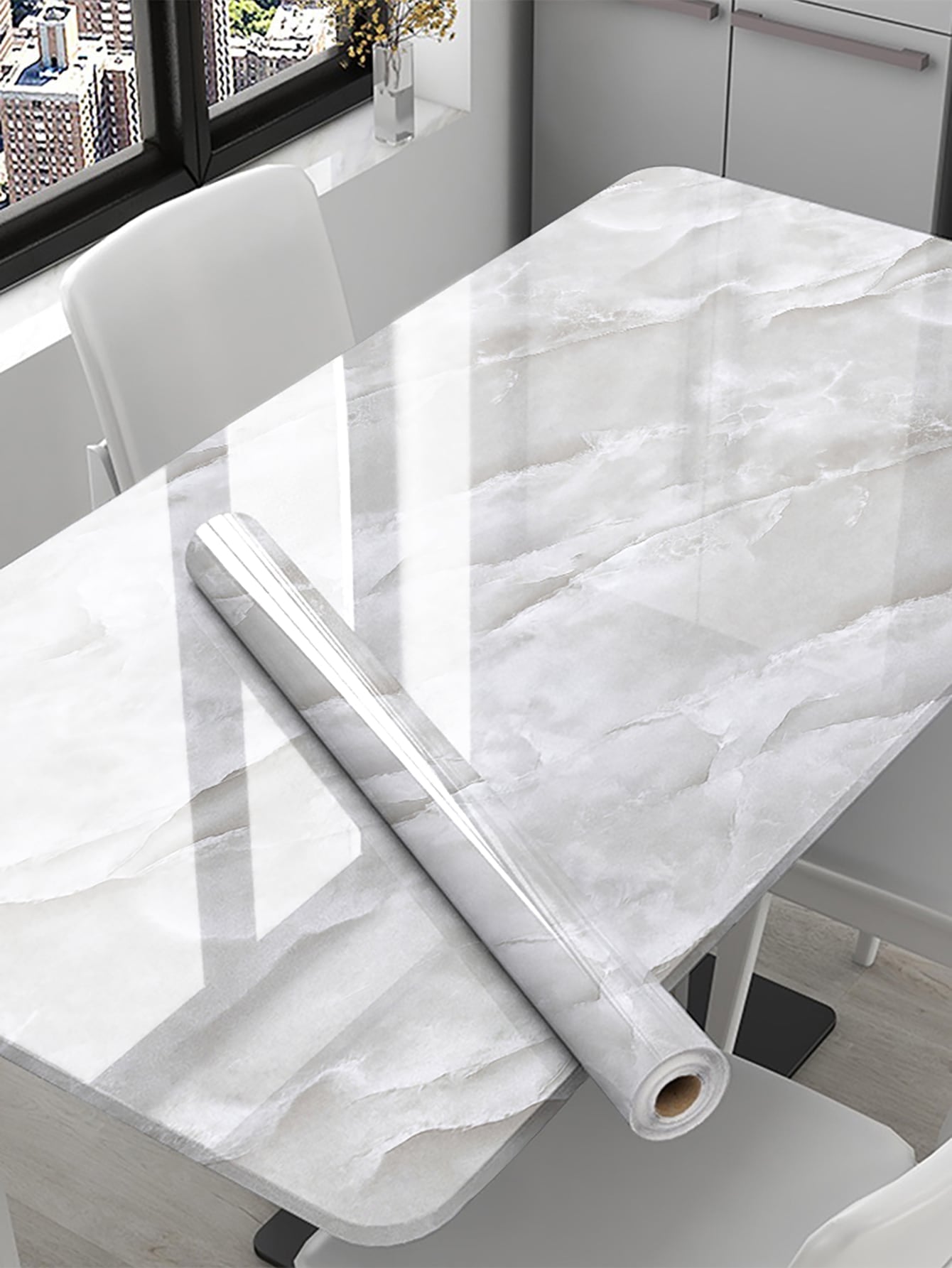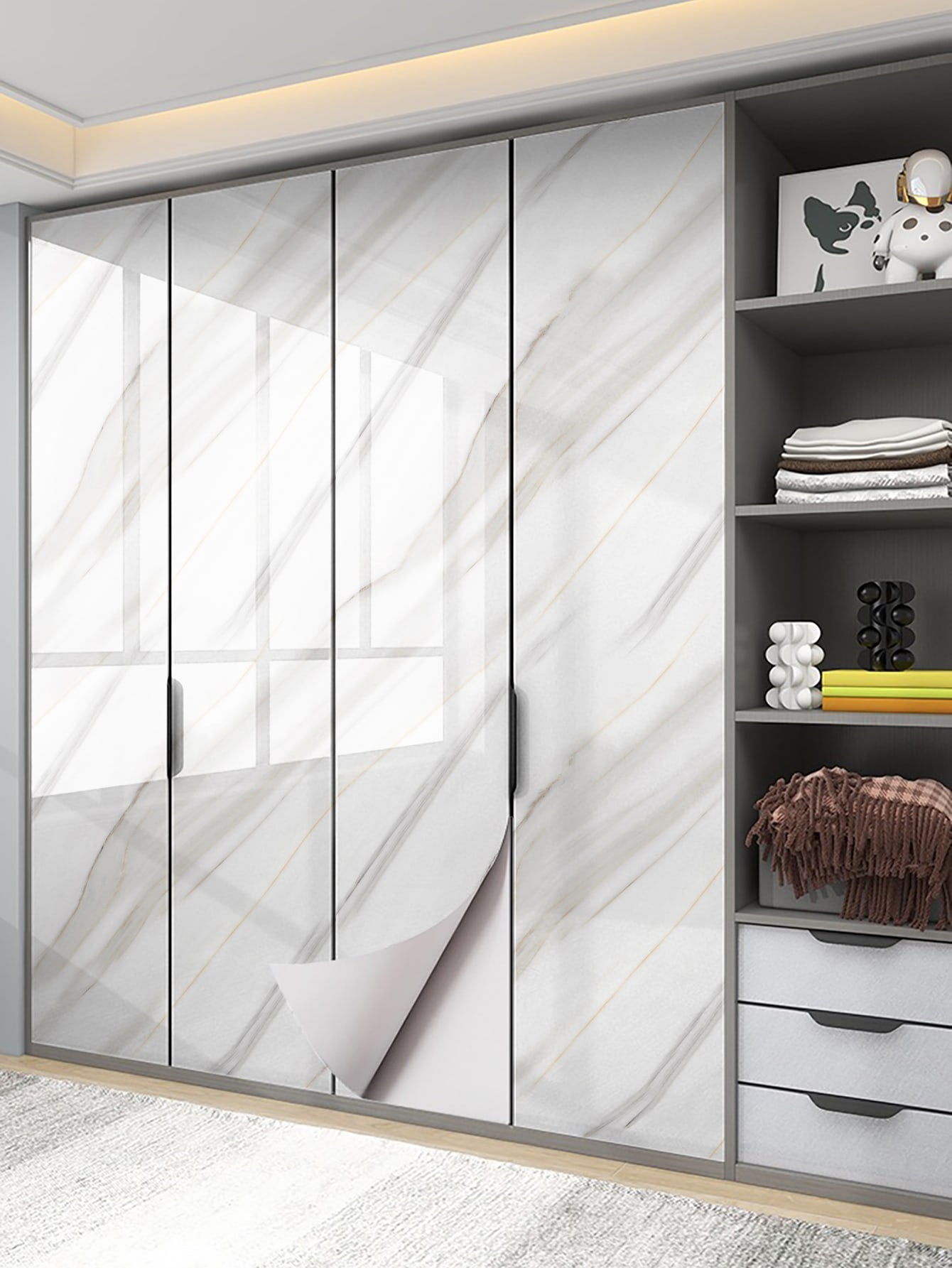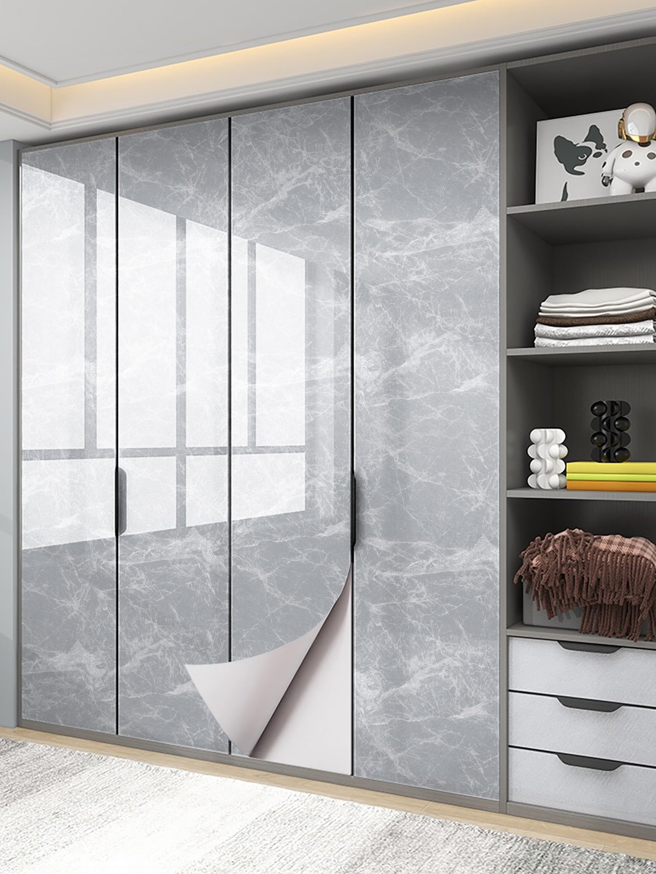 La superficie autoadesiva garantisce un'applicazione rapida e senza residui, mentre il motivo marmo aggiunge profondità e carattere allo spazio.