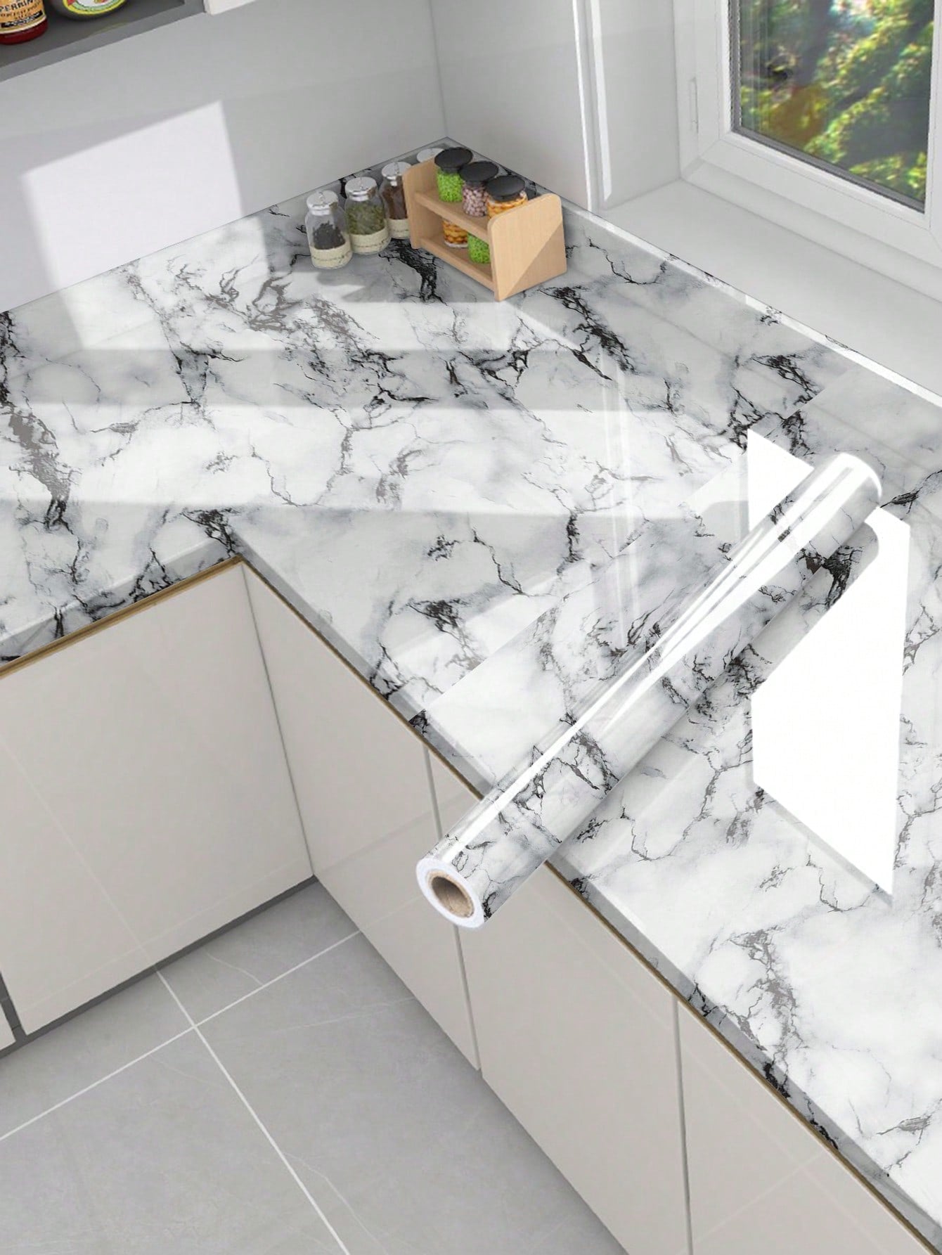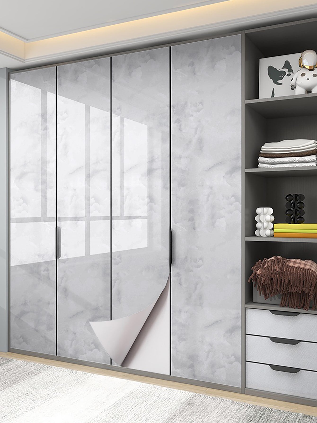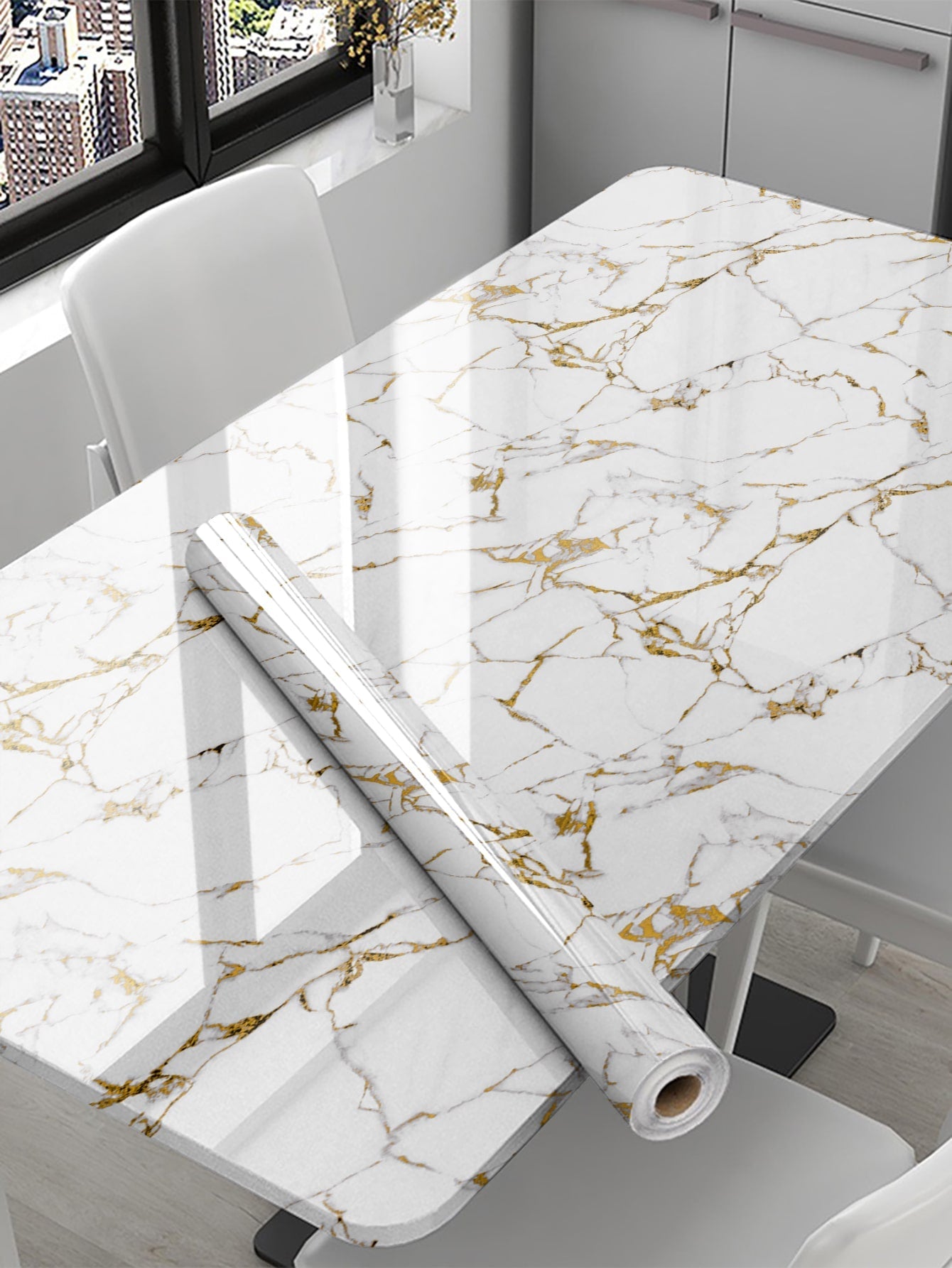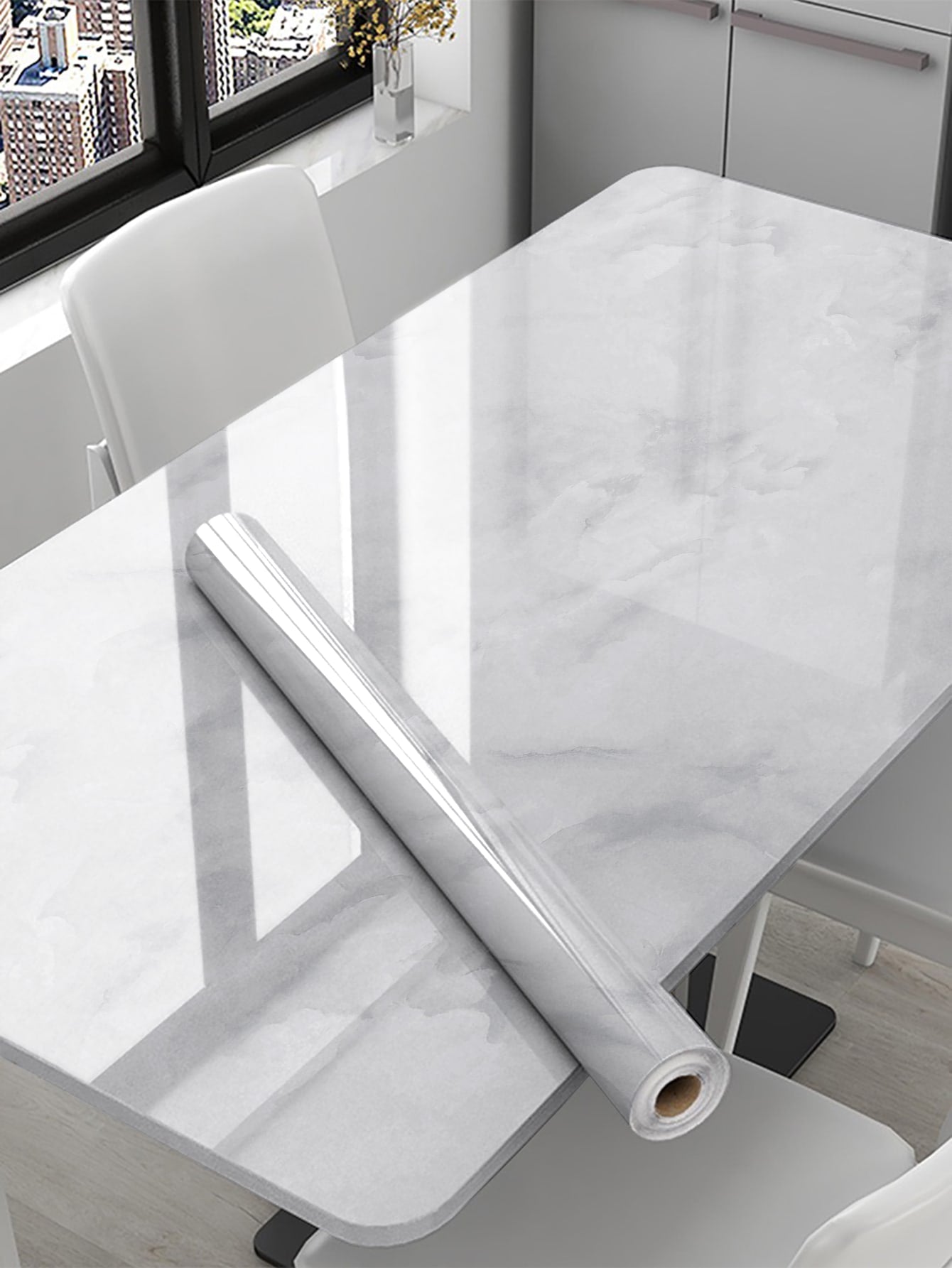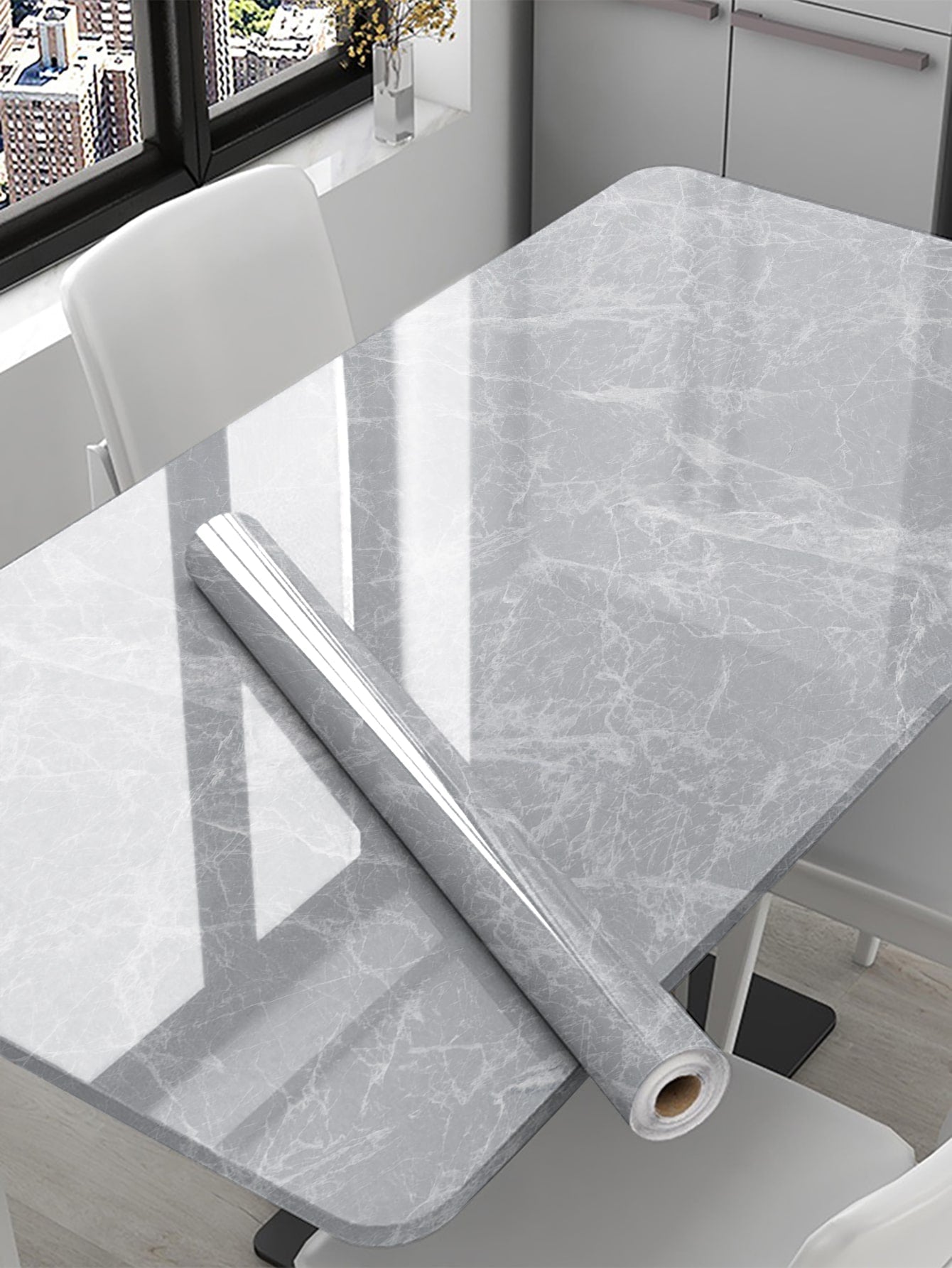 La superficie autoadesiva garantisce un'applicazione rapida e senza residui, mentre il motivo marmo aggiunge profondità e carattere allo spazio.