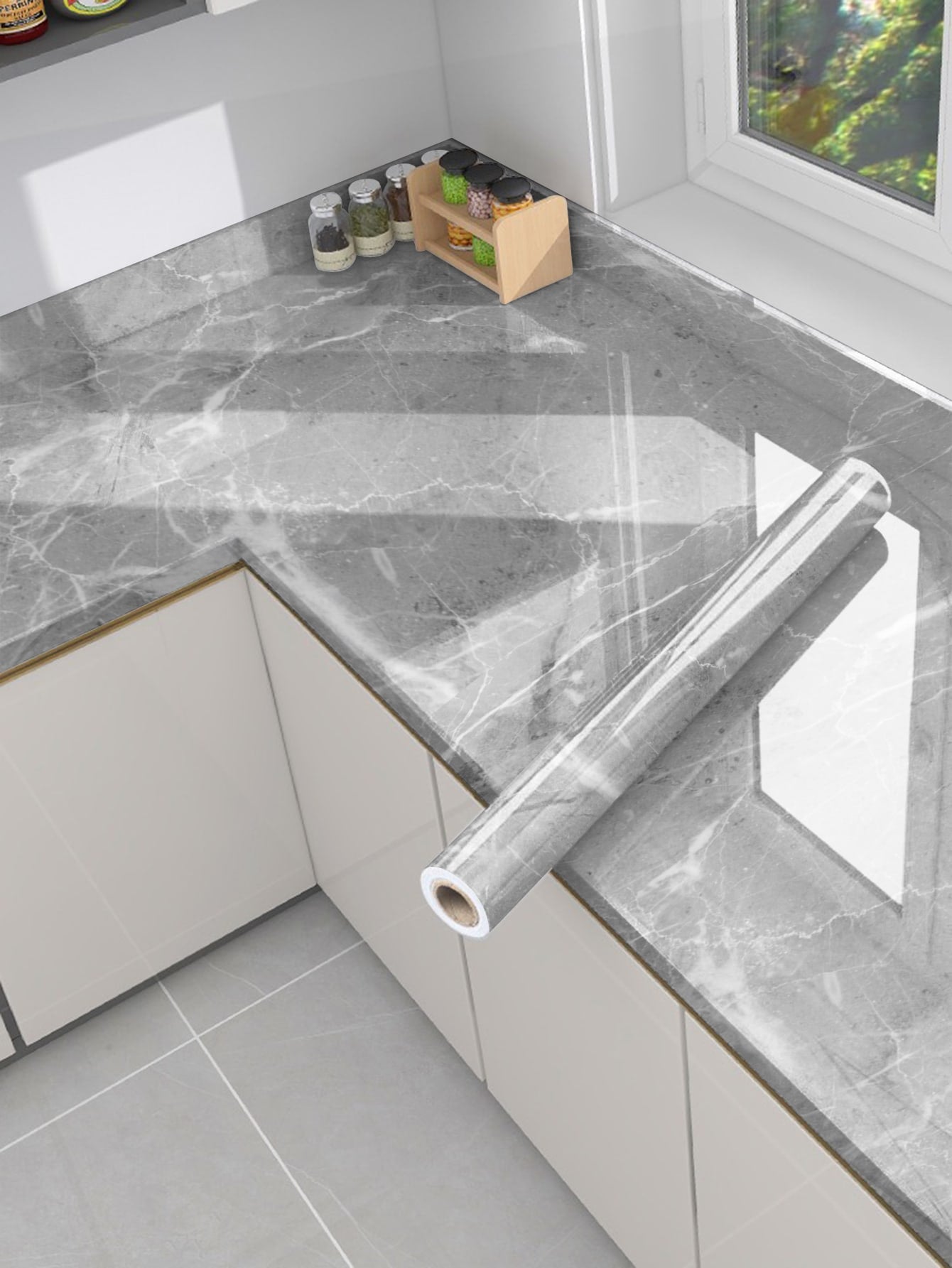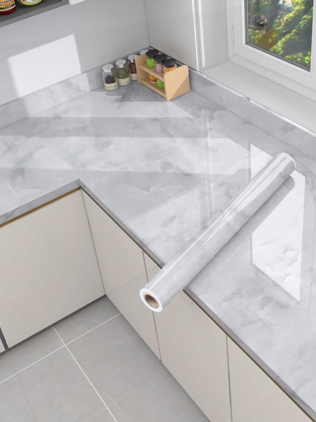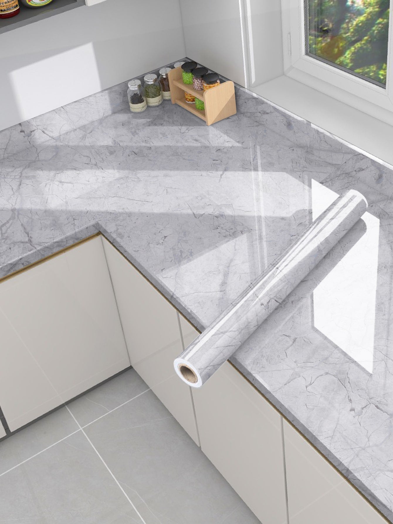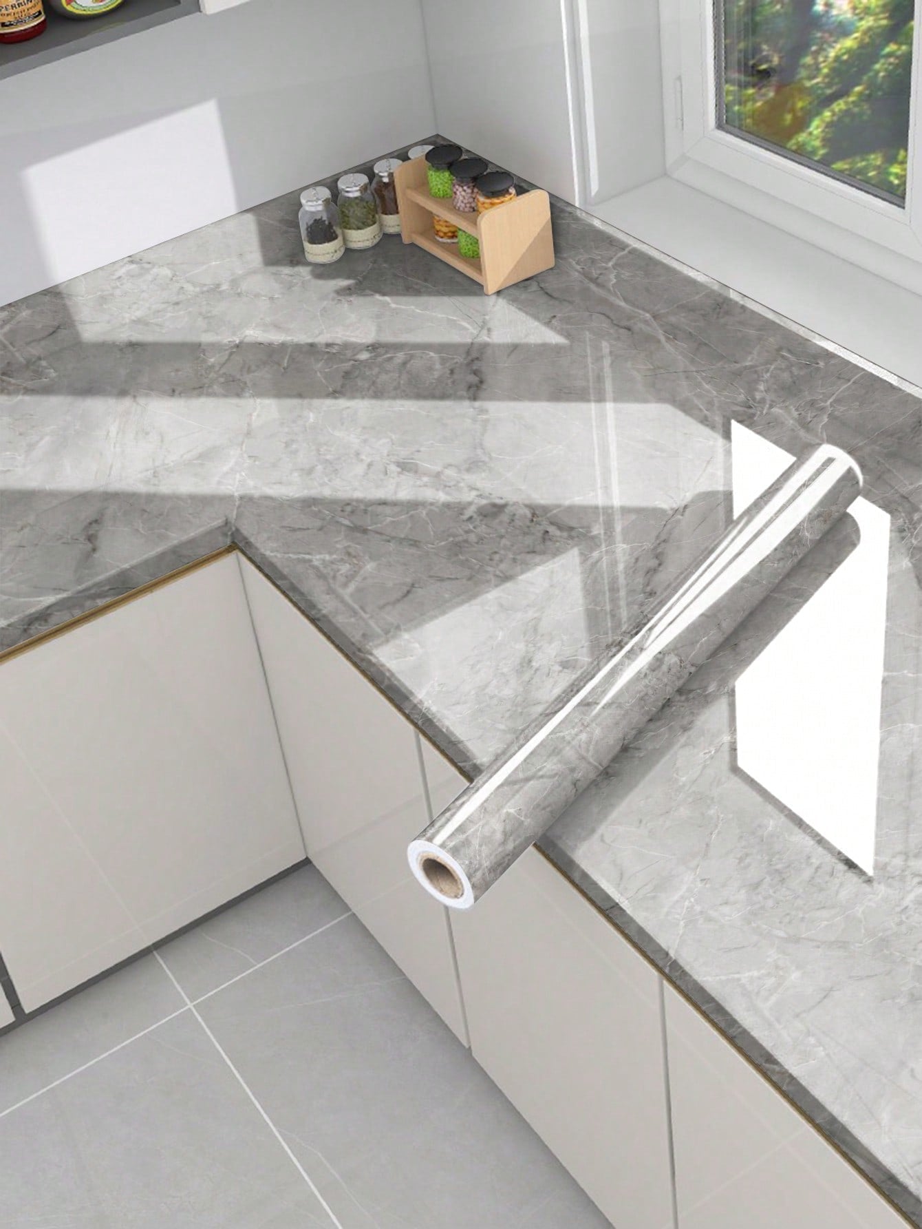 La superficie autoadesiva garantisce un'applicazione rapida e senza residui, mentre il motivo marmo aggiunge profondità e carattere allo spazio.