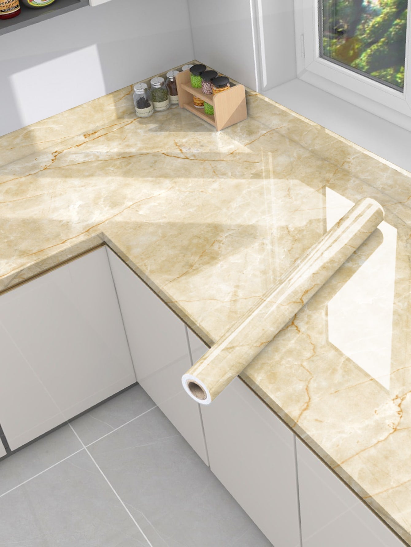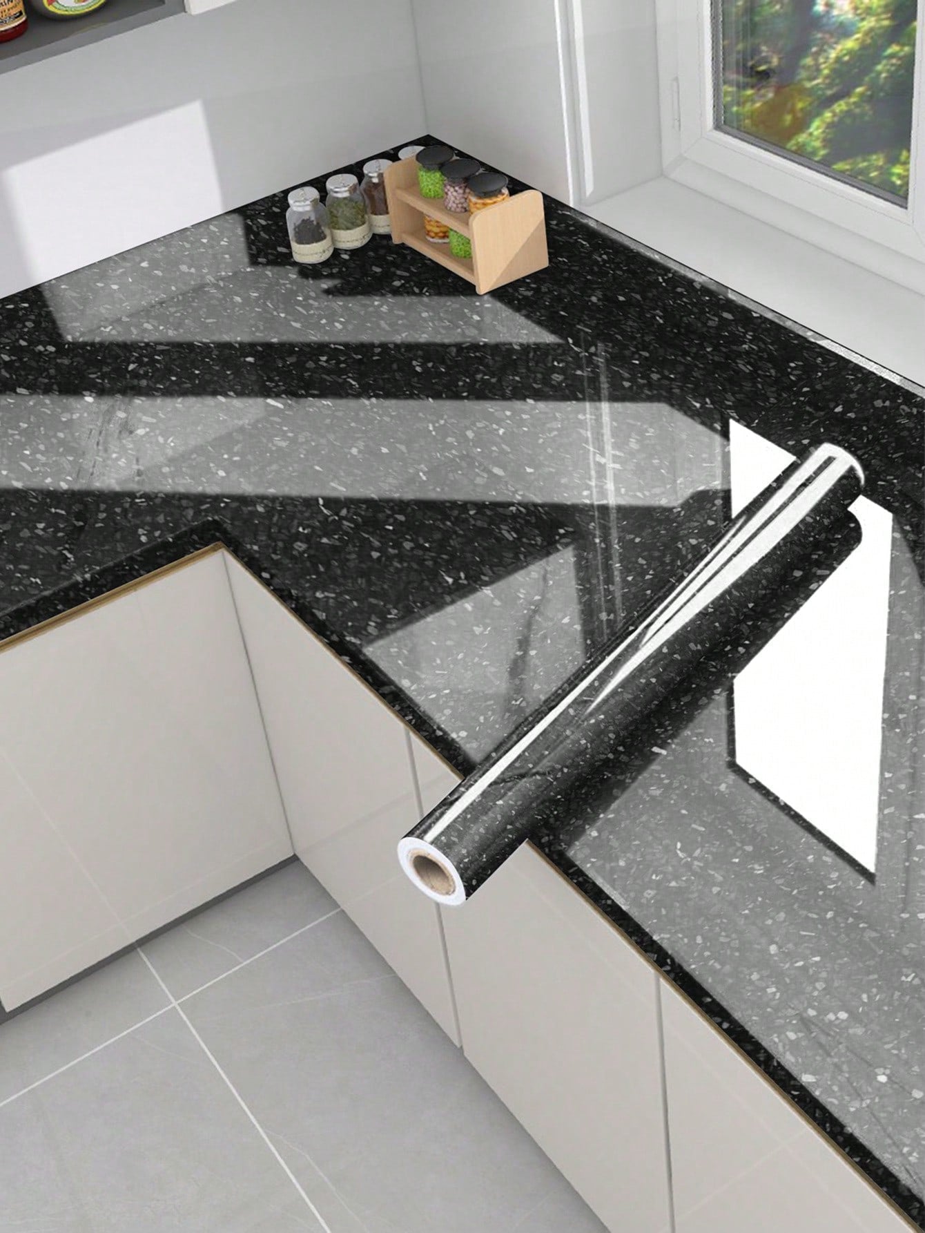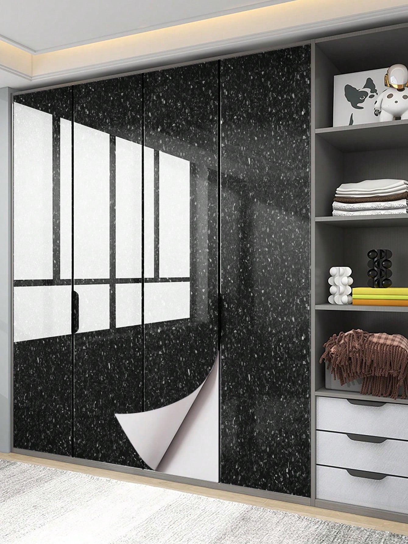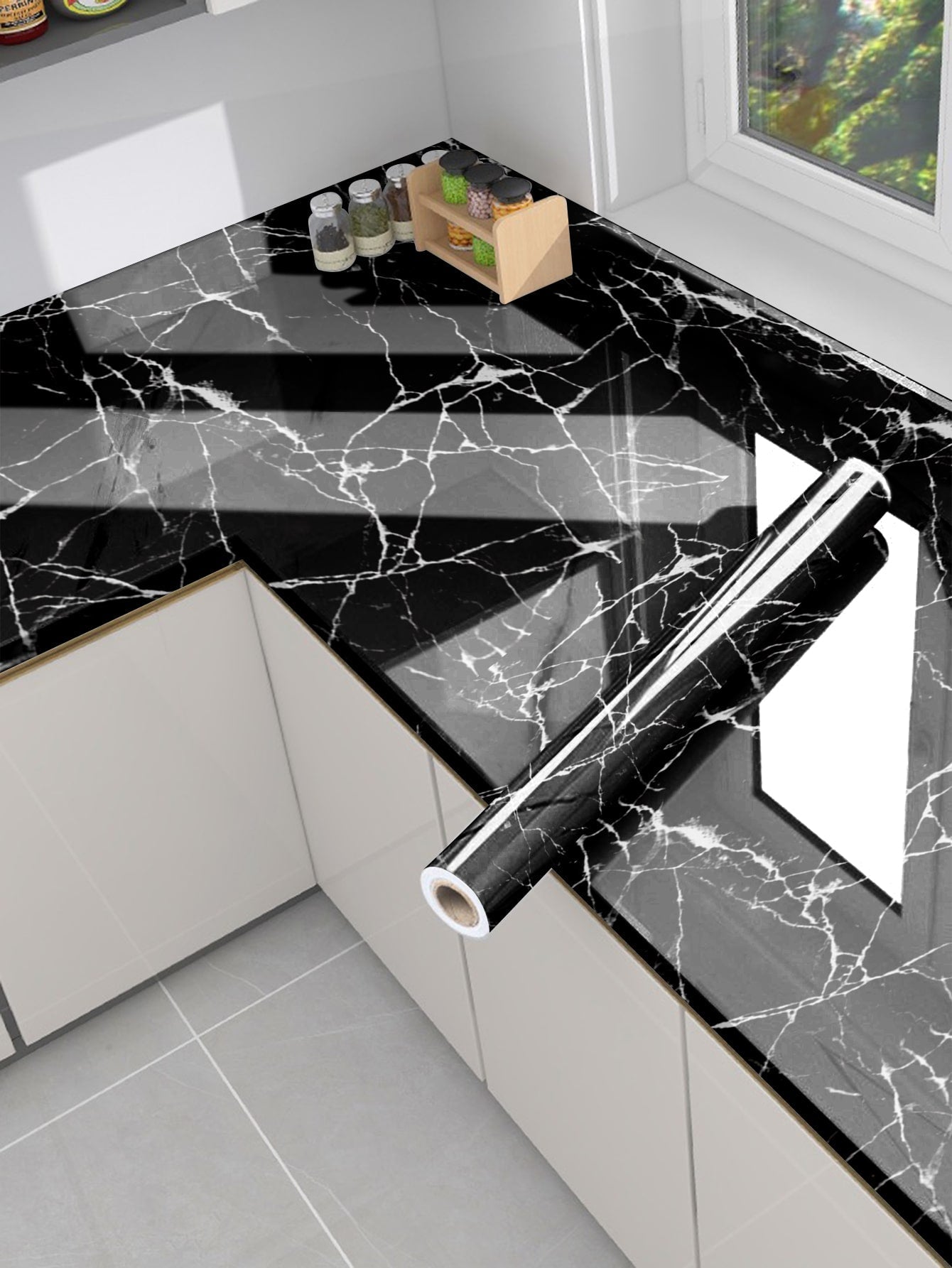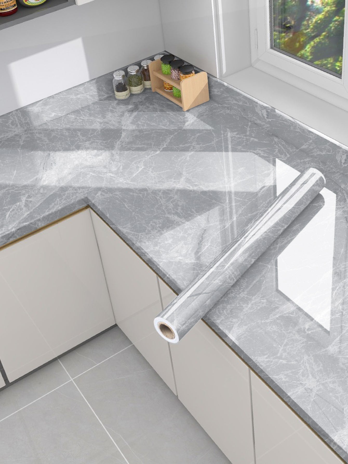 La superficie autoadesiva garantisce un'applicazione rapida e senza residui, mentre il motivo marmo aggiunge profondità e carattere allo spazio.