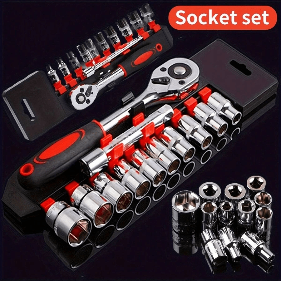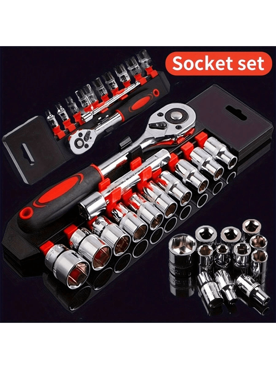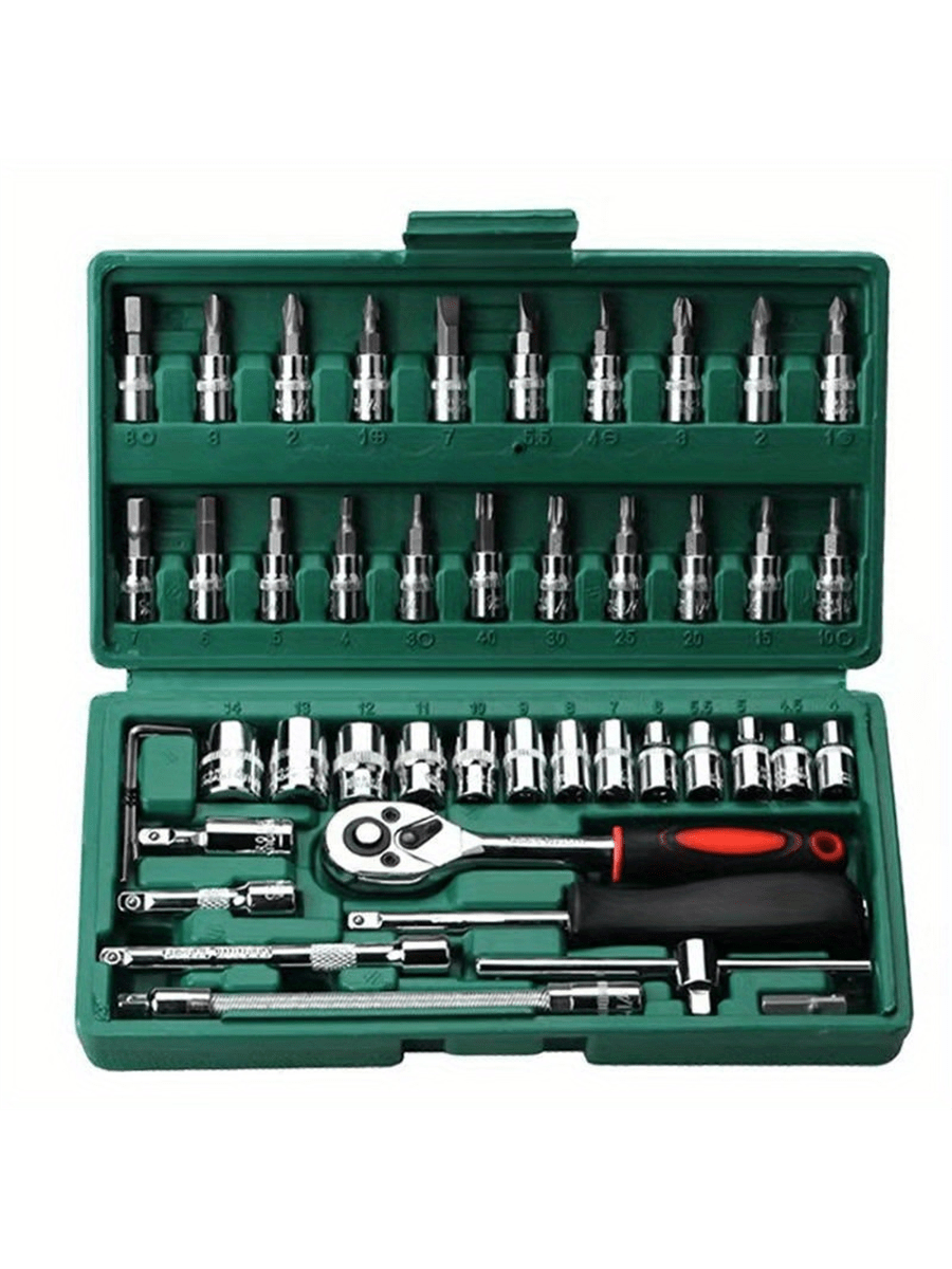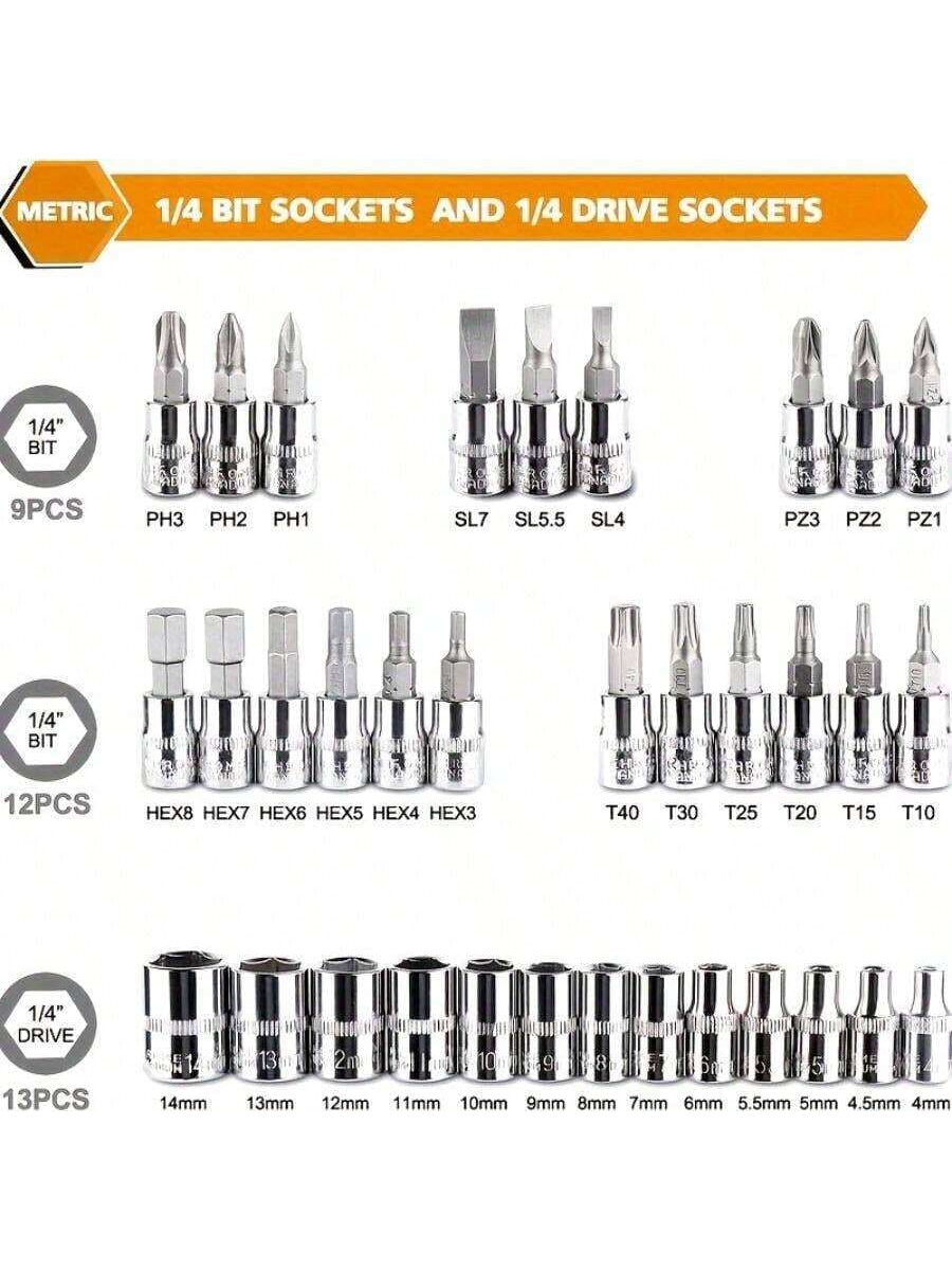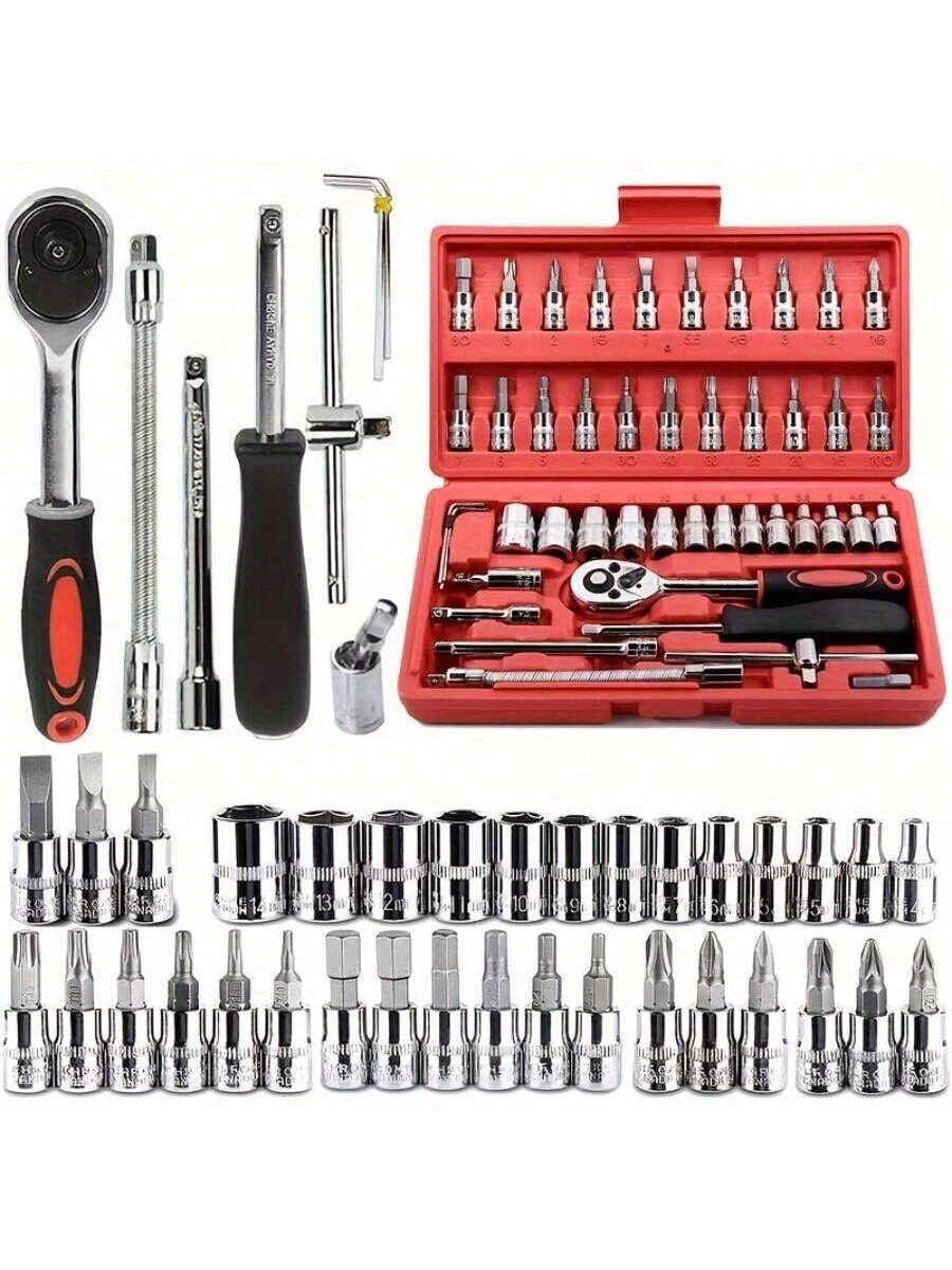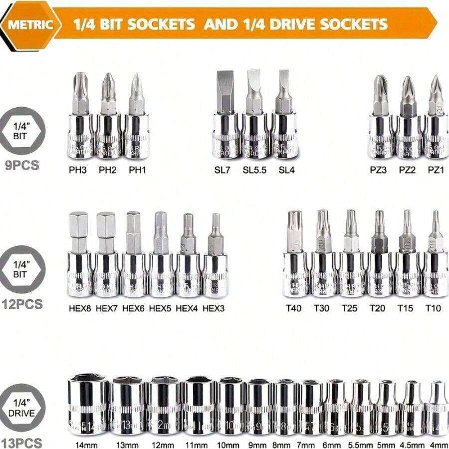 46 pezzi Set di chiavi a cricchetto da 1/4" con bussole metriche, barra di estensione per auto, riparazione bici e uso domestico, con scatola di immagazzinaggio
