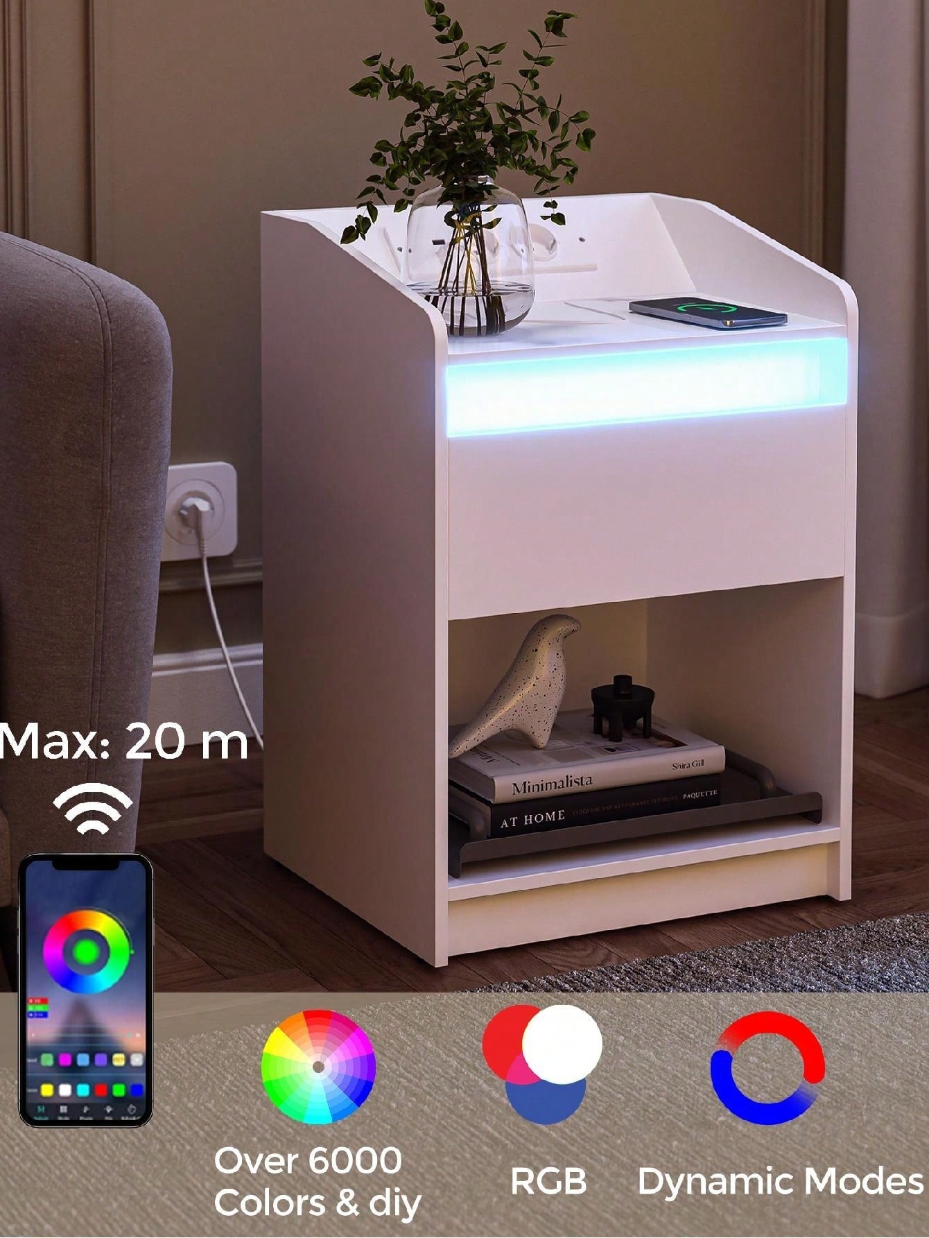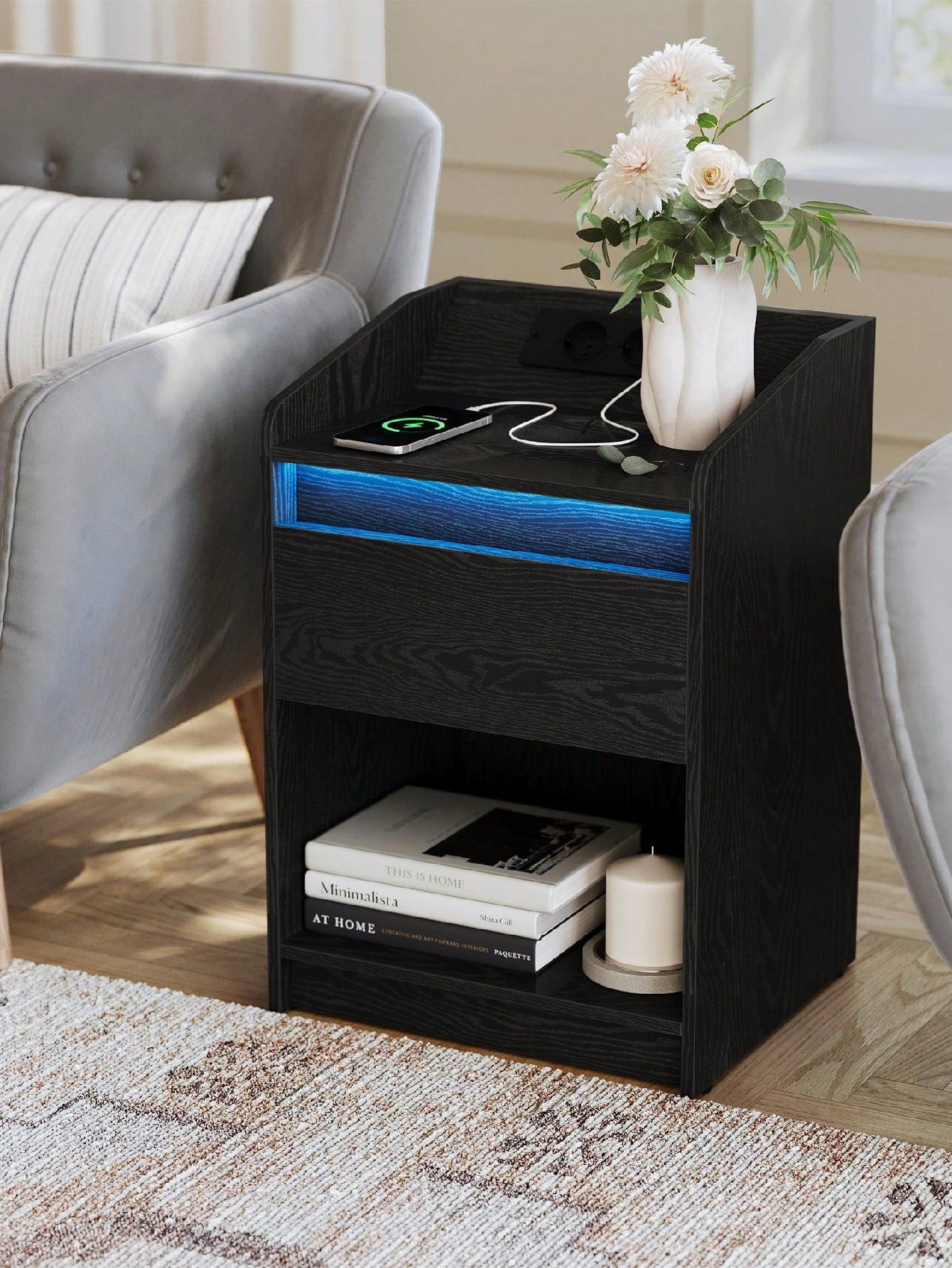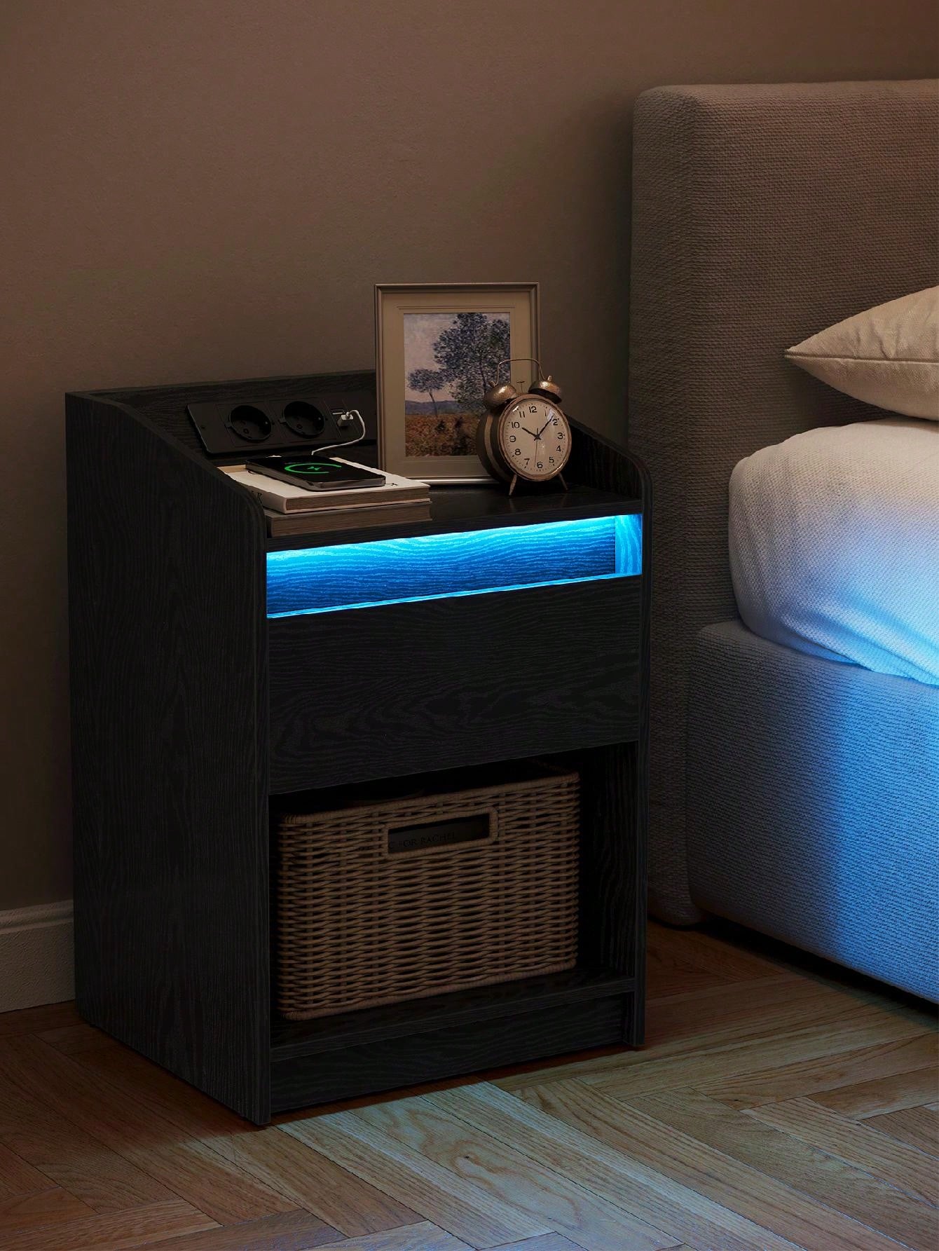 Comodino con luce LED, Tavolino con stazione di ricarica 1 cassetto portaoggetti per camera da letto,