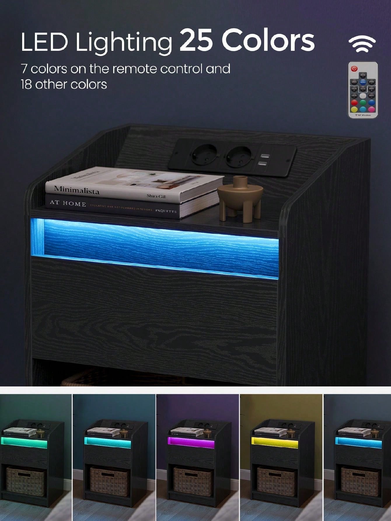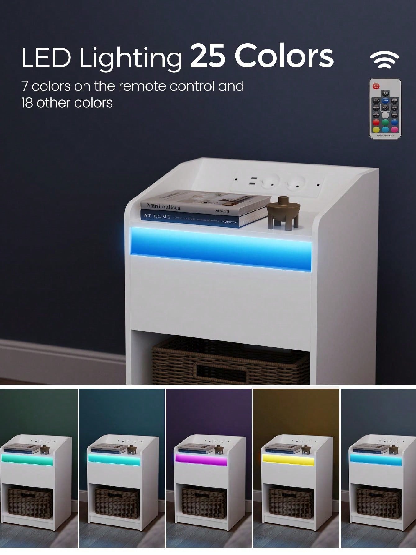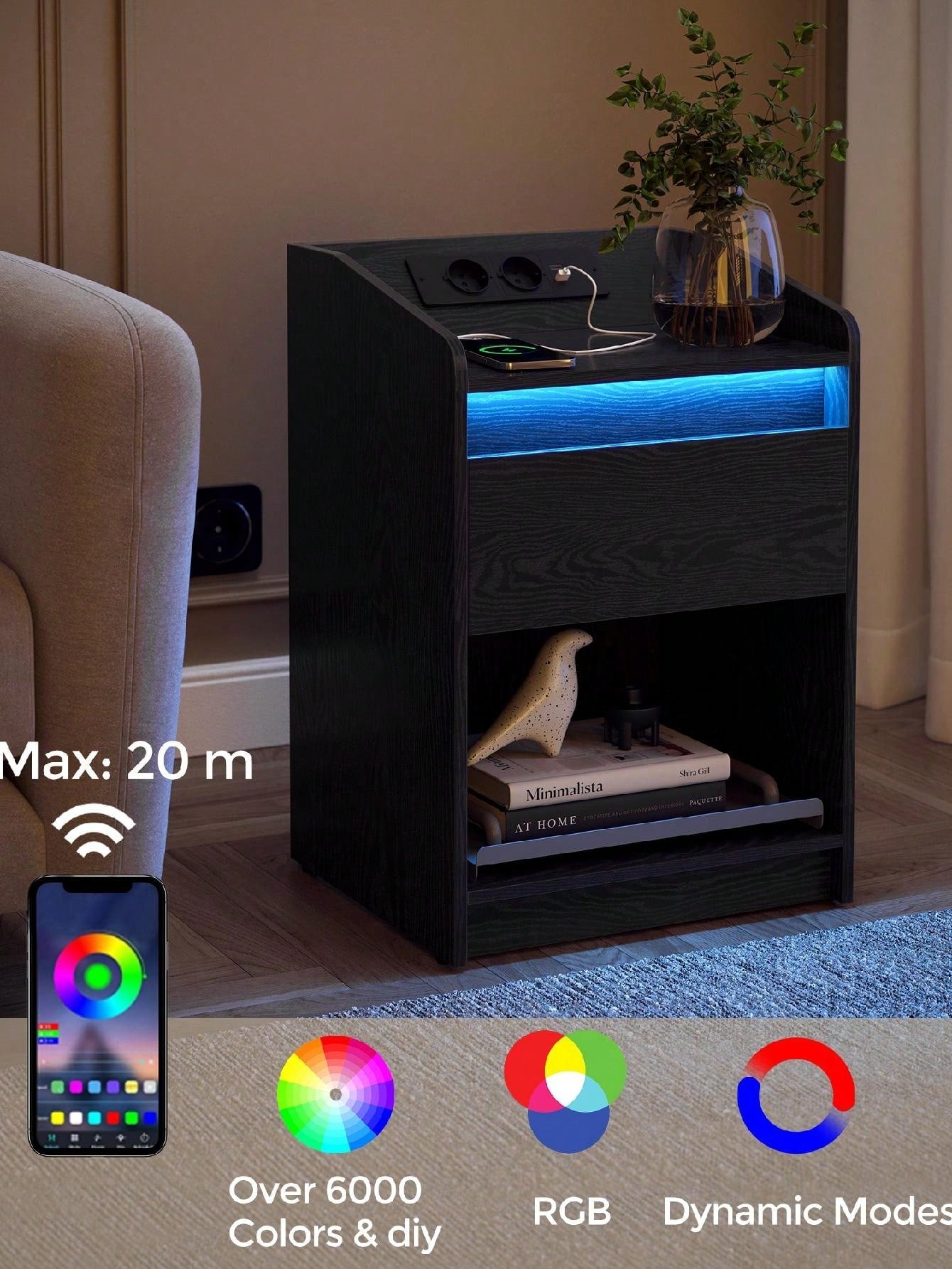 Comodino con luce LED, Tavolino con stazione di ricarica 1 cassetto portaoggetti per camera da letto,