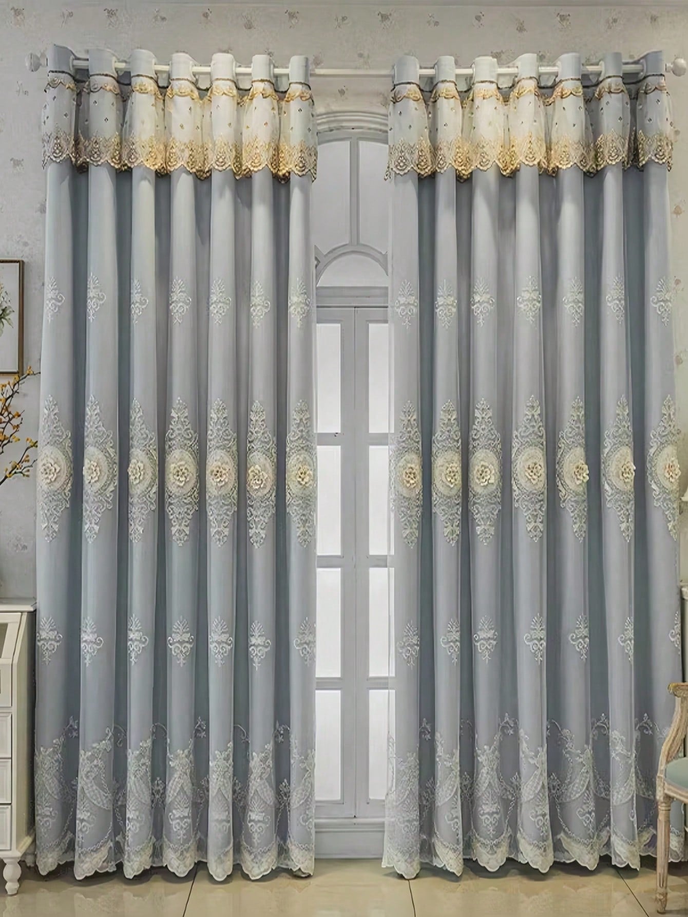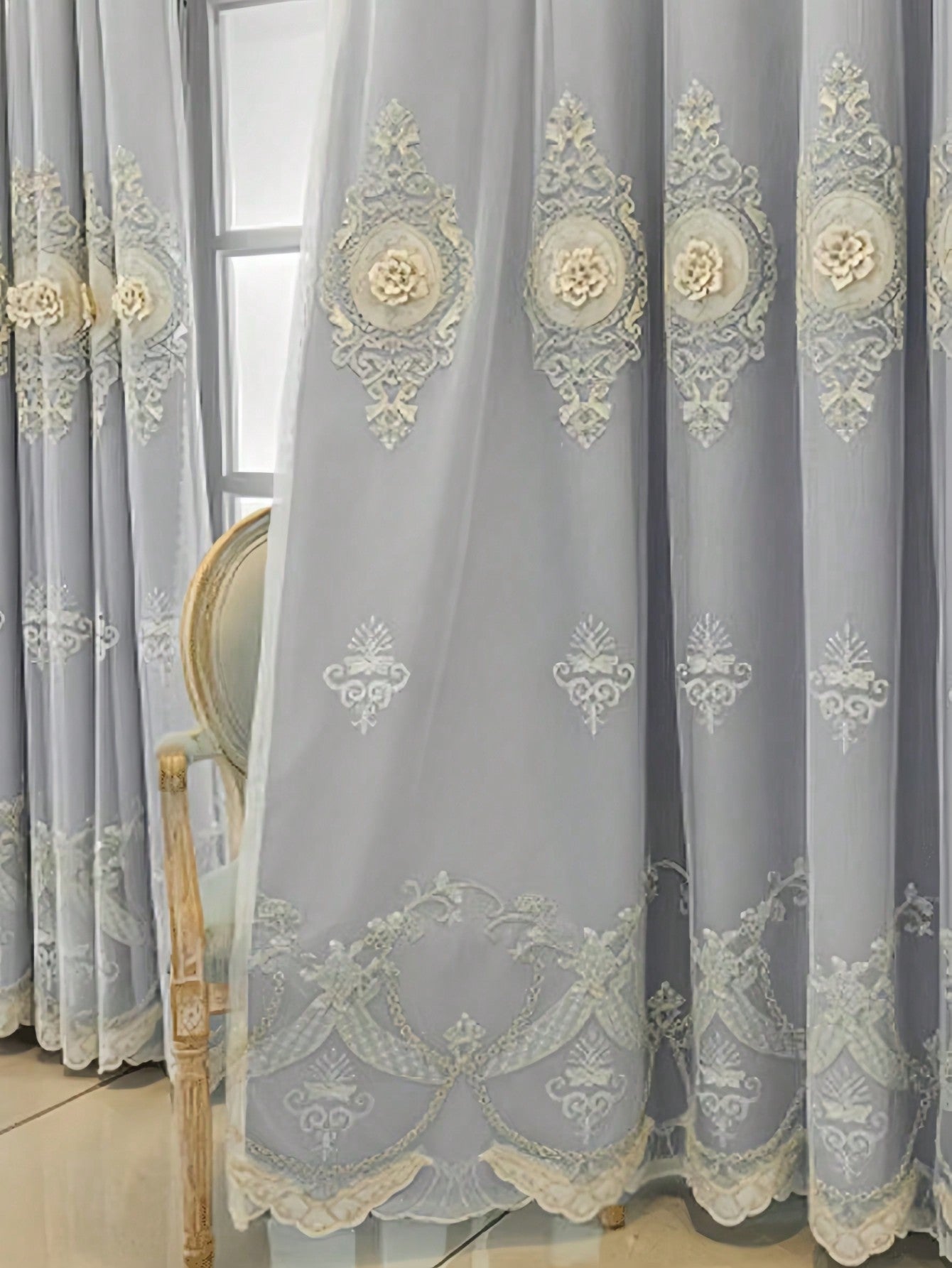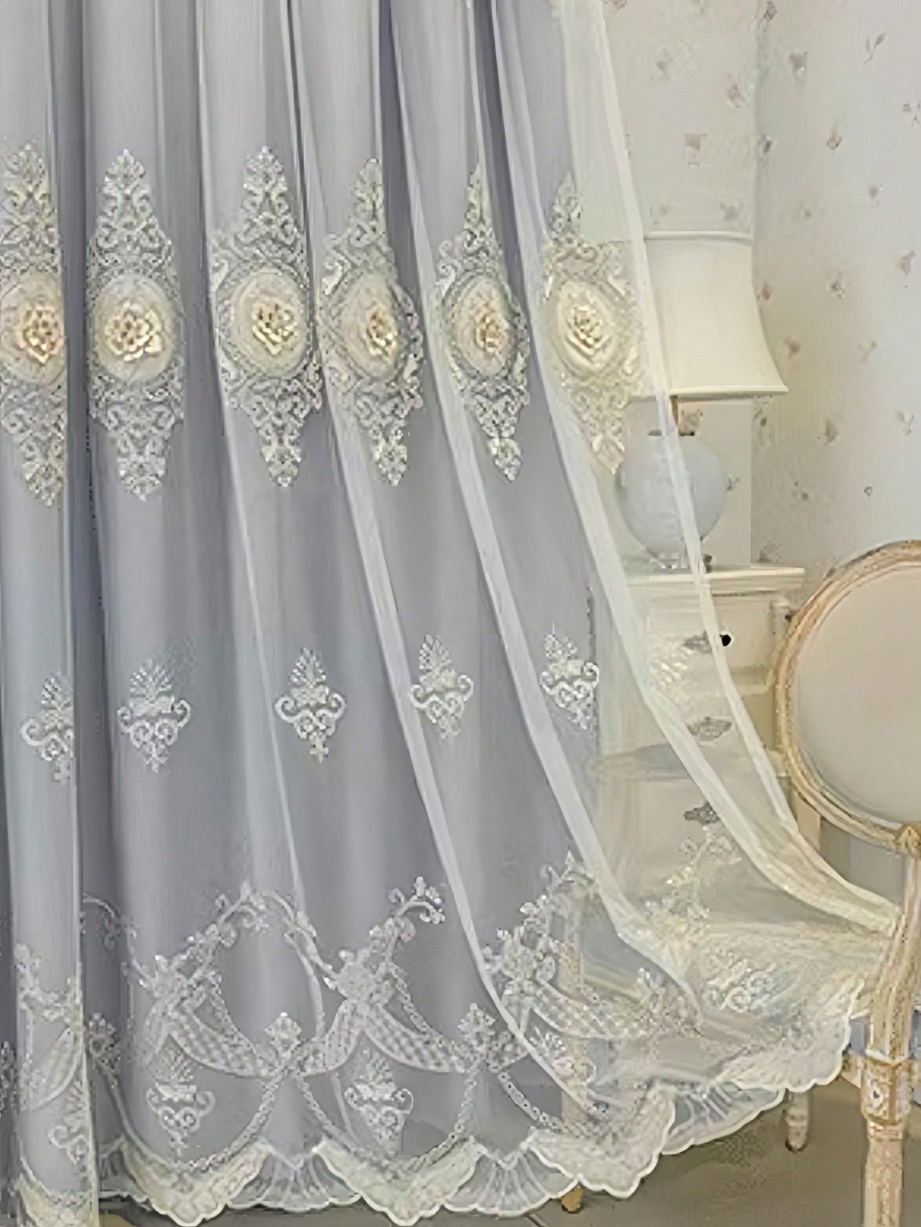 Lussuosa tenda a doppio strato con drappeggi trasparenti ricamati per salotto