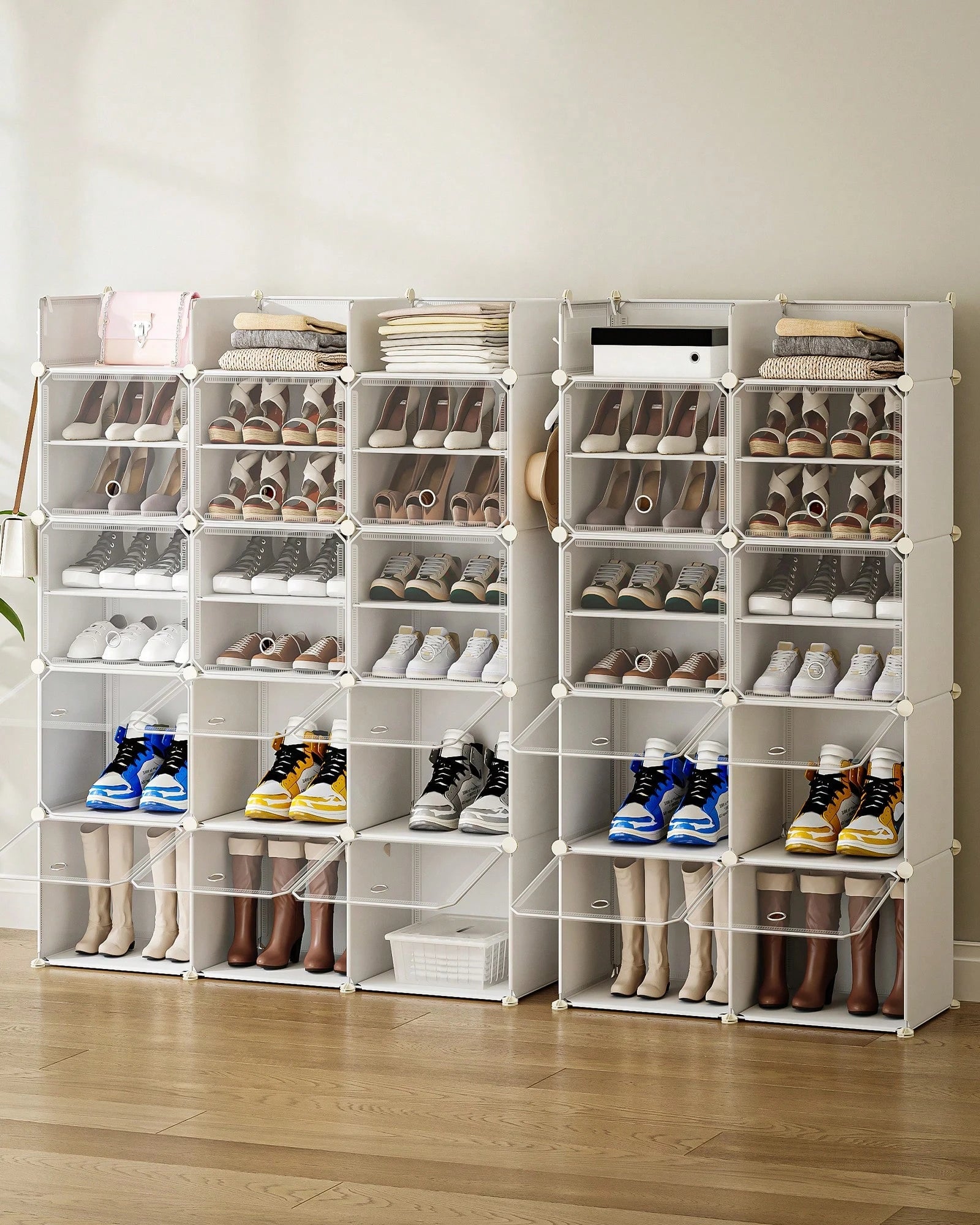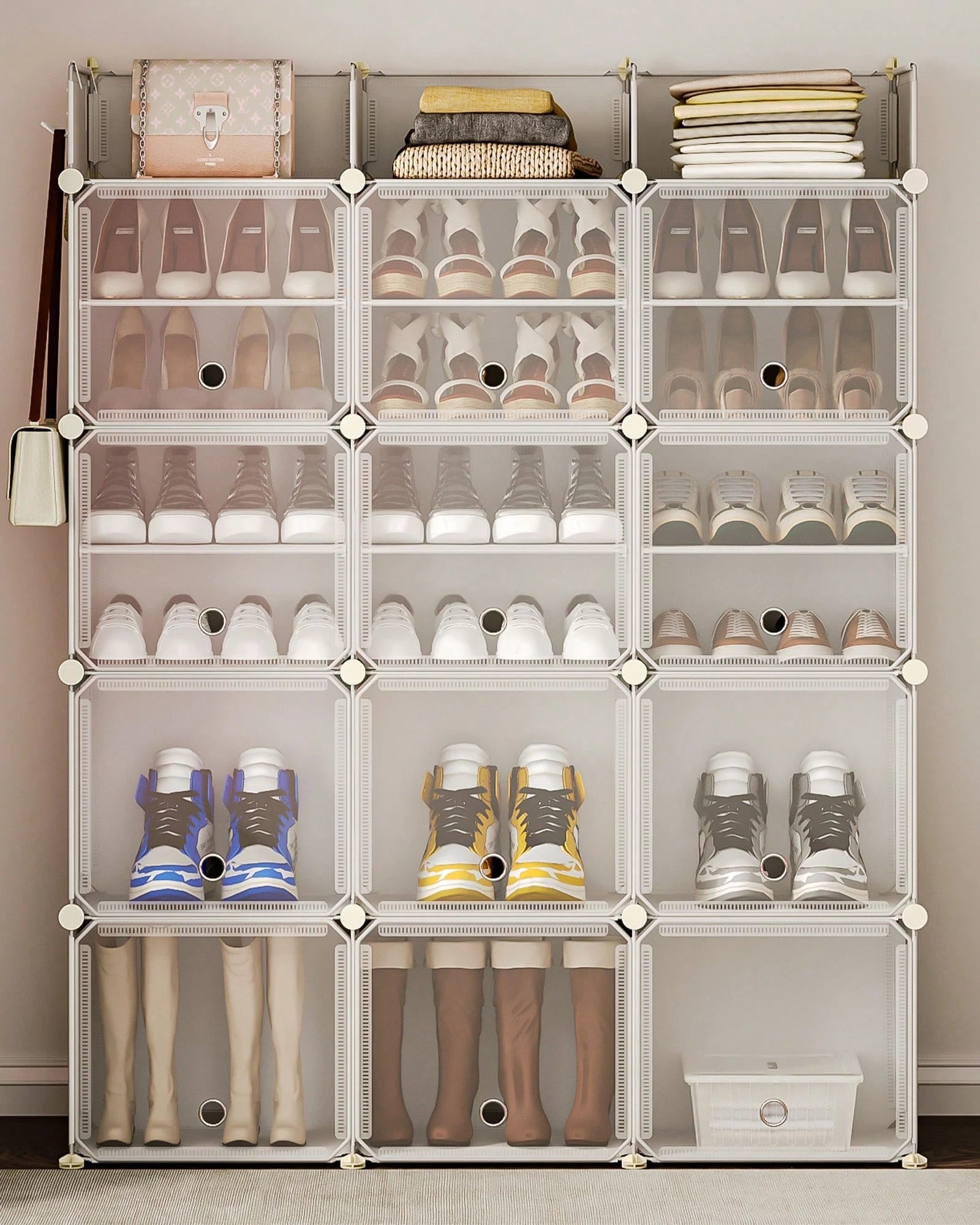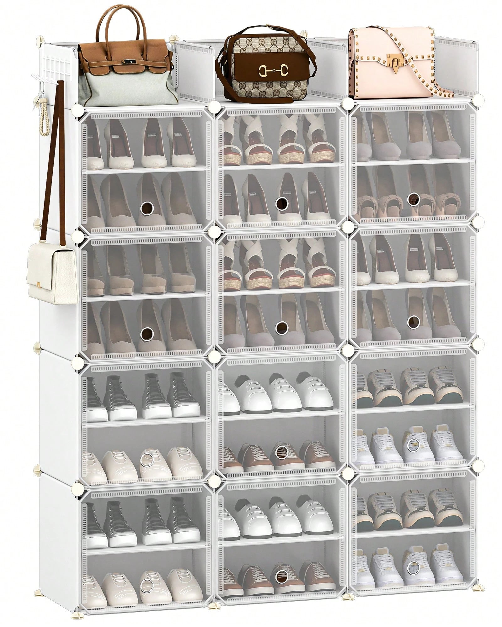 Dotato di 12 ripiani spaziosi, offre ampia capacità di stoccaggio per mantenere l'ordine di numerose paia di scarpe.