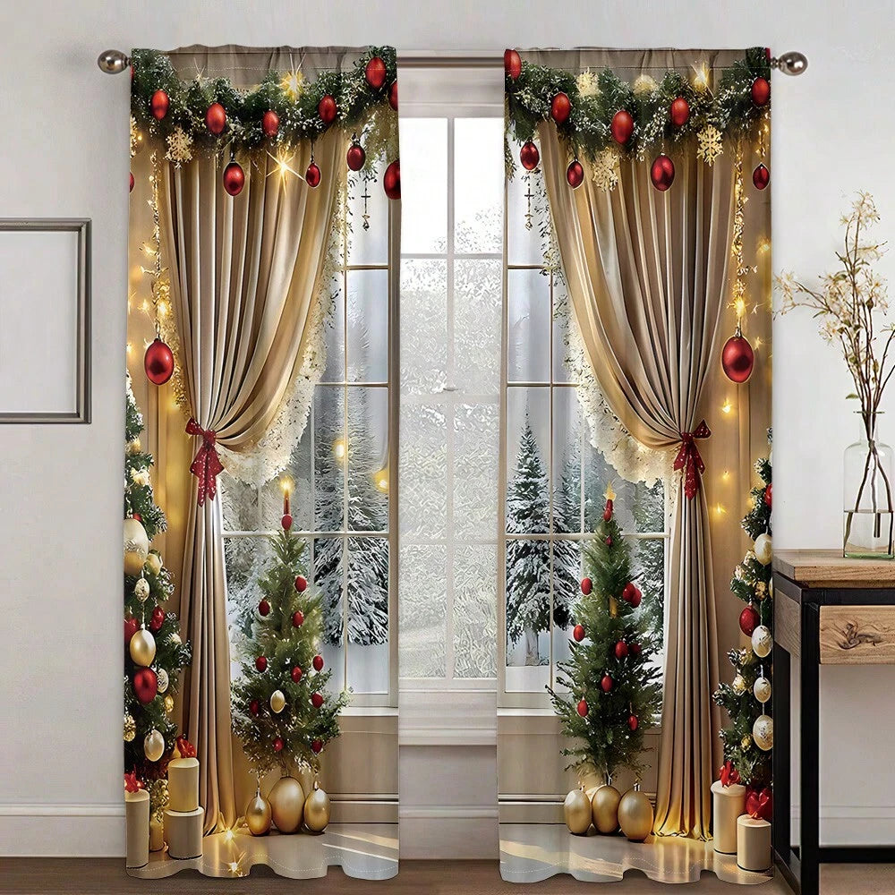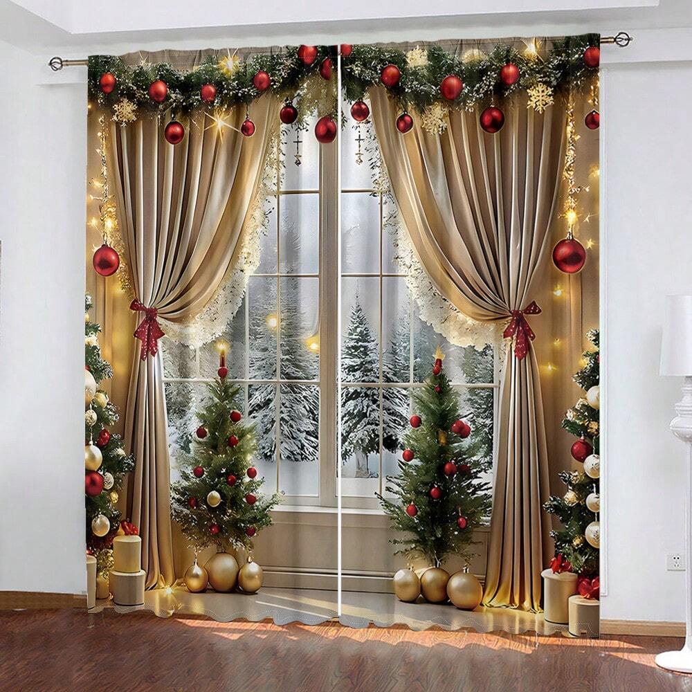 Set da 2 pezzi Tende di Lusso Natalizie con decorazioni di Palline e Alberi di Natale Luccicanti