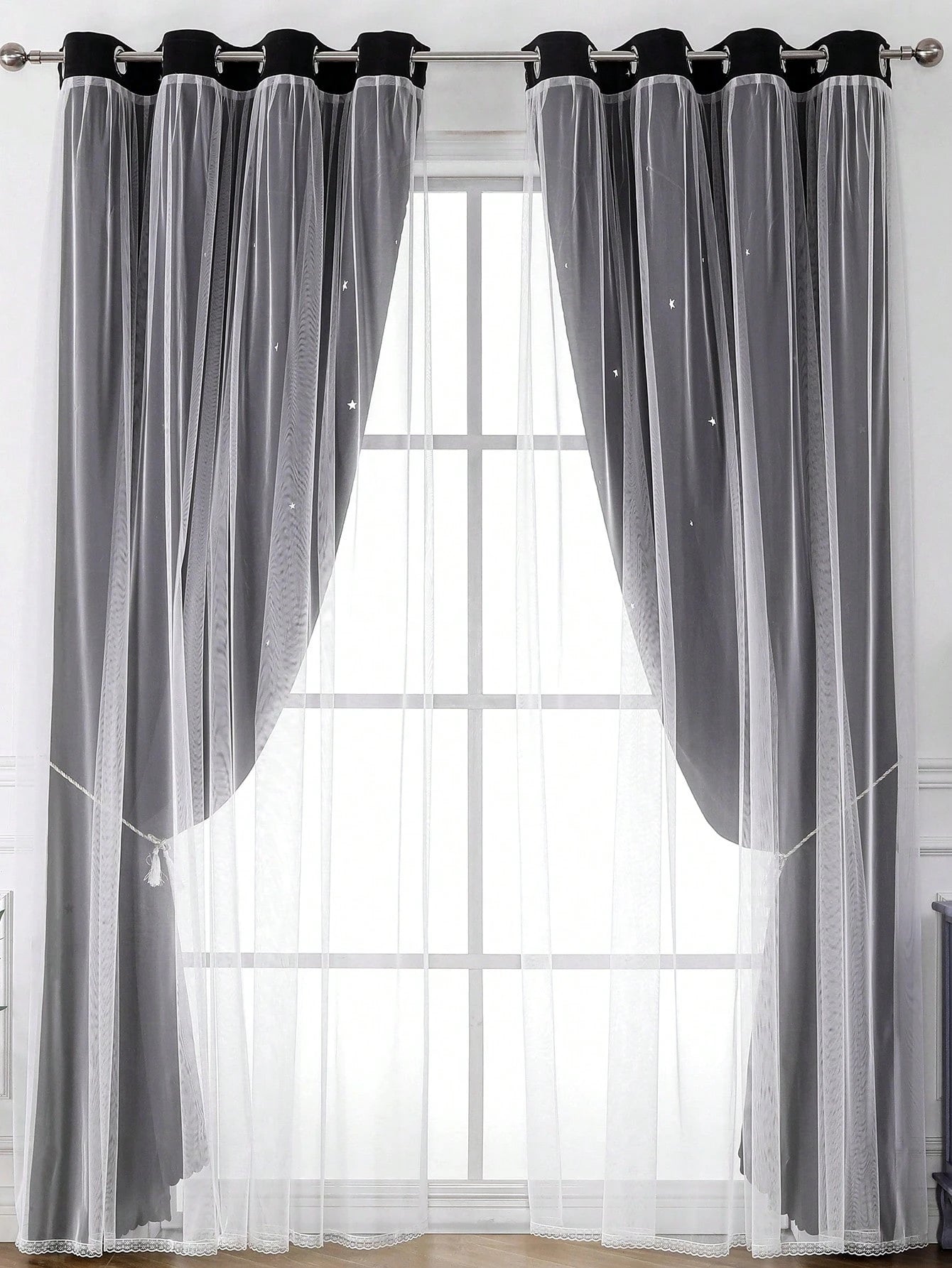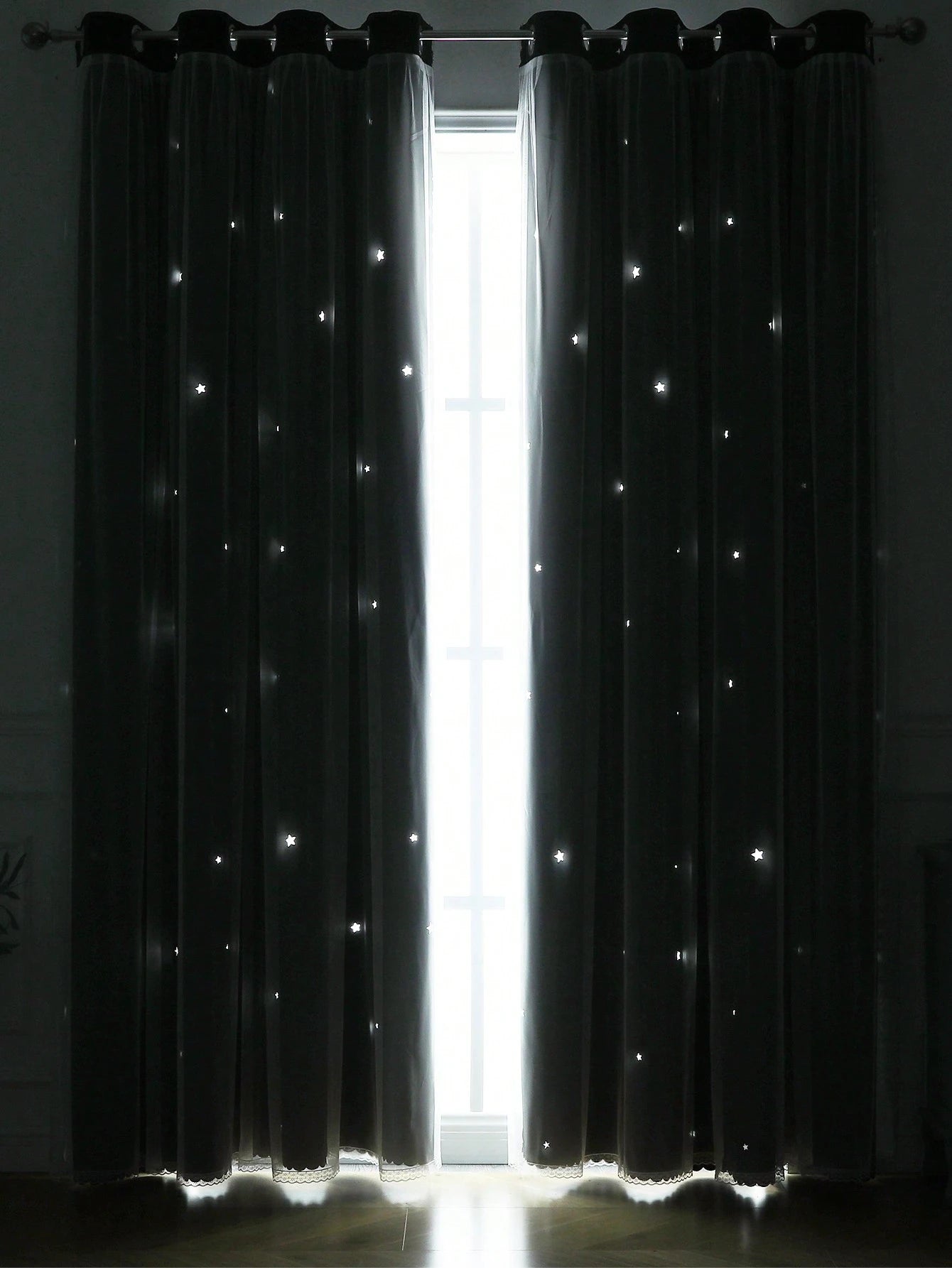 Trasforma il tuo spazio con questa elegante tenda nera a motivo stellato.