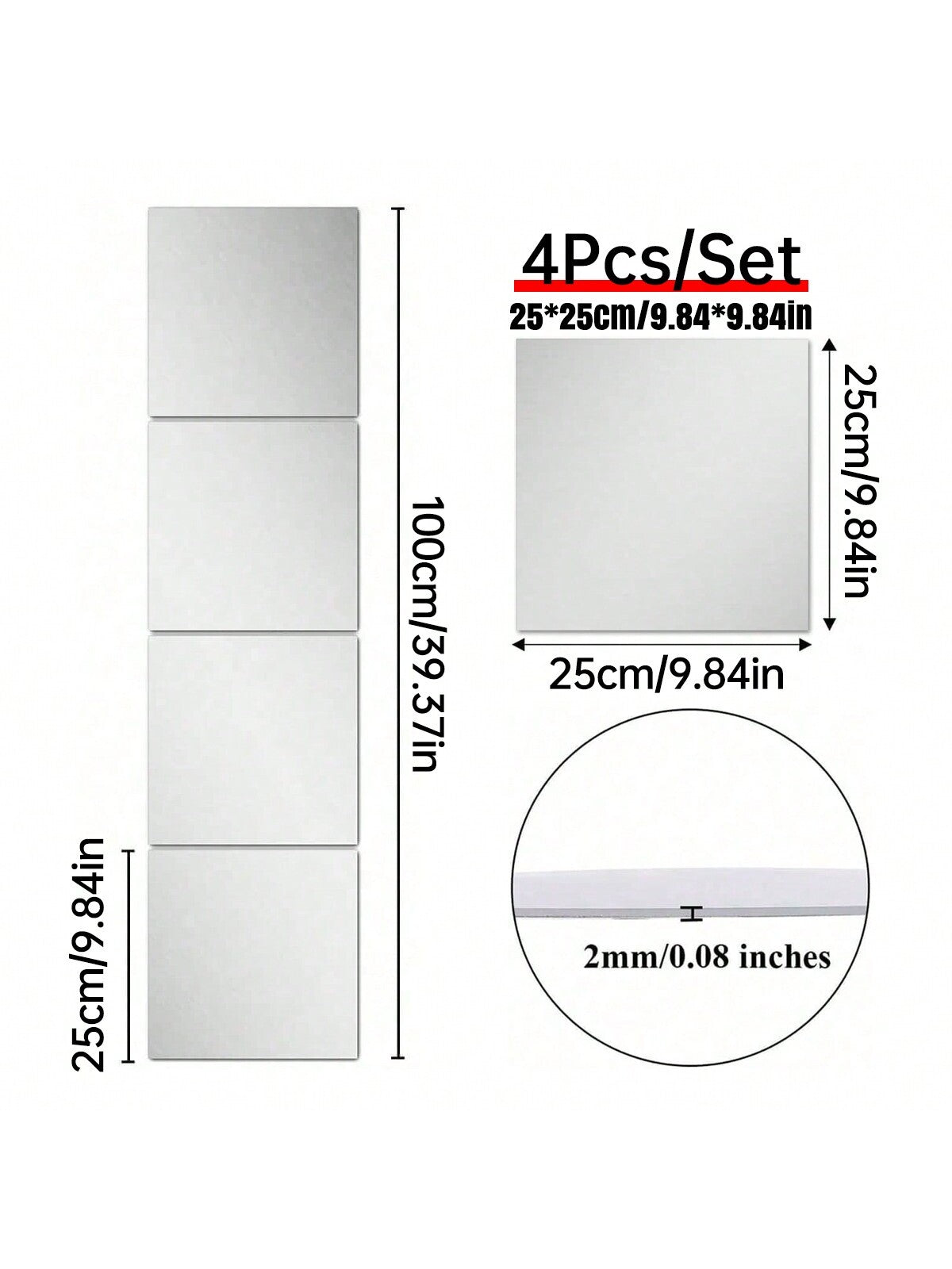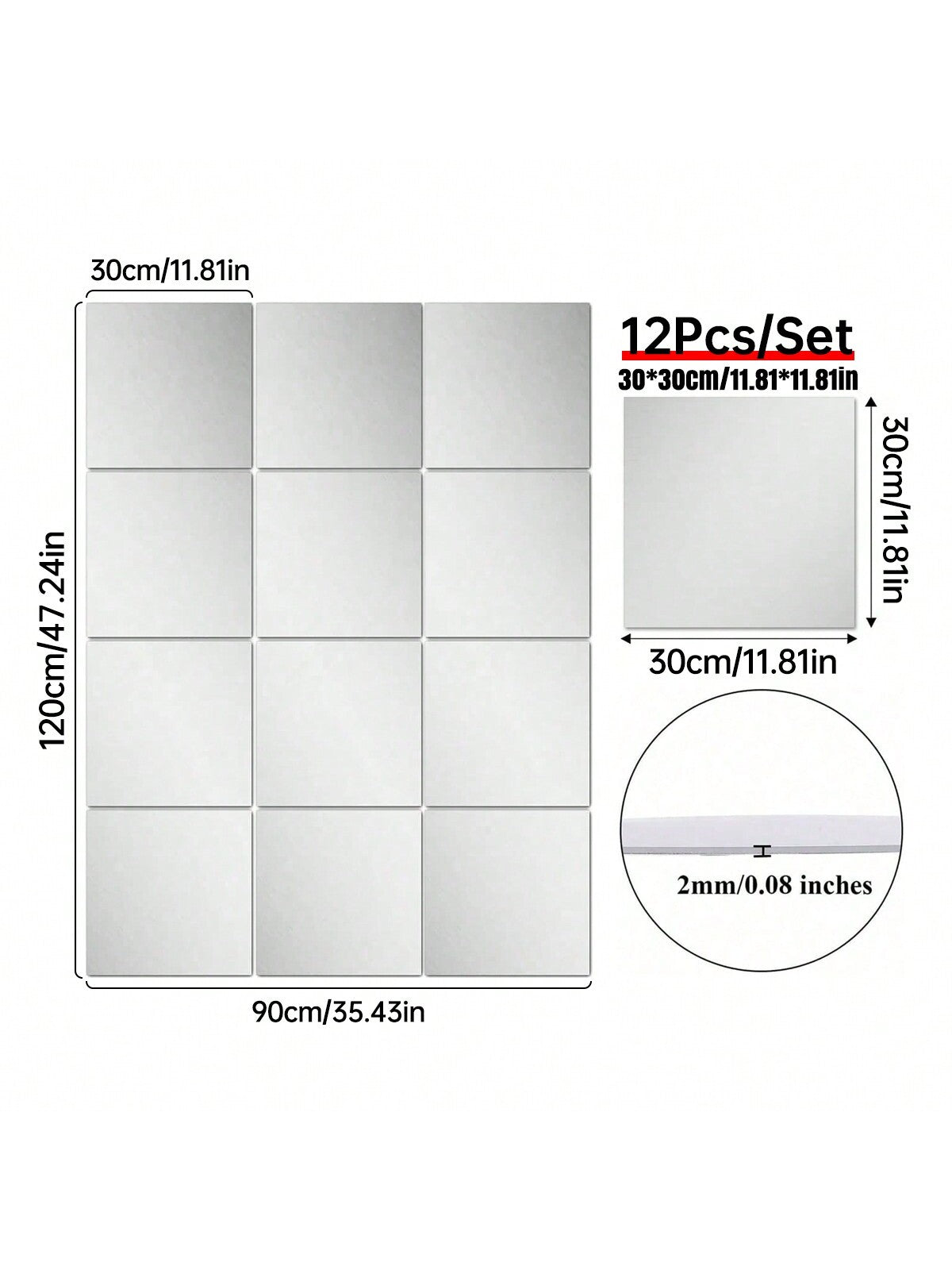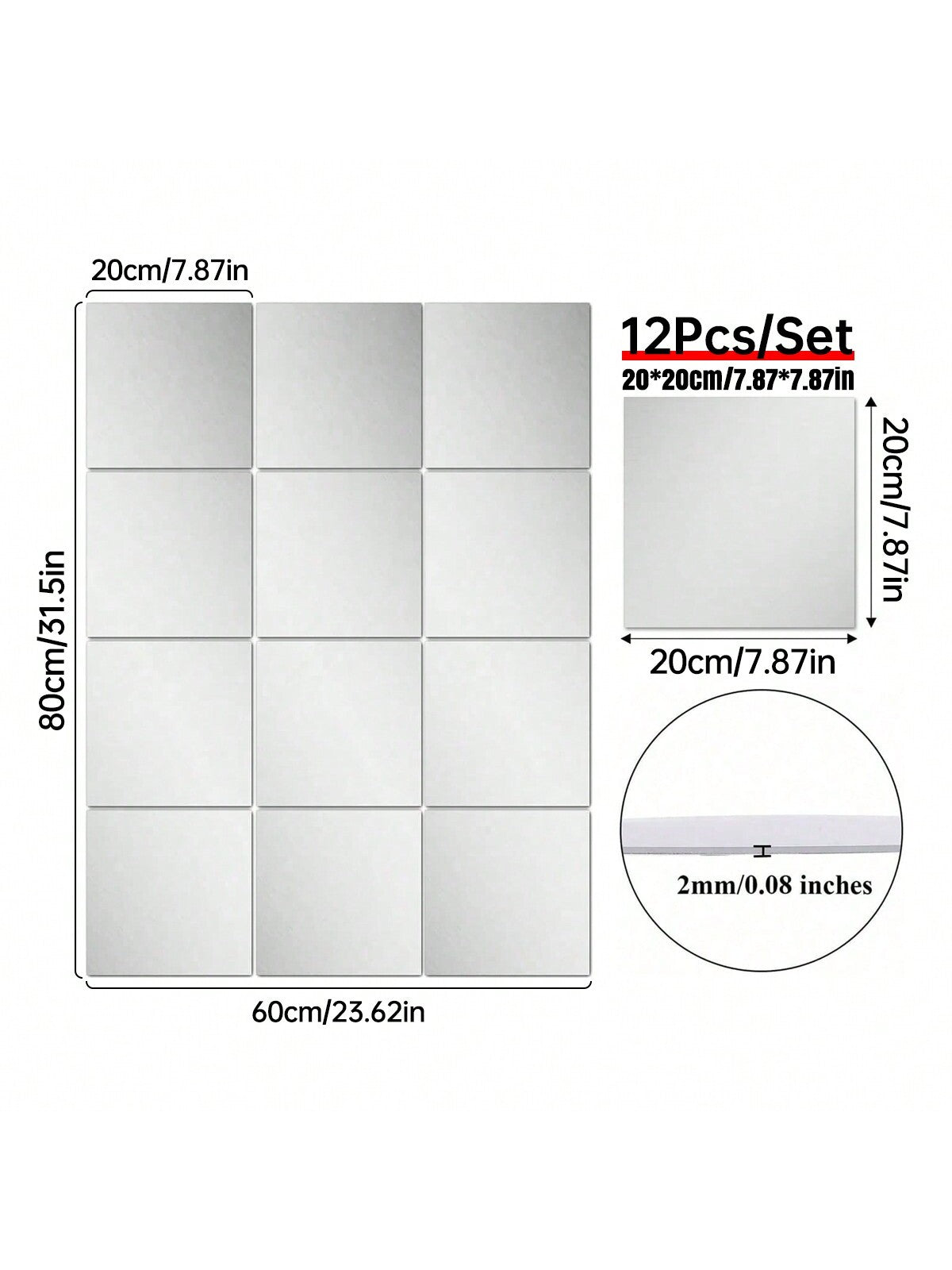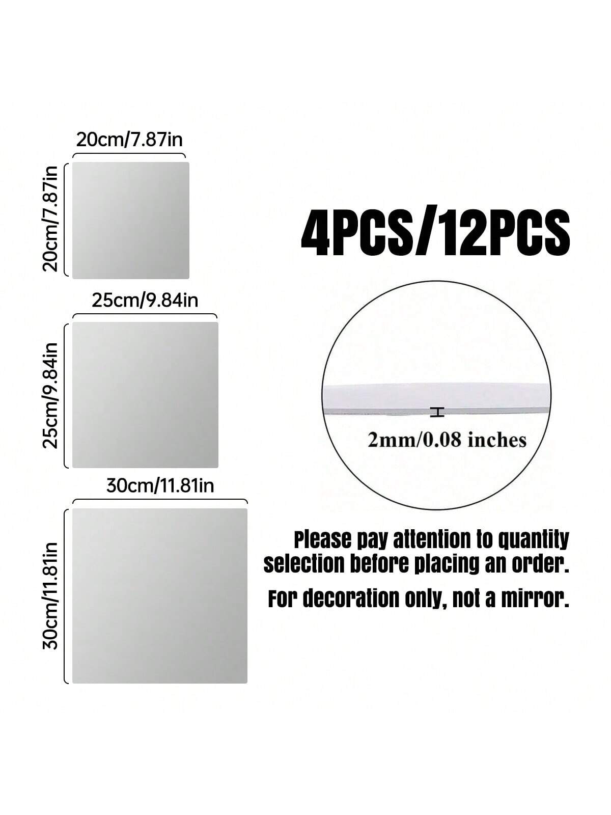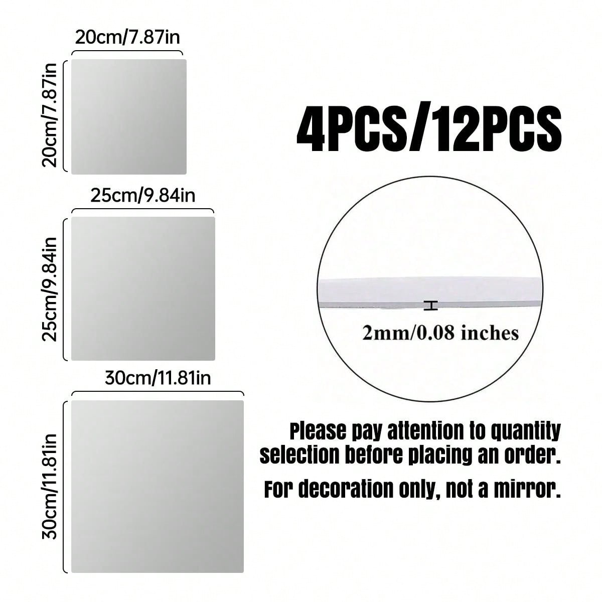 12 pezzi Specchi da parete in acrilico 12"X 12", Adesivi per specchi da parete, Ideale per la decorazione del bagno, Decorazione camera da letto per ragazze Colore: 2 mm Tessuto: PMMA Tipo di motivo: Colore unico Misure del prodotto in cm : Misure Altezza Larghezza Lunghezza Quadrato-20*20 0.2 20 20...