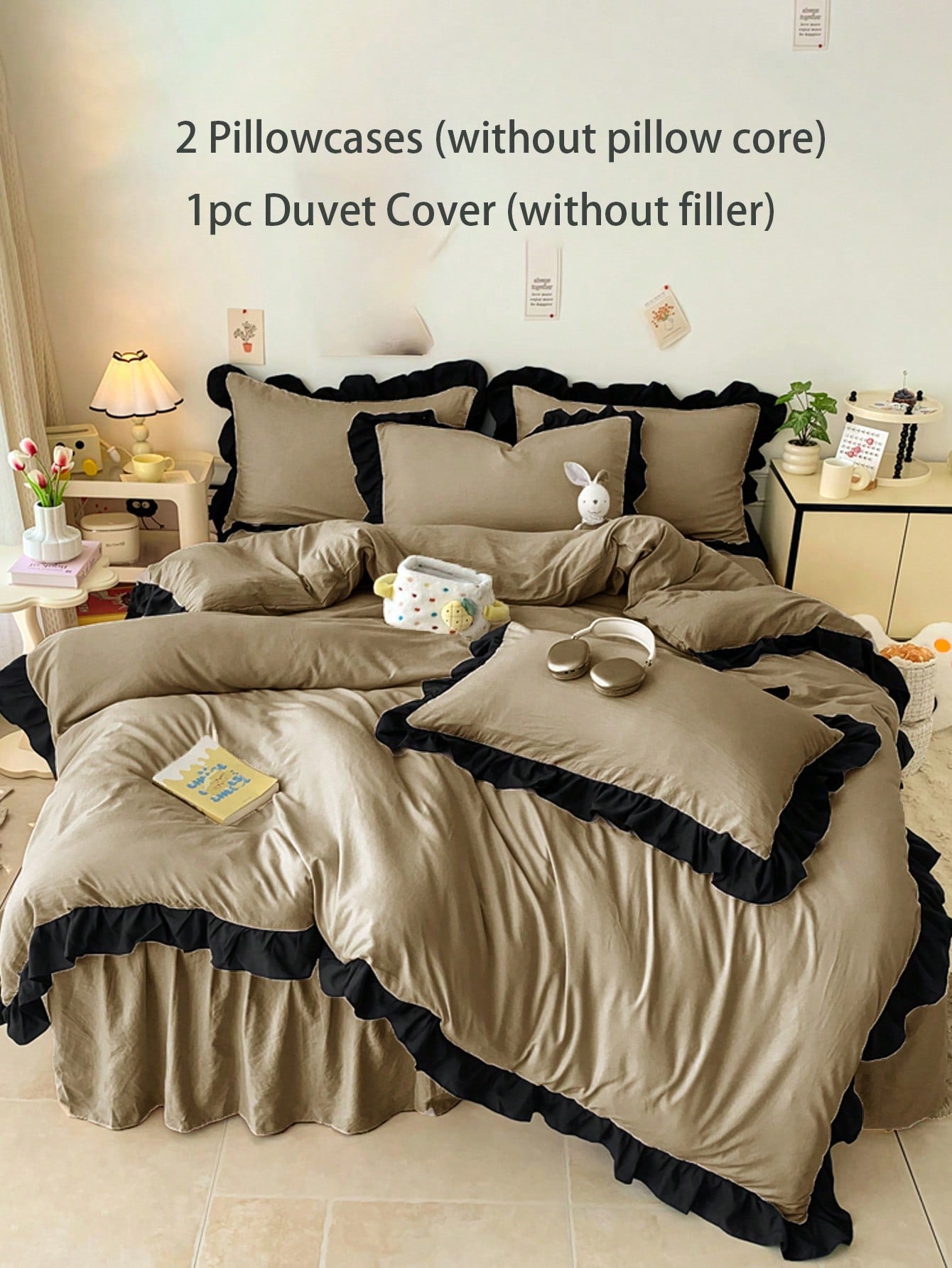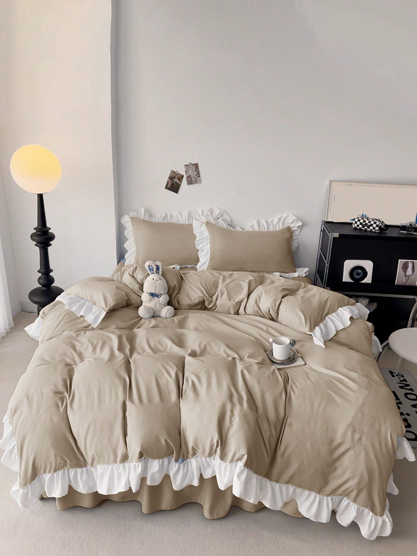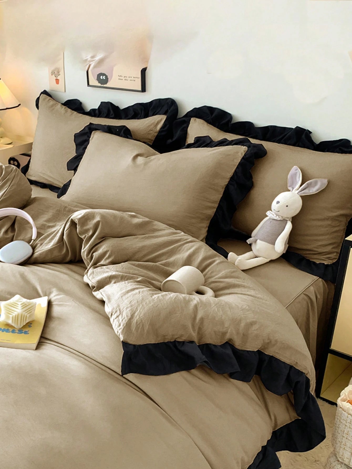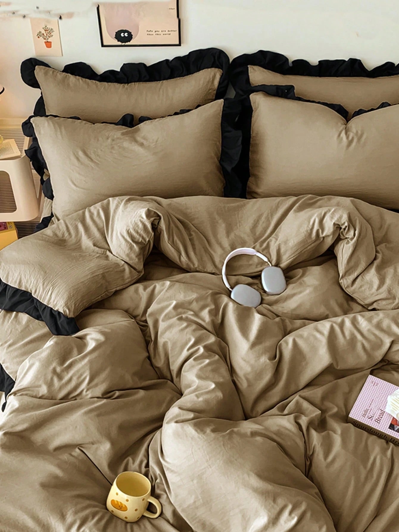 Set di biancheria da letto in tinta caffè scuro con volant, morbido e confortevole