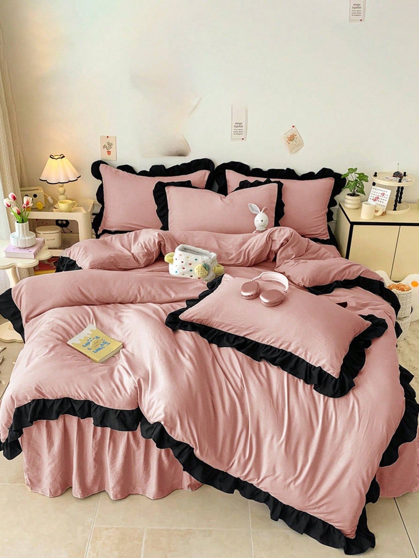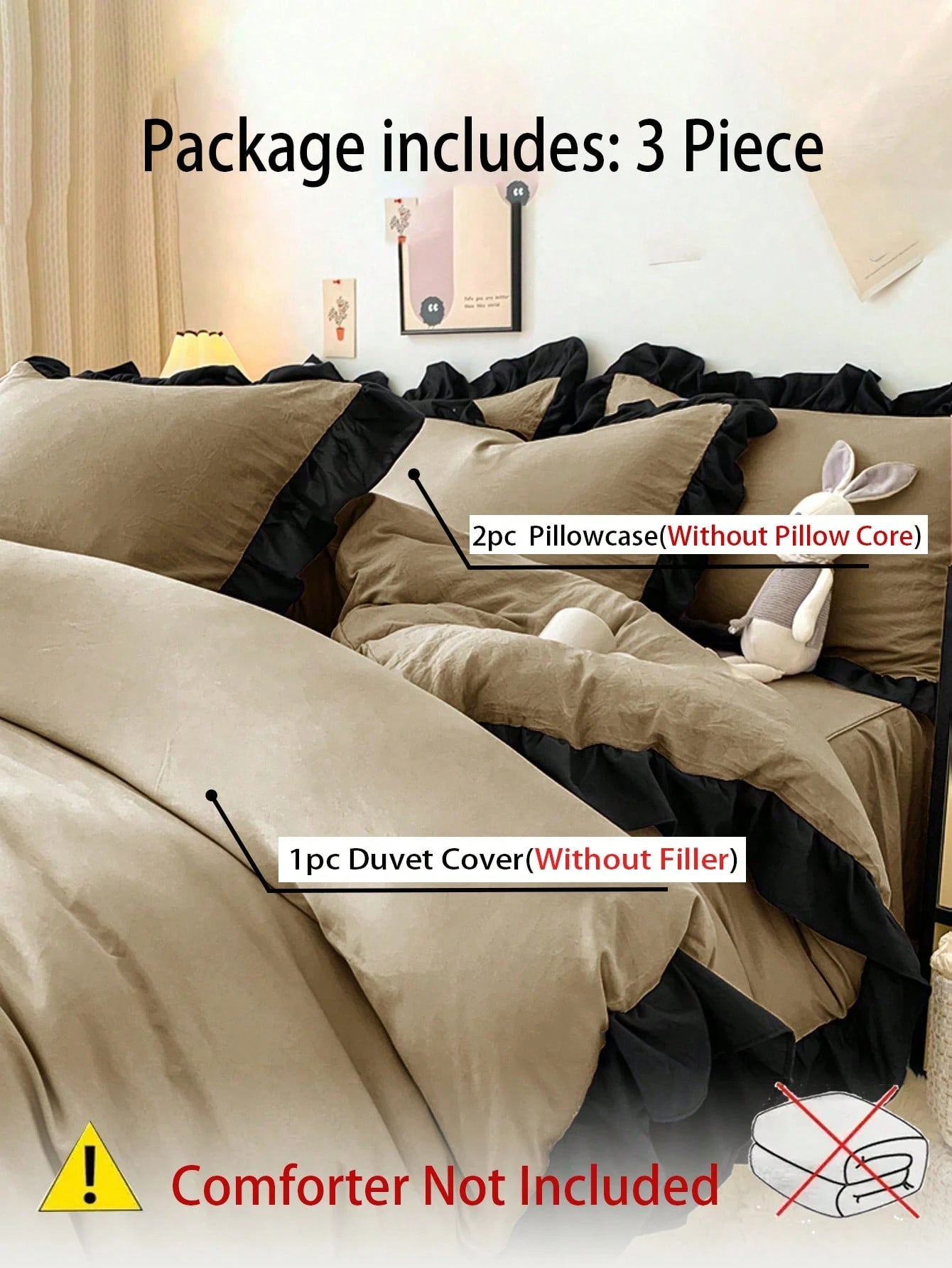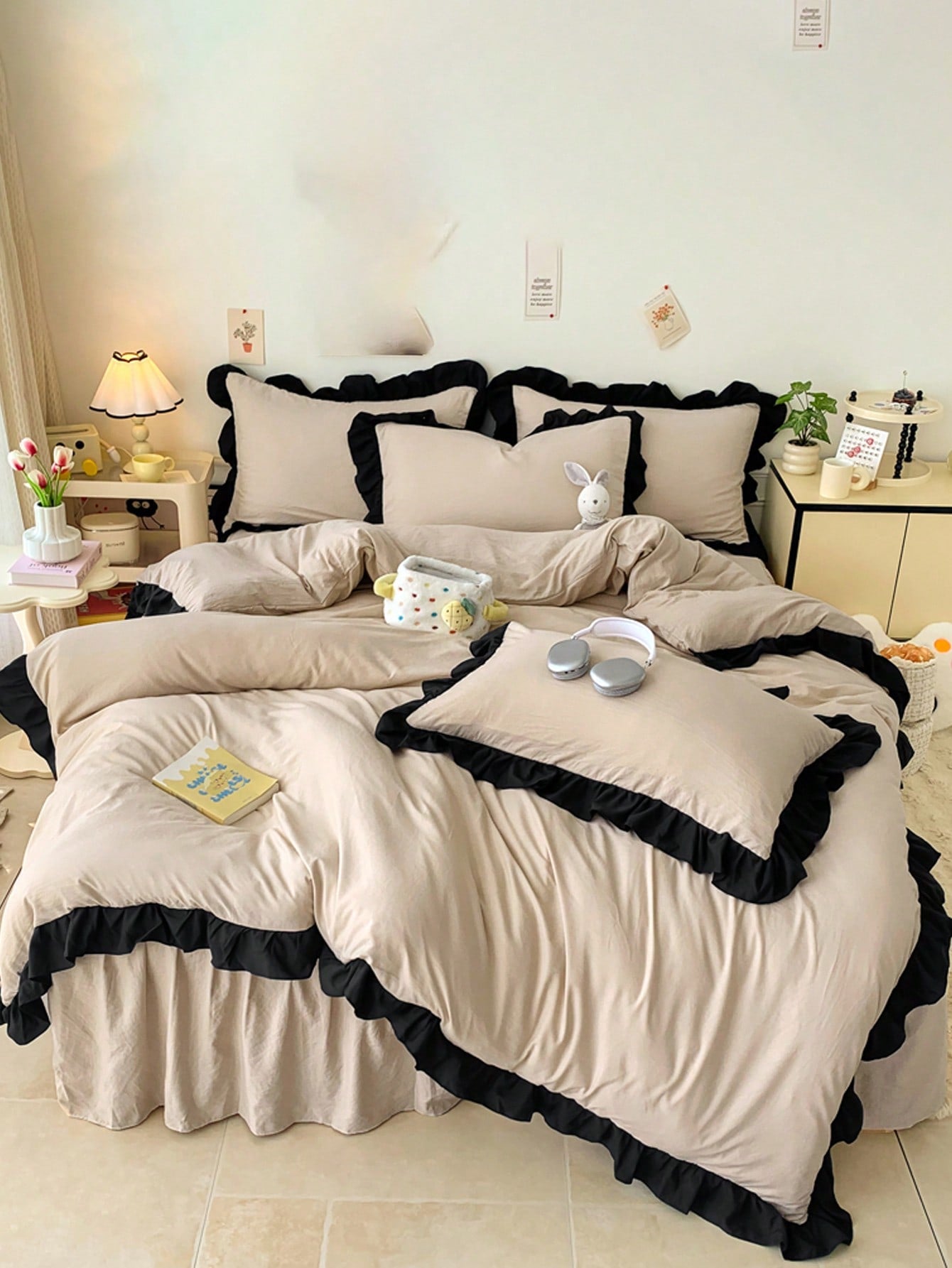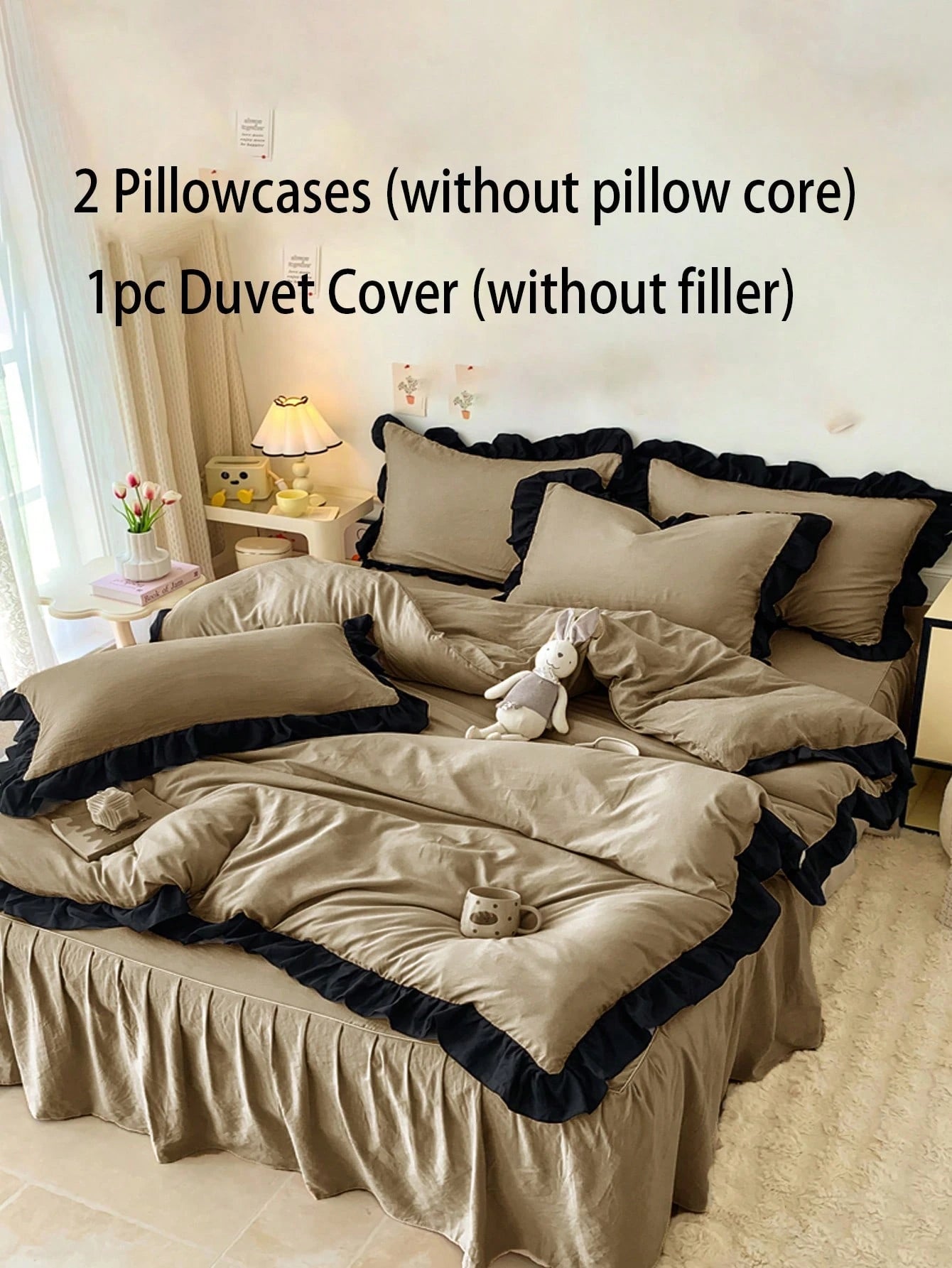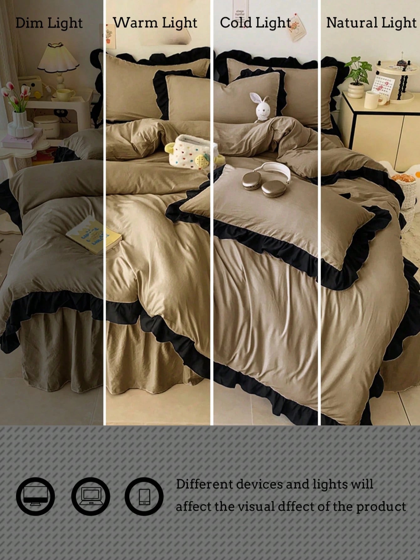 Set di biancheria da letto in tinta caffè scuro con volant, morbido e confortevole