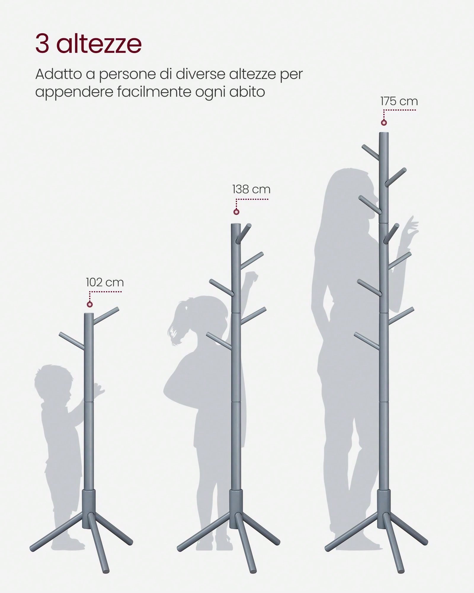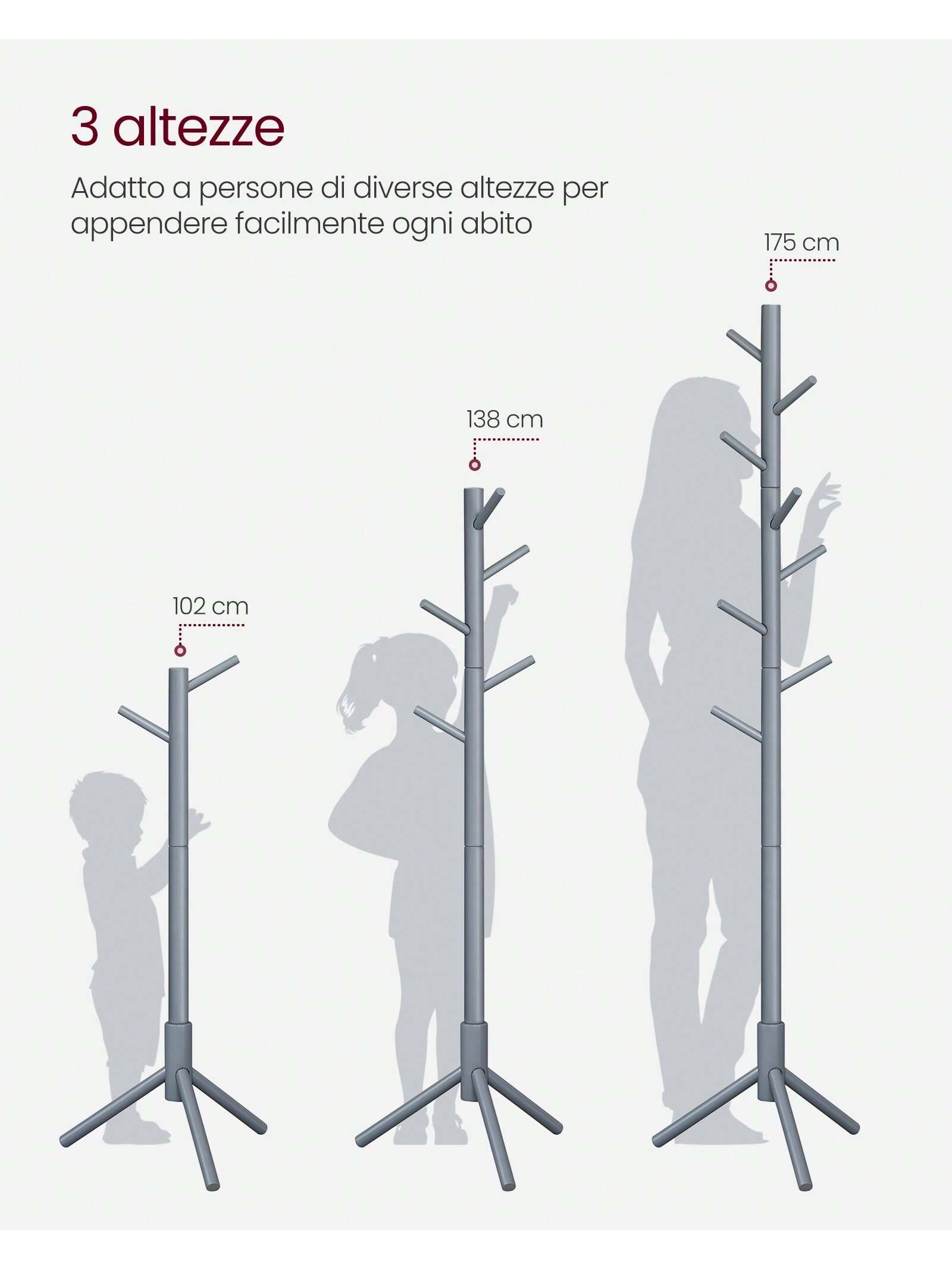 [3 altezze regolabili, le tue diverse esigenze] Grazie alla sua struttura in 3 parti, l'altezza di questo appendiabiti è regolabile. Per i bambini, è sufficiente assemblare 1-2 parti. Per gli adulti, si consiglia di montare le 3 parti