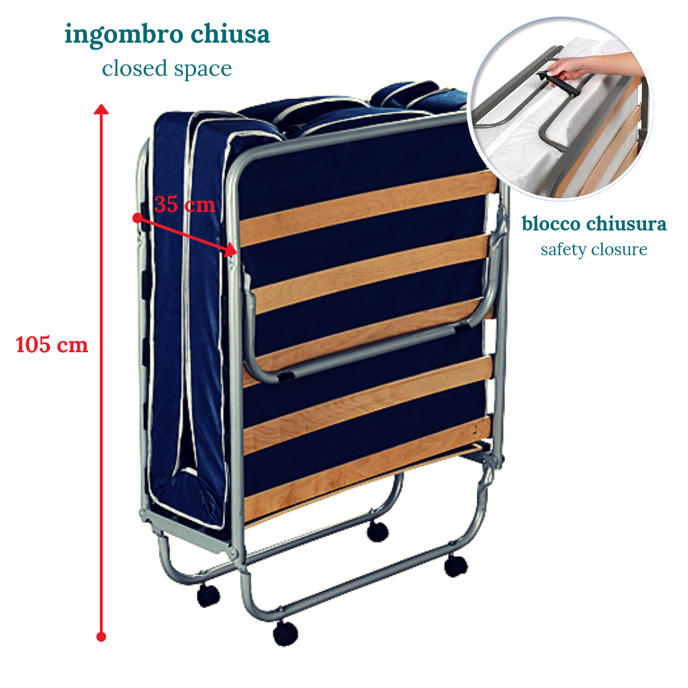 • CHIUSA: una volta piegata è piccolissima, 105 cm in altezza // 35 cm in spessore // 80 cm in larghezza. Misure Ingombro Branda