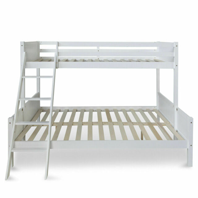 Il letto a soppalco in legno di pino è dipinto di bianco opaco.