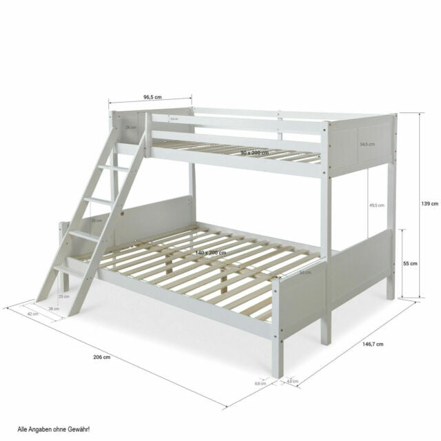 Il letto inferiore più grande per un massimo di 2 persone misura 140 x 200 cm e il letto superiore misura 90 x 200 cm con bordo di sicurezza.