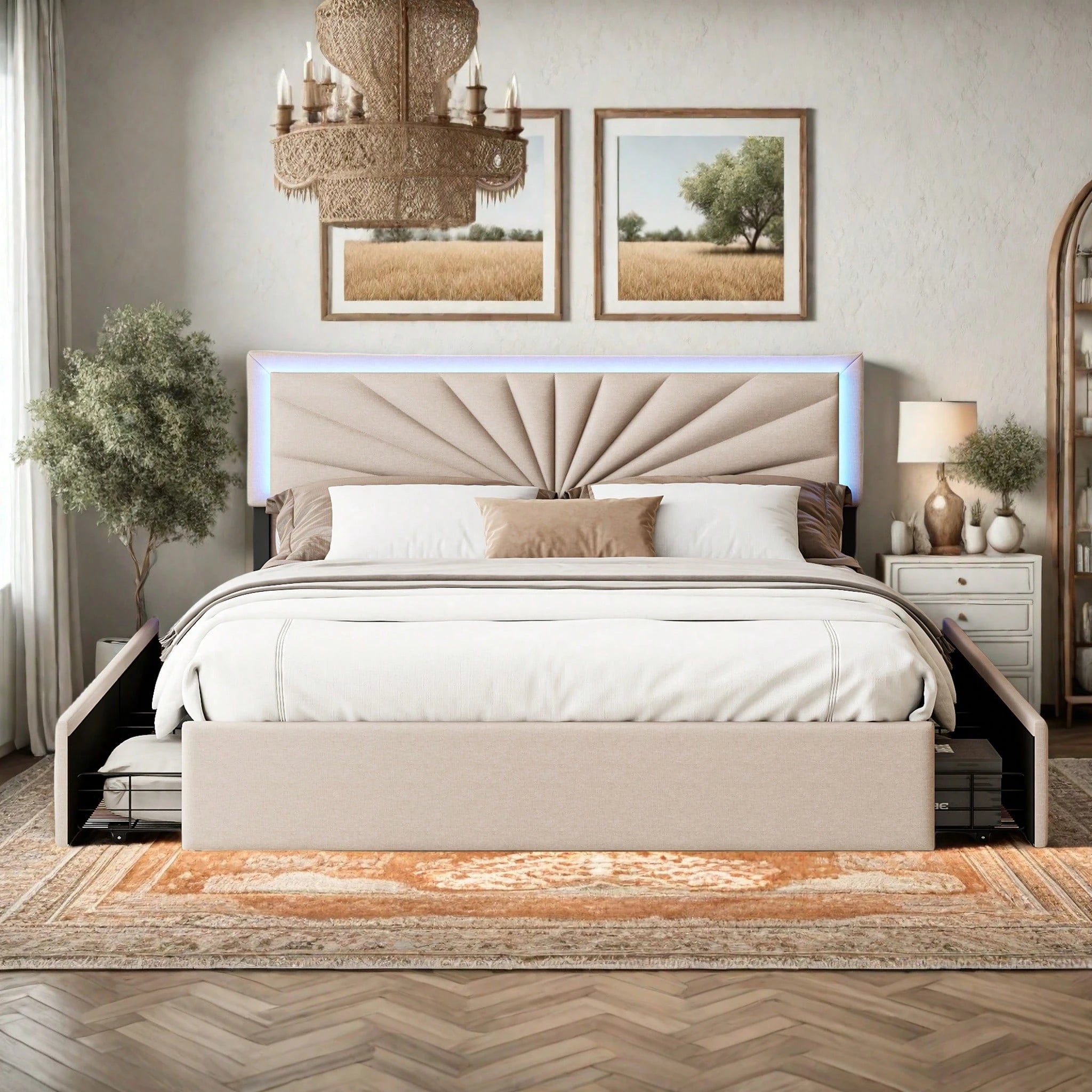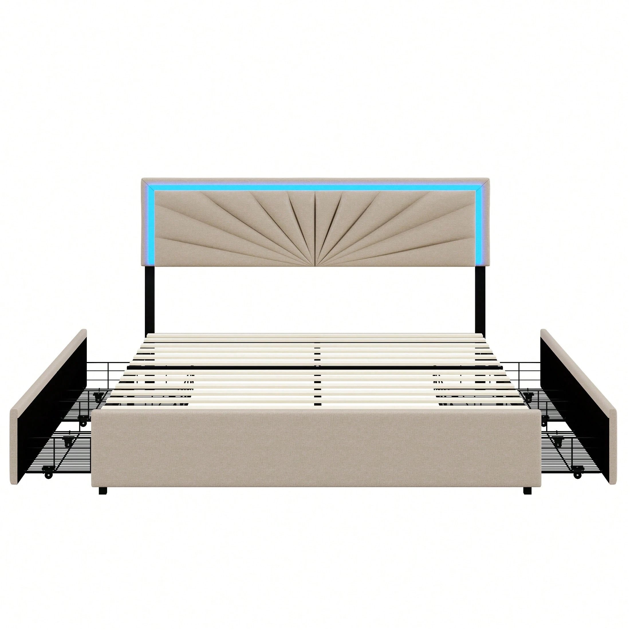 Letto imbottito 160 x 200 cm con illuminazione a LED, letto matrimoniale con 4 cassetti