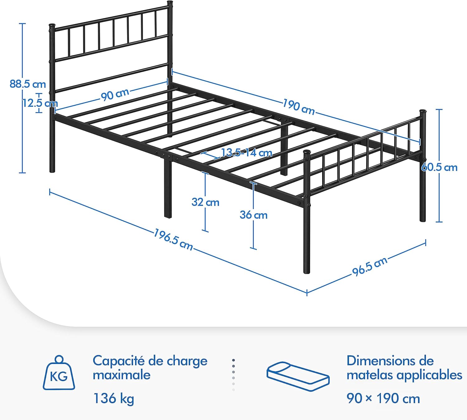Stabile e robusto: a 6 piedi, il letto 90 × 190 è realizzato in metallo robusto, con un rivestimento ben trattato. Un telaio stabile con un carico elevato fino a 136 kg, ottimale per un uso a lungo termine.