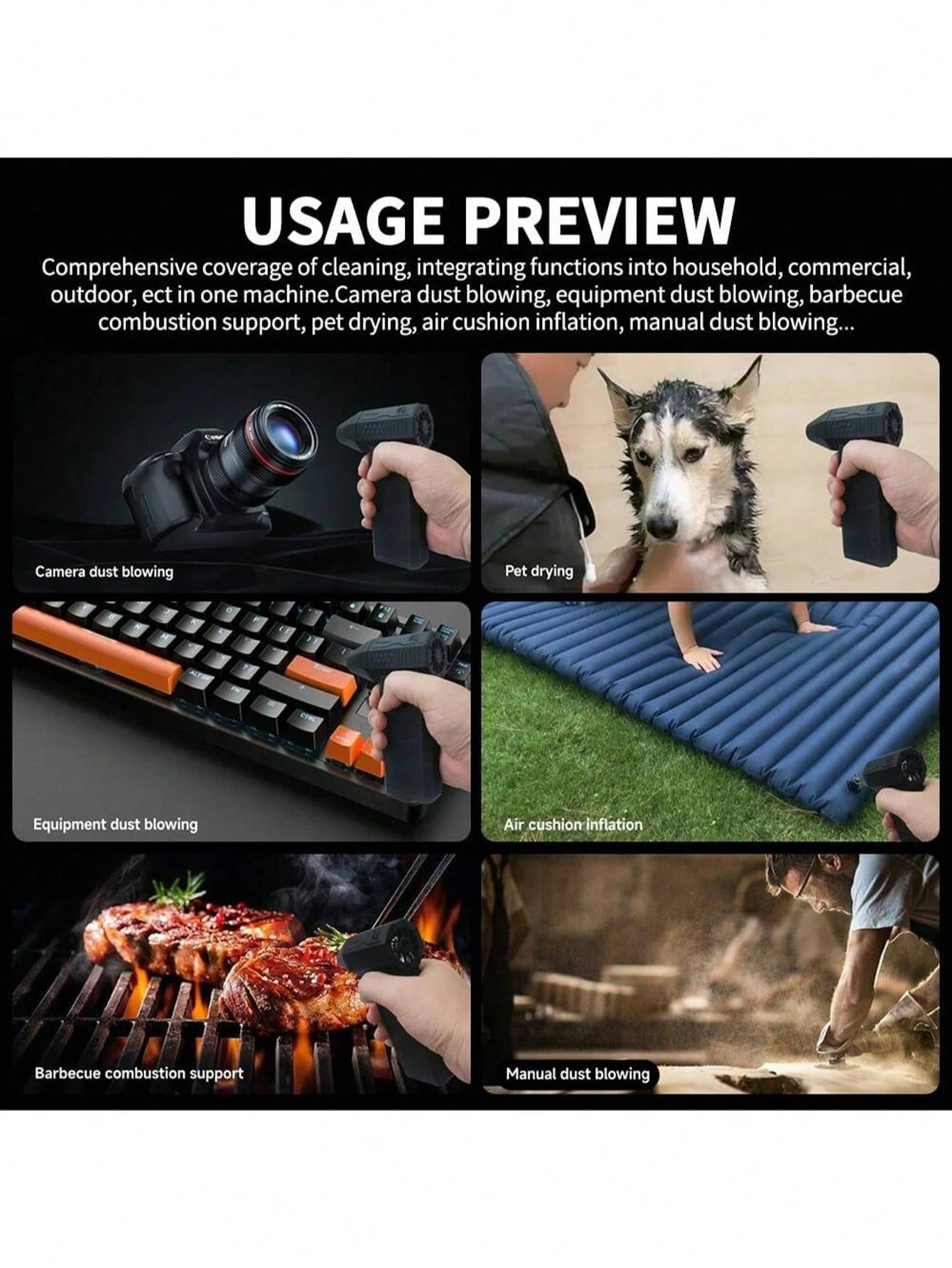 asciuga il tuo cane dopo il bagno, gonfia rapidamente oggetti, rinfresca l'auto in estate o avvia il barbecue con stile.