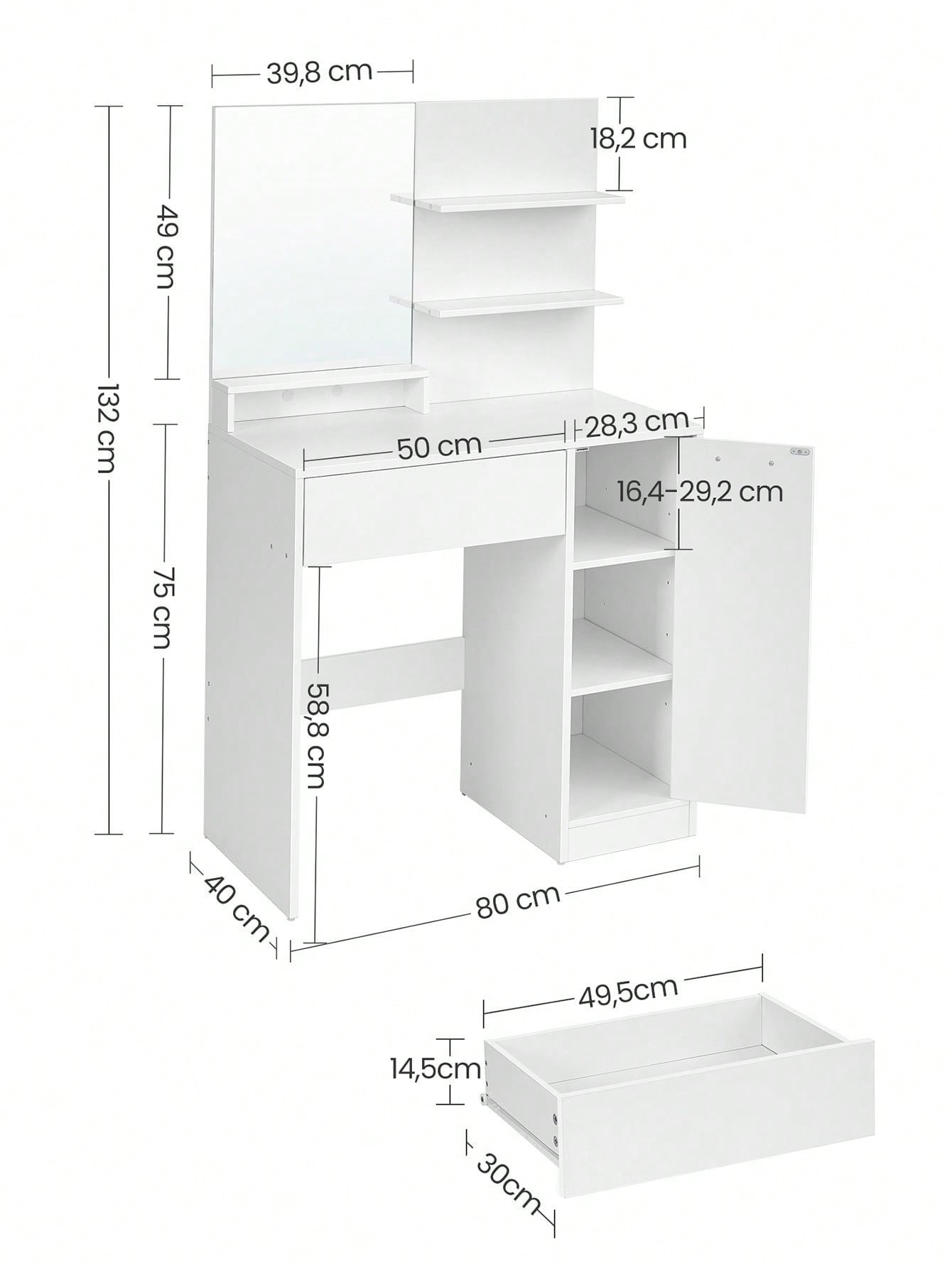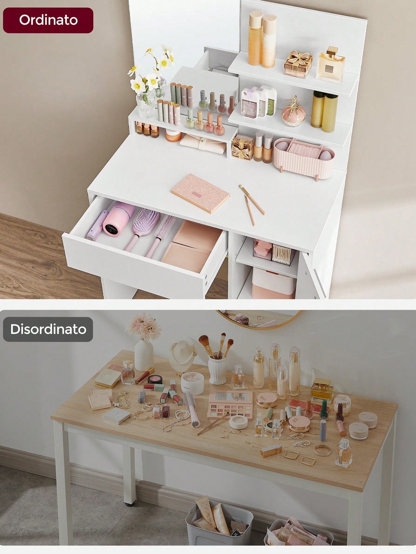 [Robusta e facile da pulire] Realizzata con pannello di truciolato di qualità, questa toeletta da trucco è robusta e durevole; il suo rivestimento è resistente all'usura e facile da pulire, per poterti permettere un utilizzo duraturo -