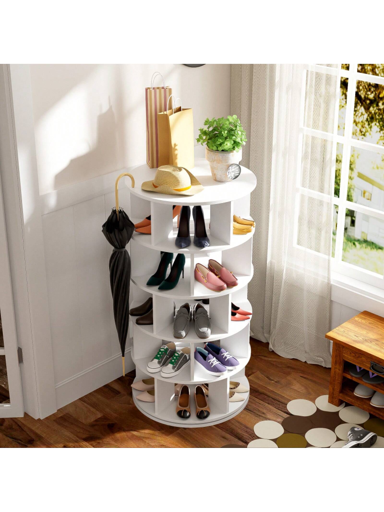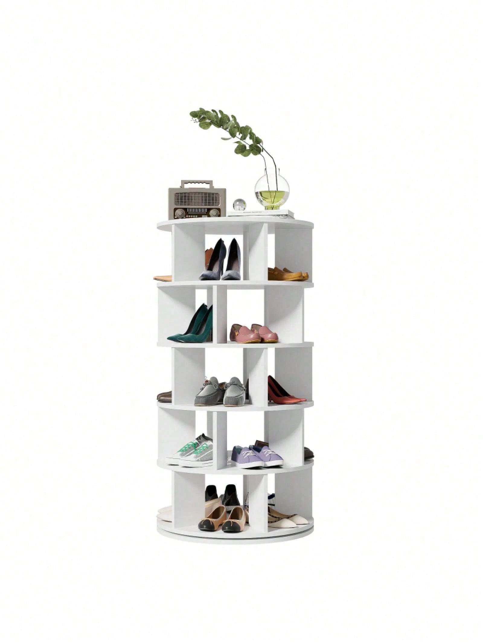 Scarpiera girevole a 5 livelli con struttura rotonda in plastica bianca, ideale per organizzare e esporre le calzature.