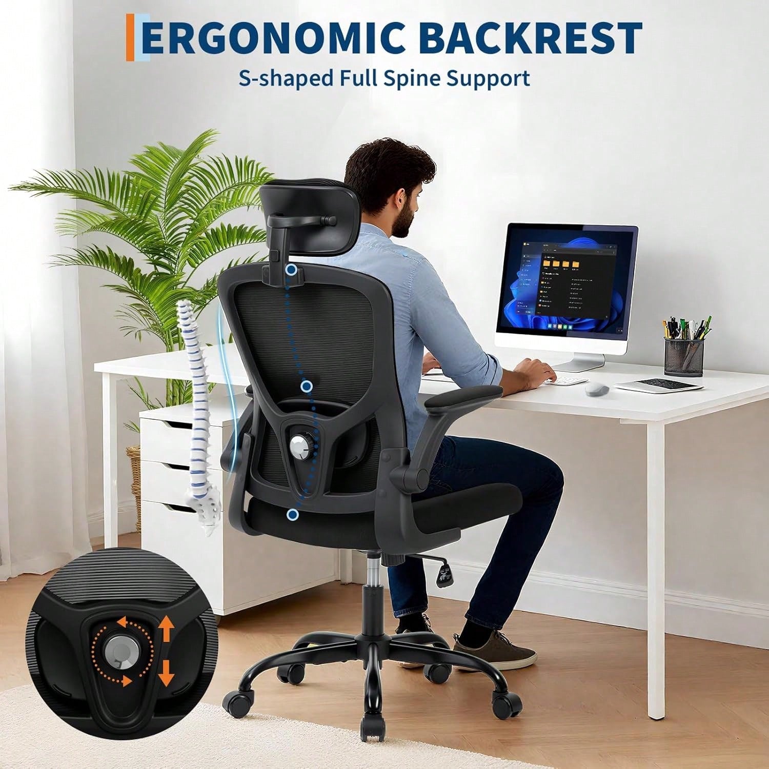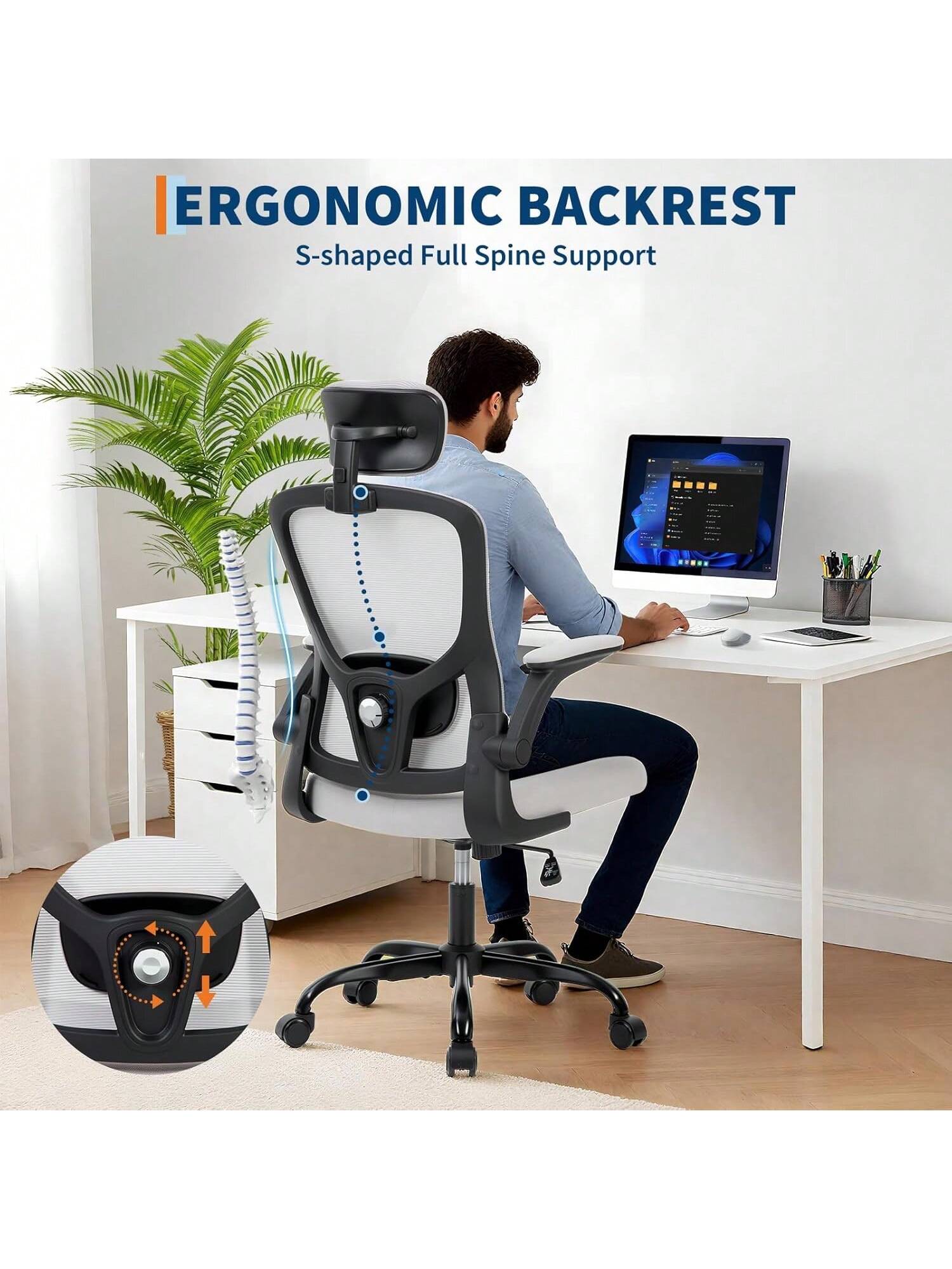Sedia da ufficio ergonomica con schienale alto: poggiatesta regolabile supporto lombare e braccioli pieghevoli