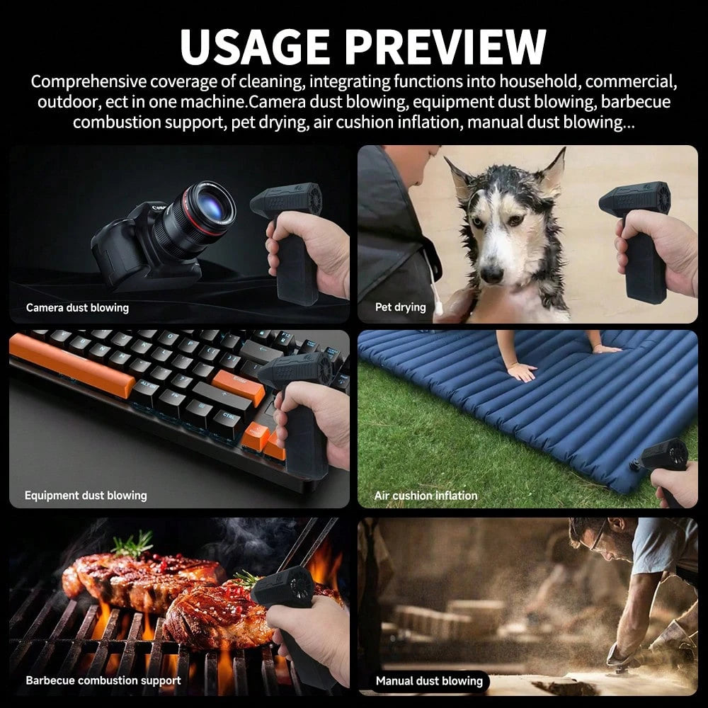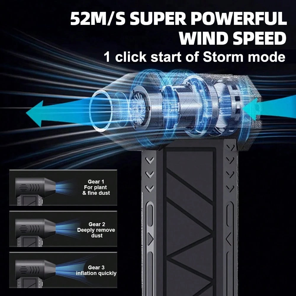 Soffiatore portatile che non scherza: 130.000 giri/min di pura potenza per dire addio a polvere, neve e sporco! Ricaricabile via USB-C, con motore brushless silenzioso e 3 livelli di velocità regolabili fino a 52 m/s. La ventola turbo ciclone è perfetta per pulire auto, casa e giardino senza fatica. Compatto,...