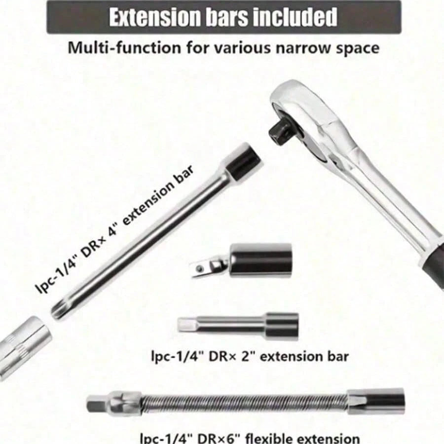 bussole metriche, chiavi esagonali e barra di estensione con trasmissione 1/4". Progettato per lavori di meccanica automobilistica e manutenzione generale.