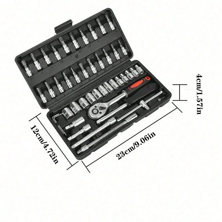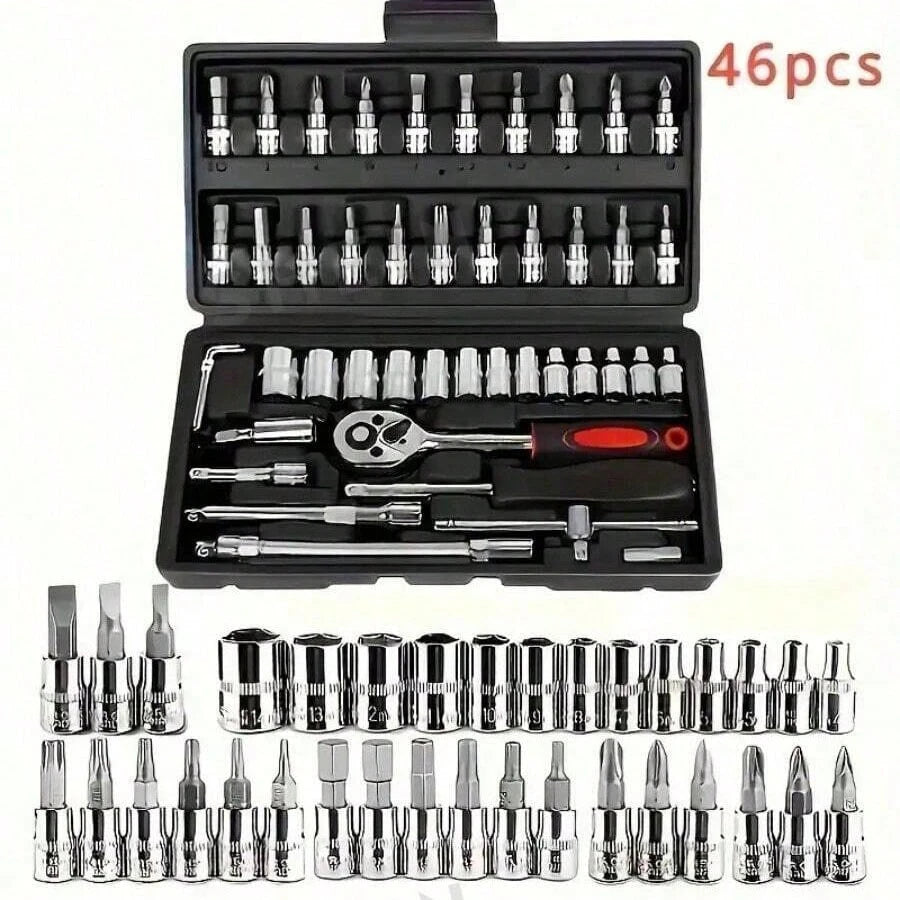 Set completo di 46 pezzi per professionisti e appassionati di fai-da-te. Include chiavi a cricchetto,