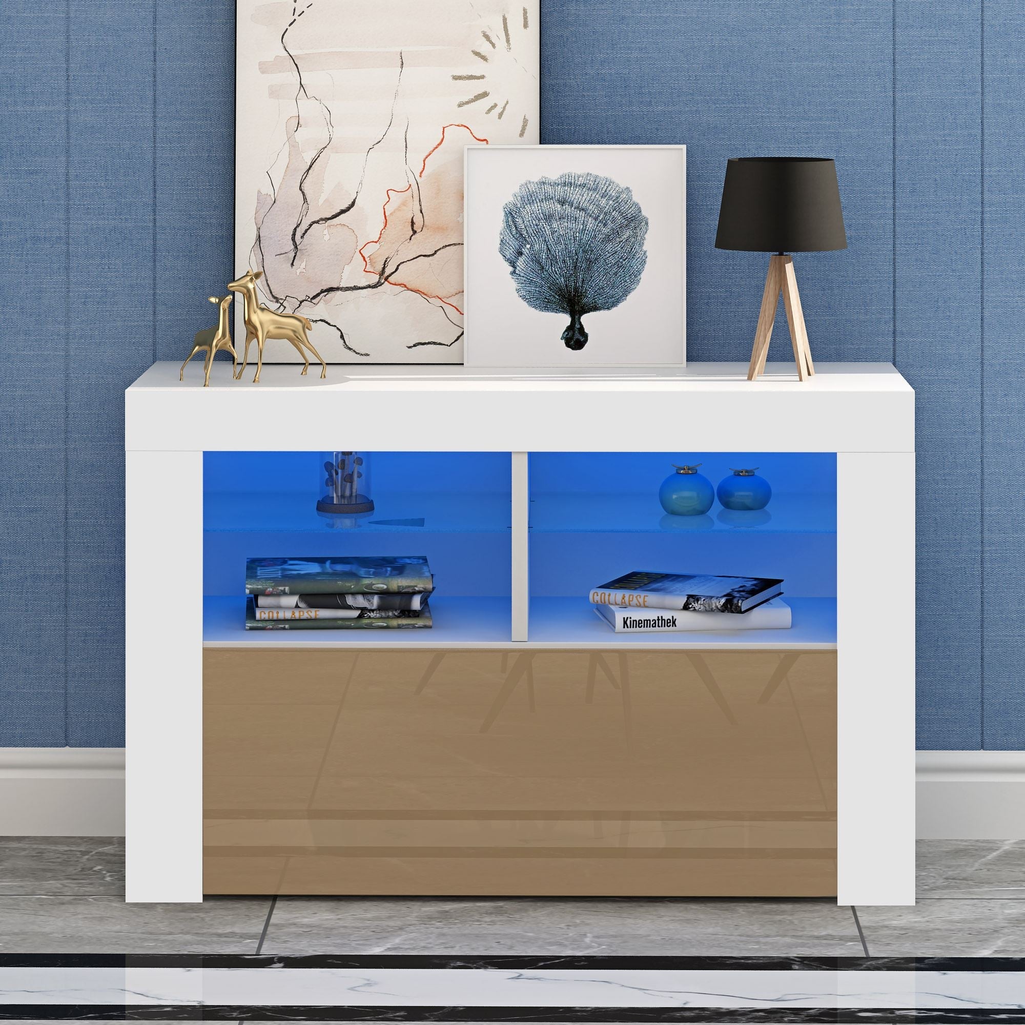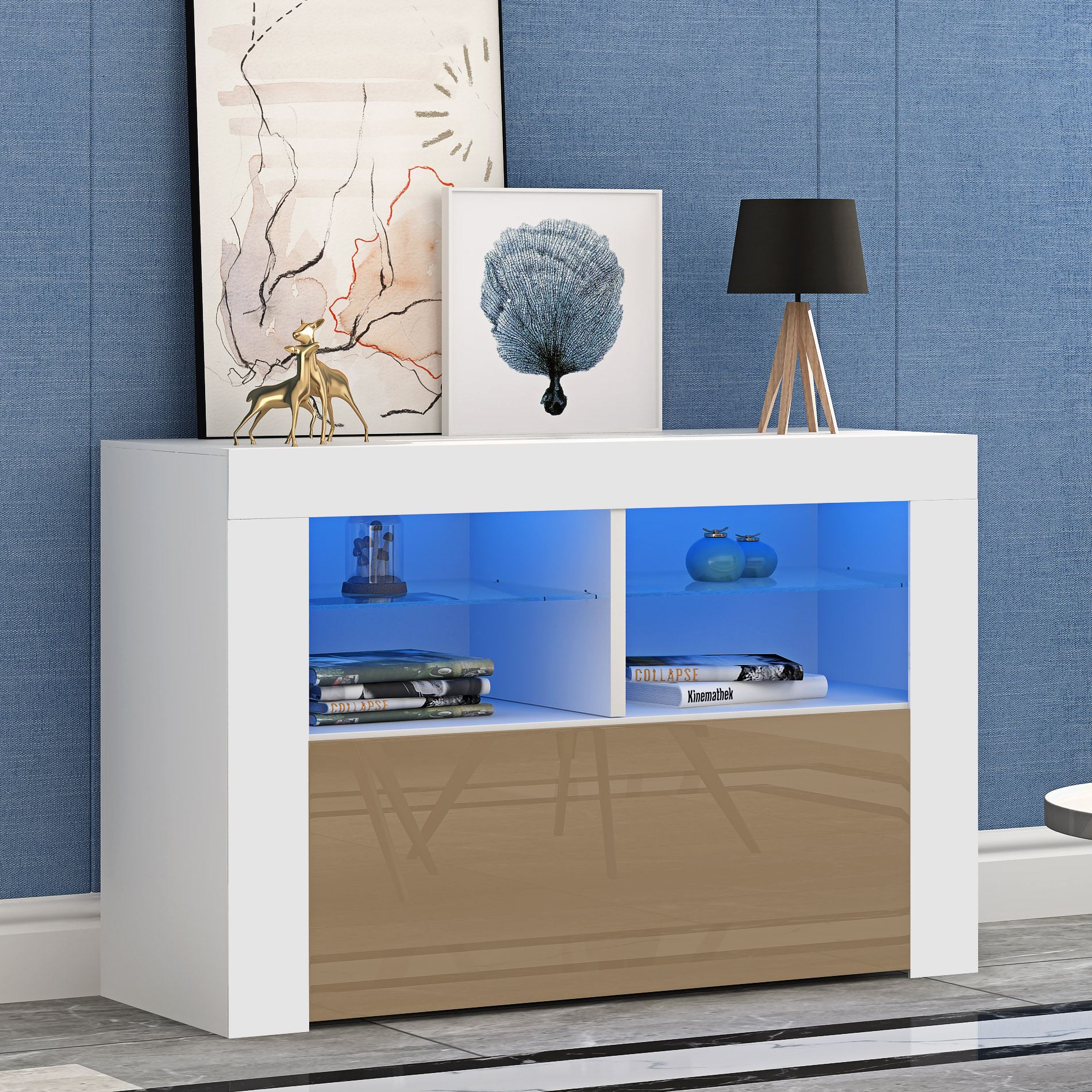 -C' è una possibilità di aggiungere luci a LED per il vostro ripiani in vetro, con RGB (multicolore luci, con un telecomando) luce opzioni disponibili.