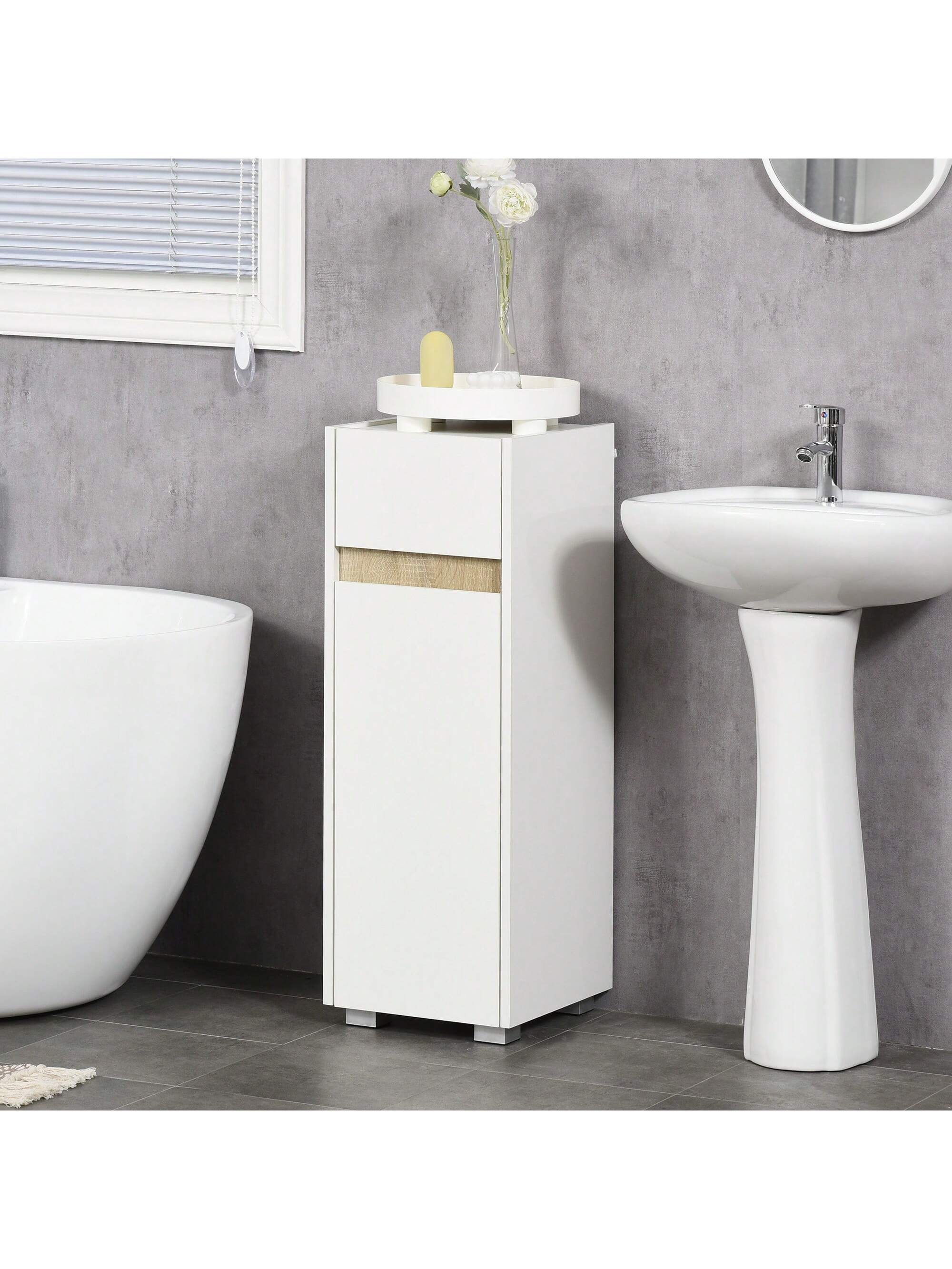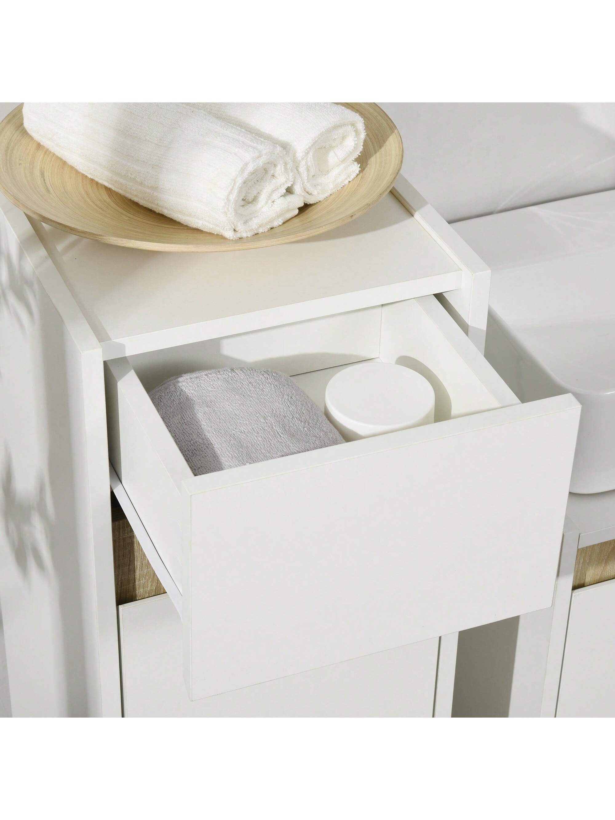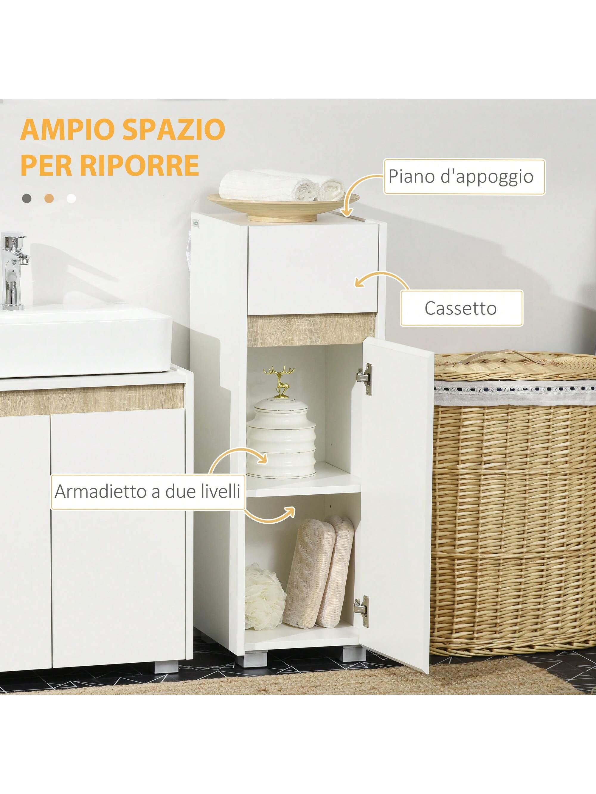 Mobiletto Bagno con Cassetto e Armadietto con Mensola Regolabile, Mobile Multiuso in Legno 30x33x88cm, Bianco