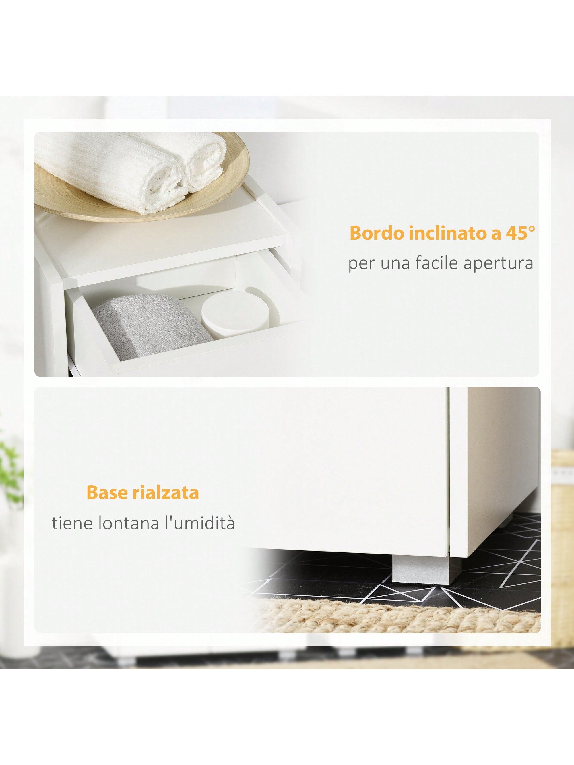 Questo piccolo mobile bagno ha una robusta struttura in legno truciolare con piedini in ABS che lo tengono rialzato dal pavimento.