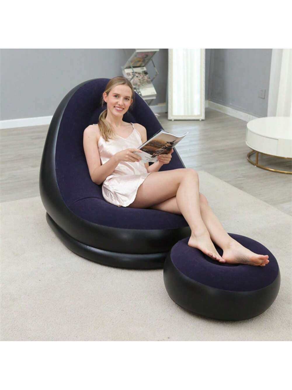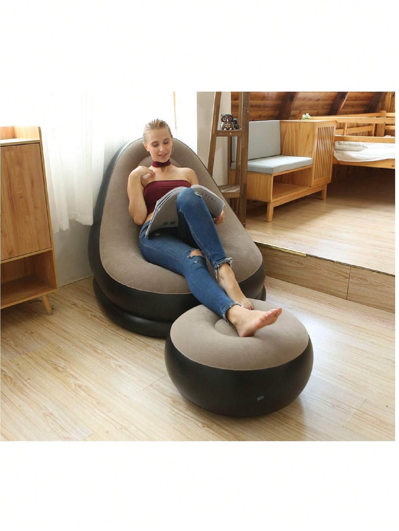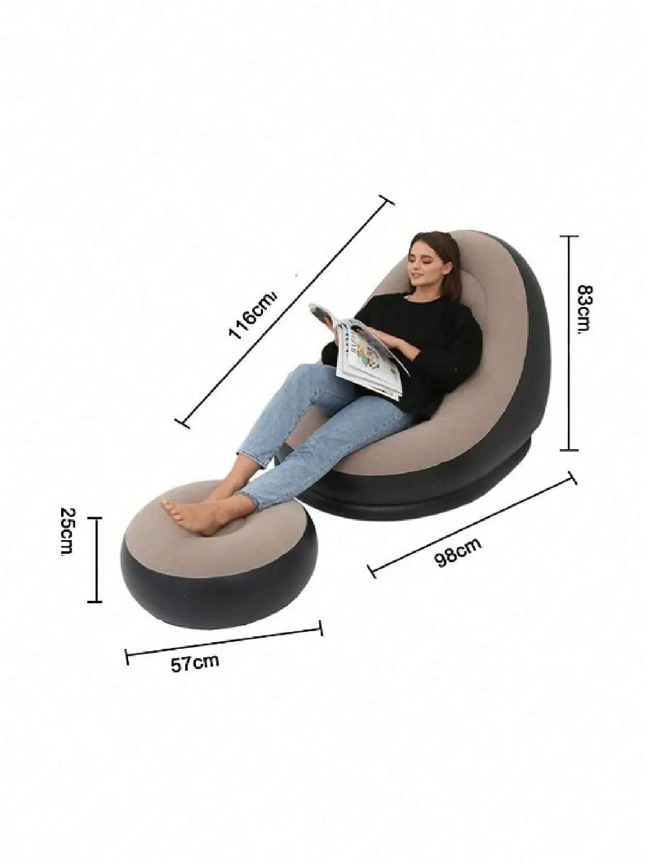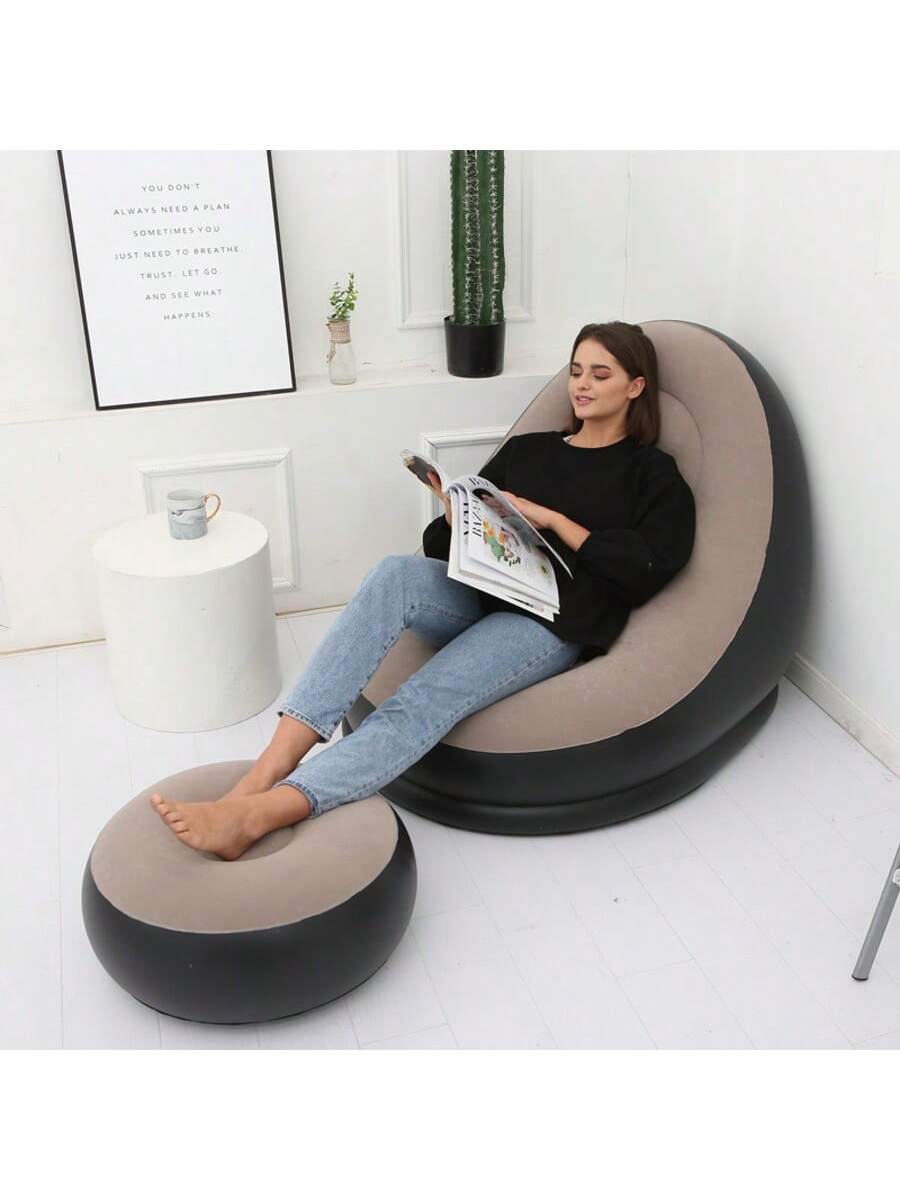 Trasforma il tuo spazio festival in una zona relax esclusiva con questo set completo di divano gonfiabile e poggiapiedi.