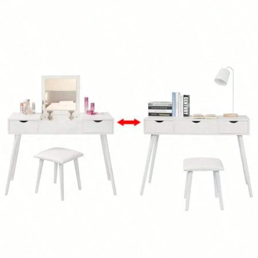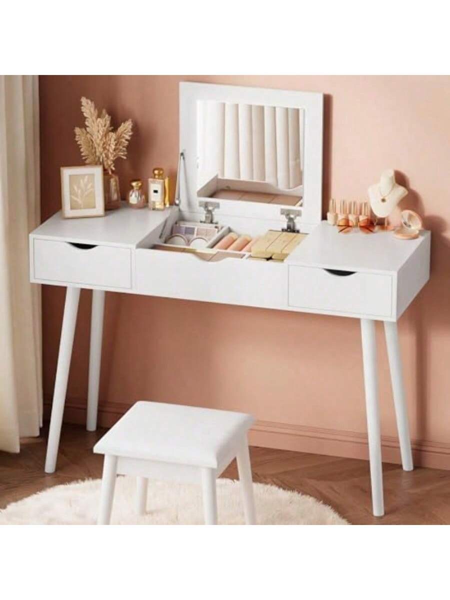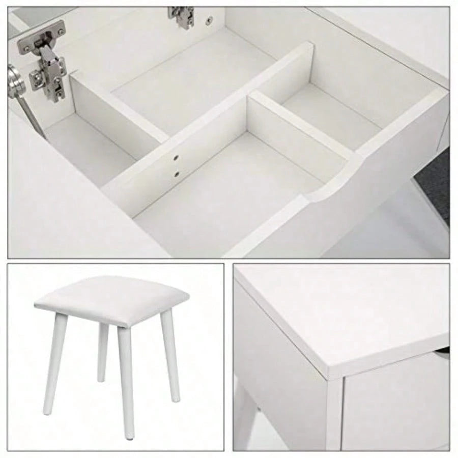 Specchiera da Trucco con Specchio Pieghevole, Tavolo da Toeletta con Sgabello Imbottito