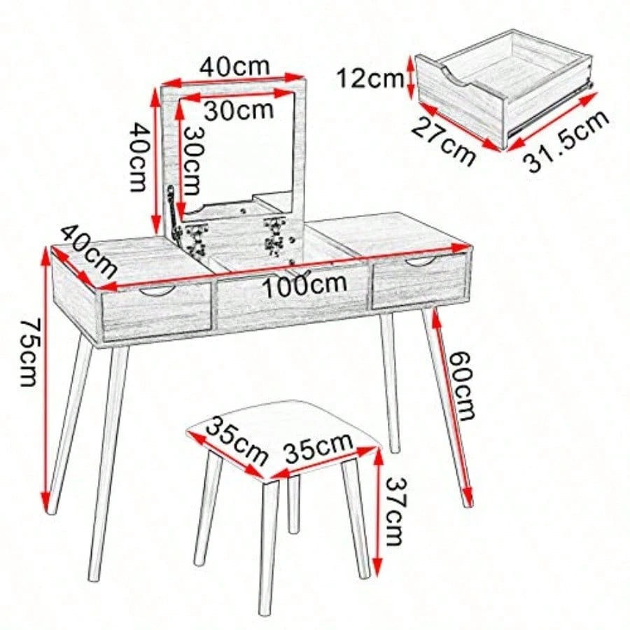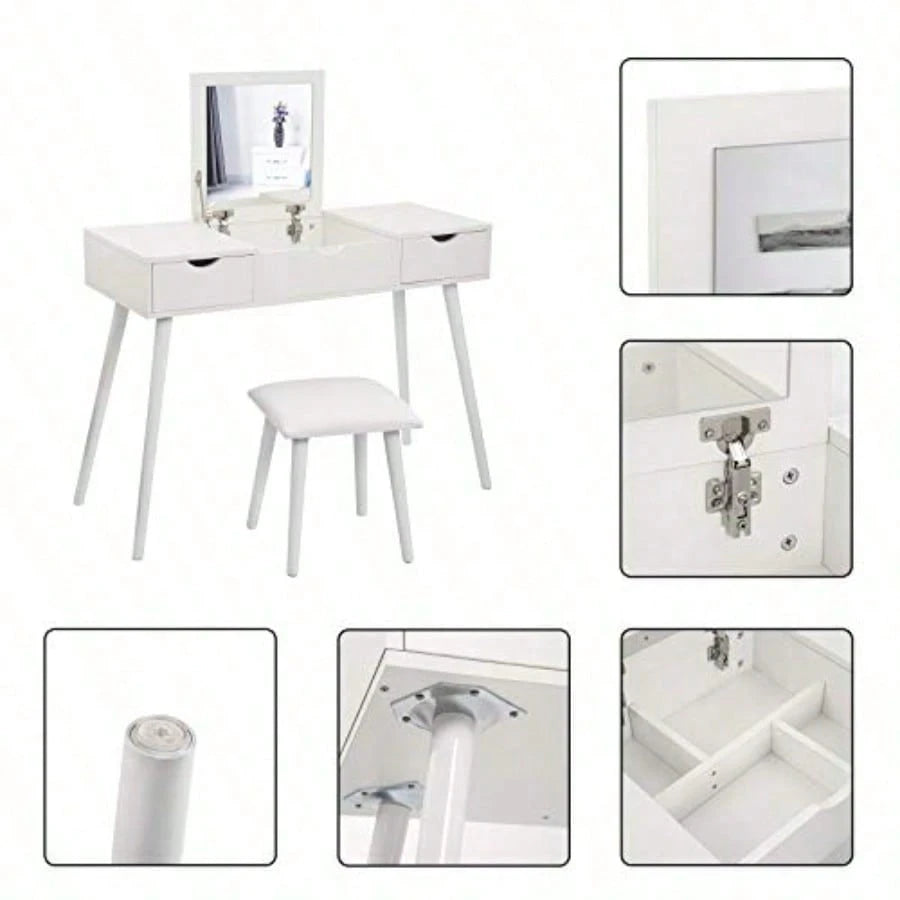 Tavolo da toeletta elegante e funzionale, perfetto per chi desidera uno spazio dedicato alla cura personale. Dotato di specchio pieghevole regolabile, offre praticità e versatilità d'uso.  La struttura in legno bianco dal design moderno si integra facilmente in qualsiasi ambiente. Due capienti cassetti garantiscono spazio organizzato per cosmetici e accessori....