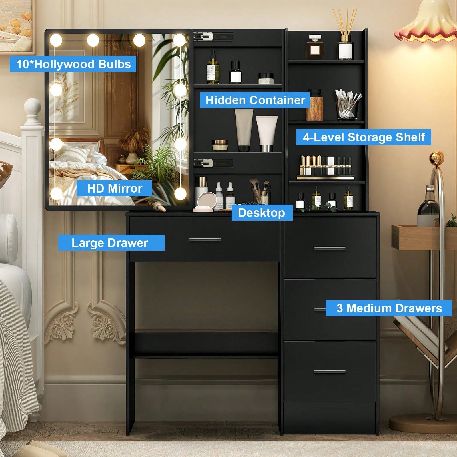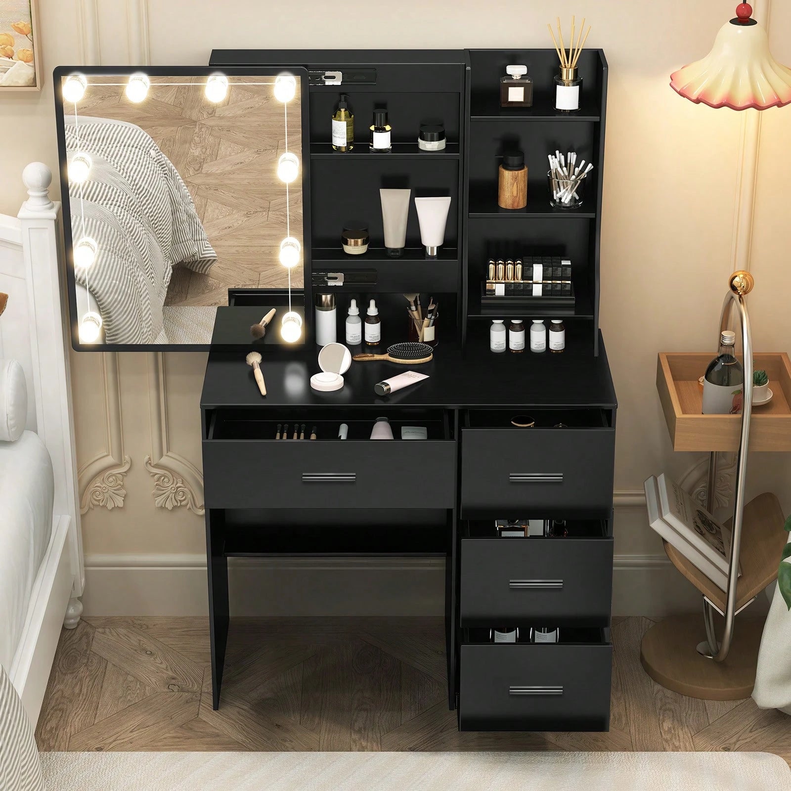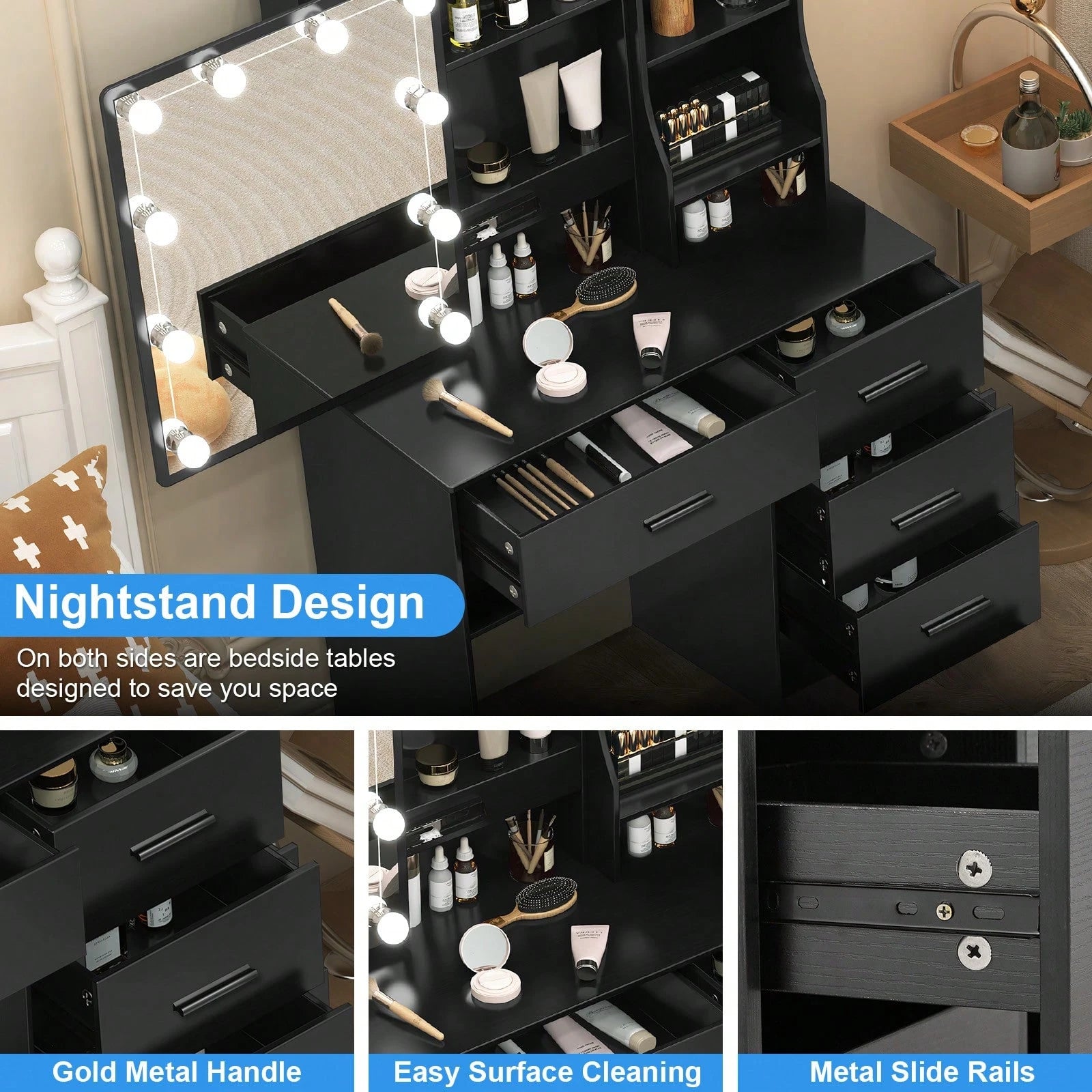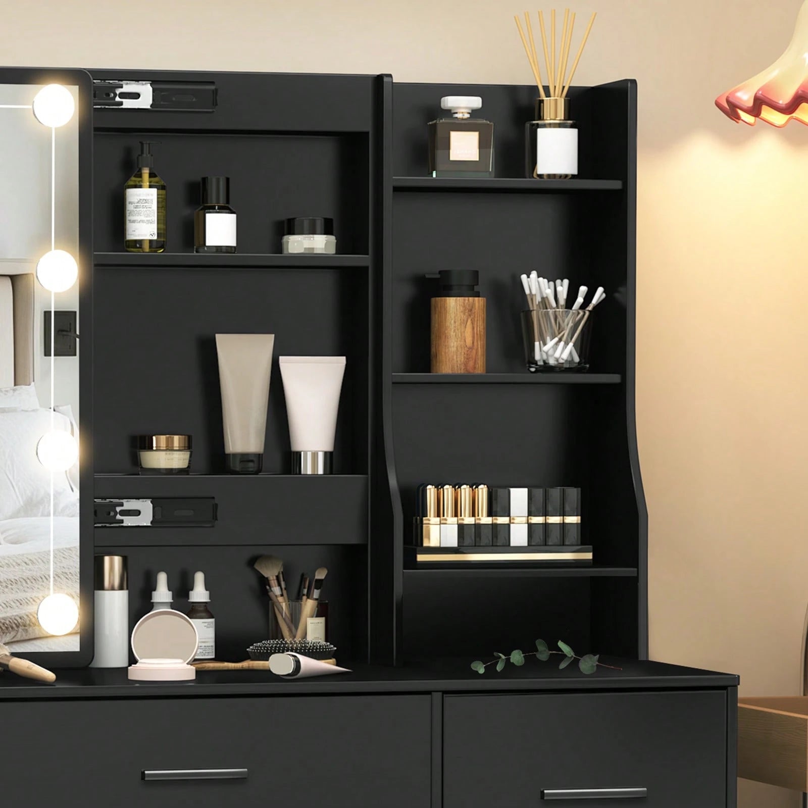 Postazione di lavoro integrata con ampio cassetto portaoggetti per organizzare cosmetici e accessori.