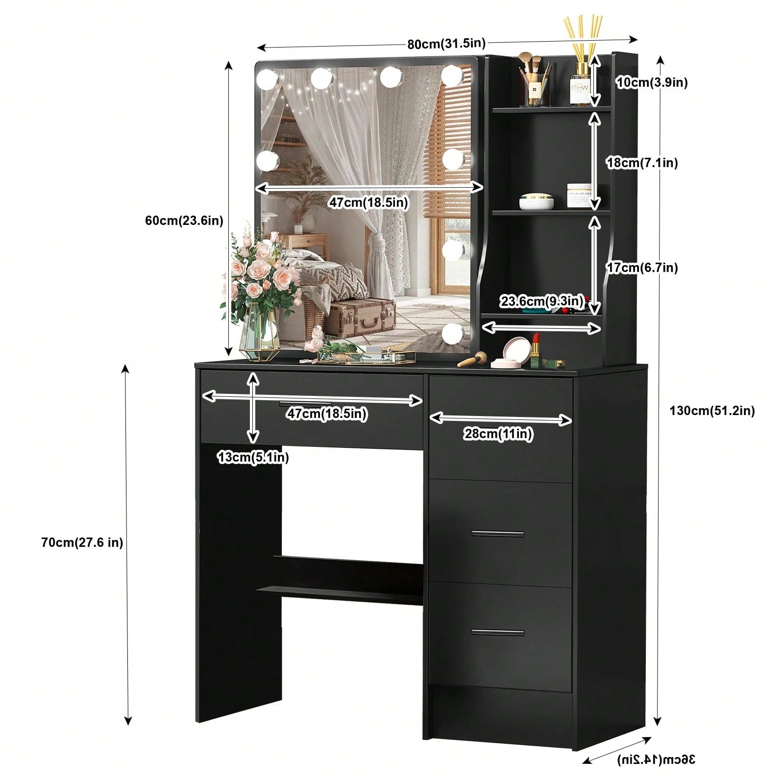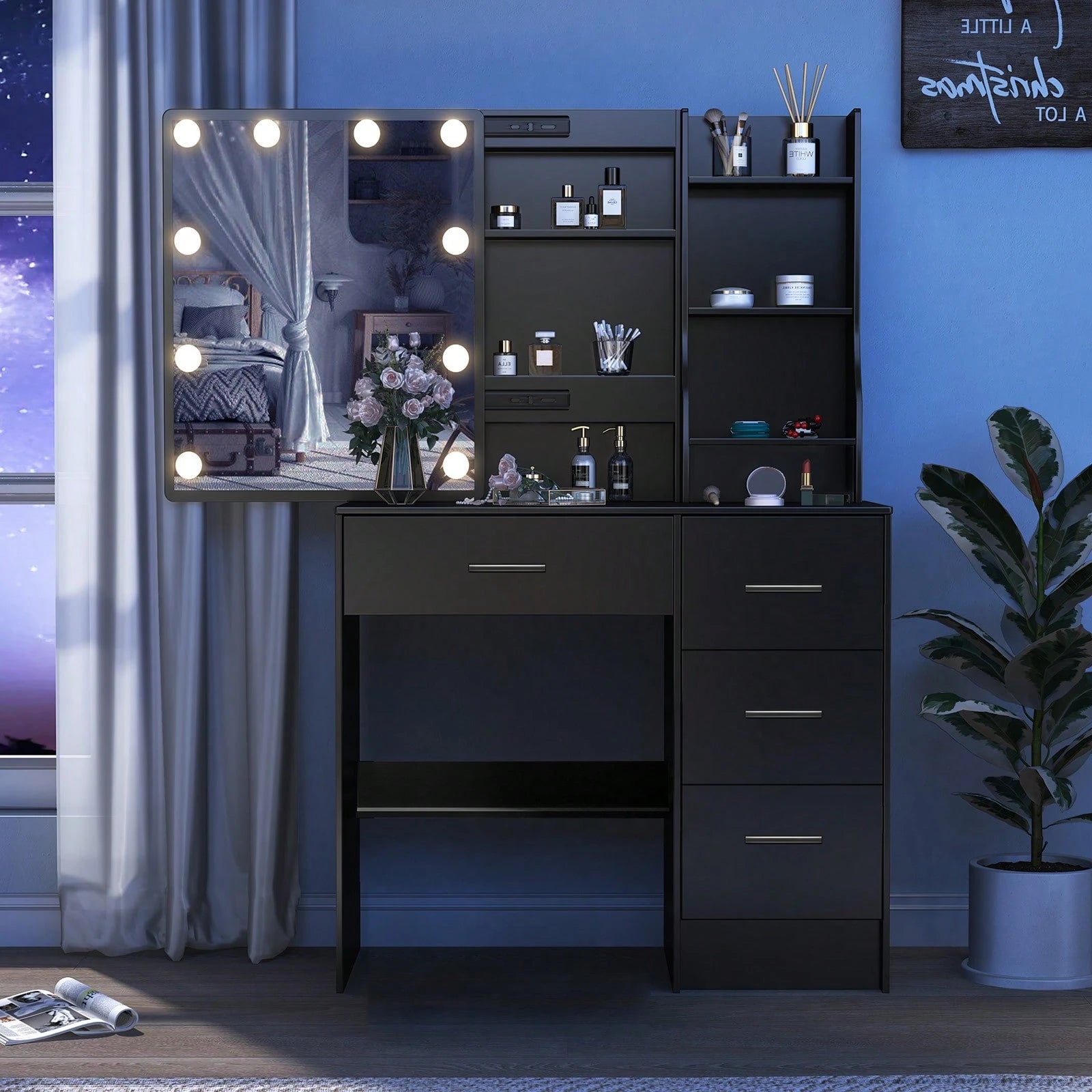 Specchio da trucco LED in legno massello scandinavo nero, design minimalista e raffinato.