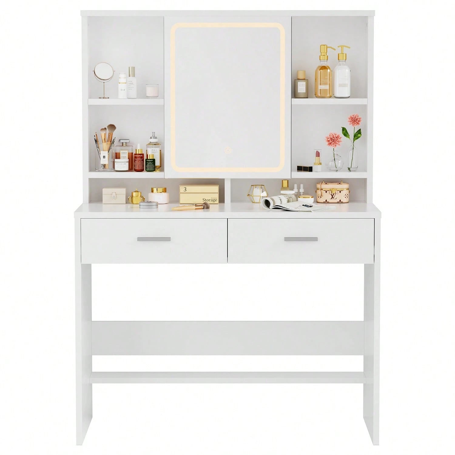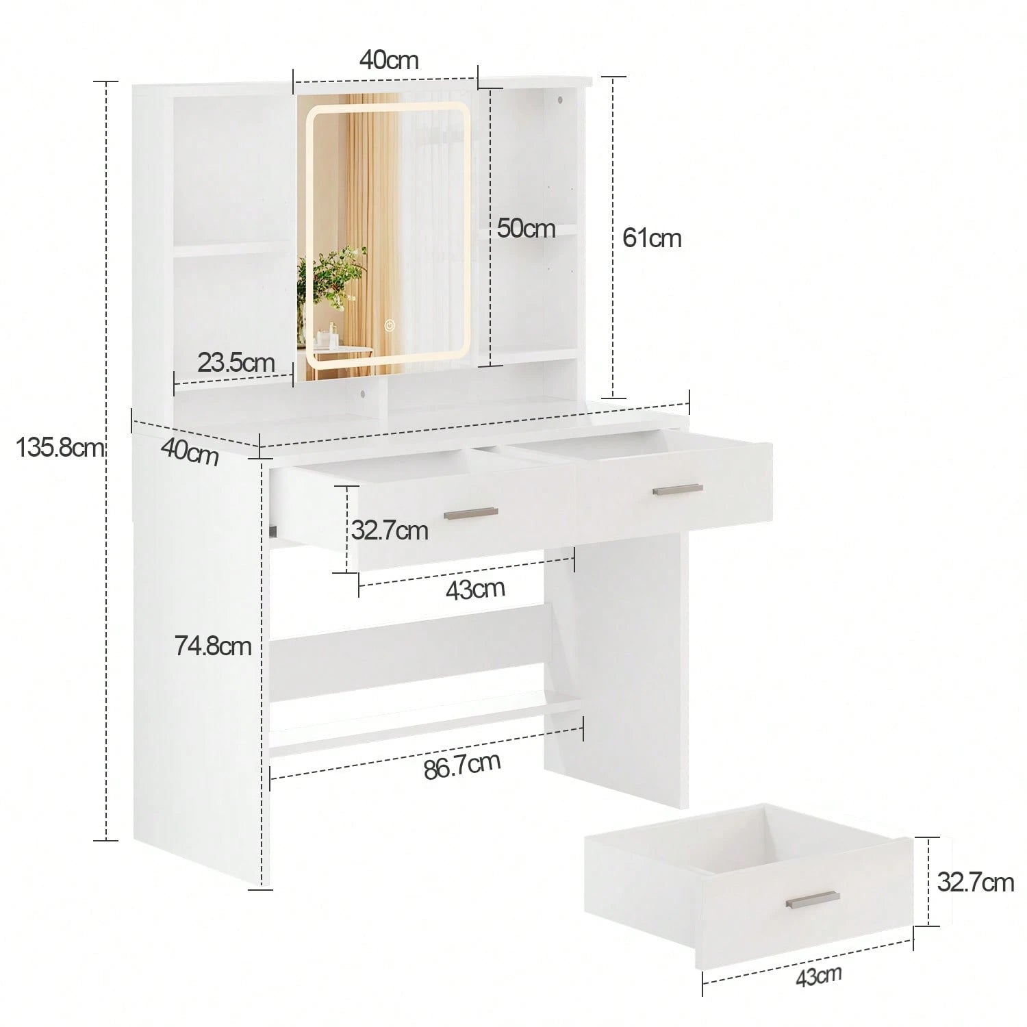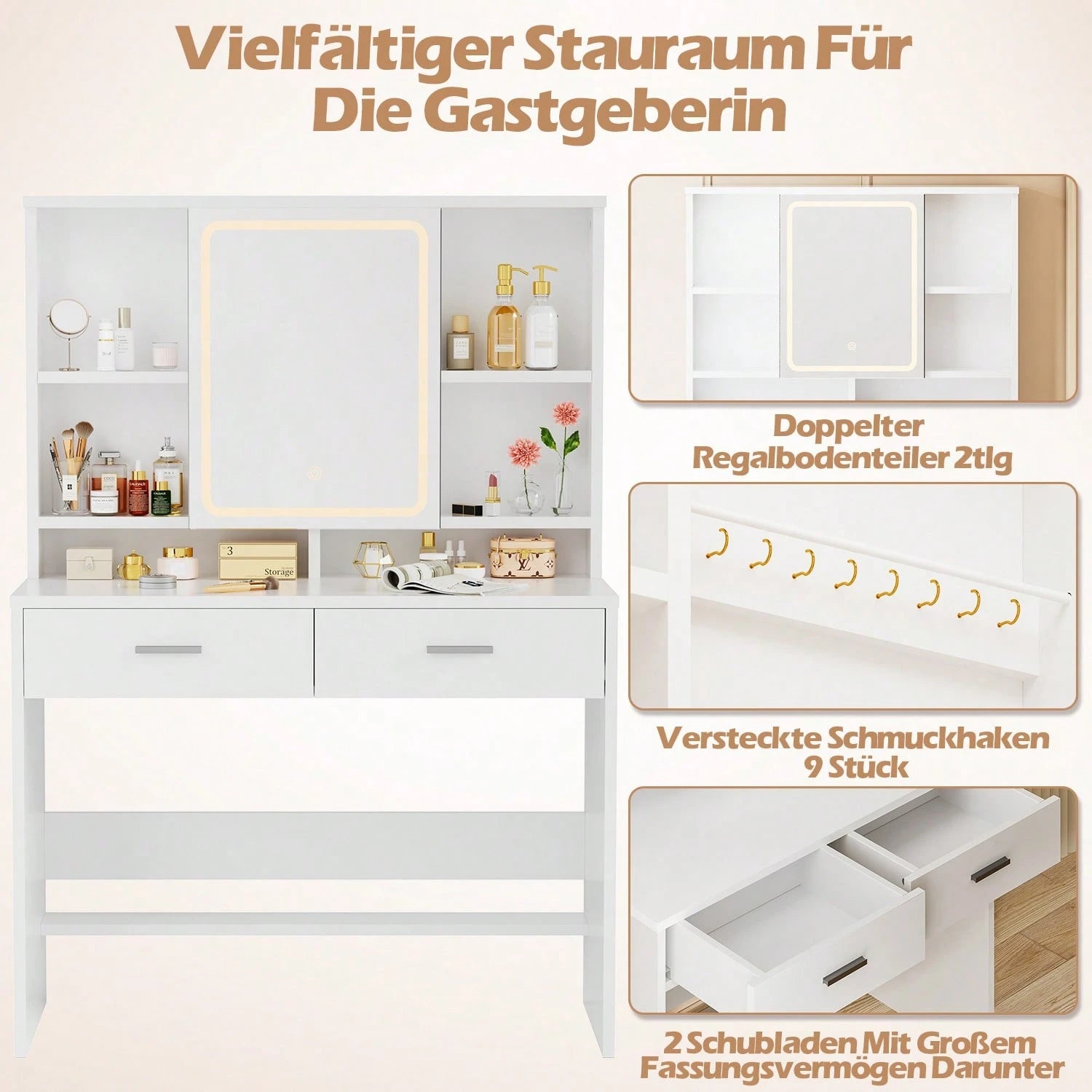 Dotata di illuminazione LED a 3 colori regolabili, ti permette di creare l'atmosfera perfetta per ogni momento della giornata. I 2 spaziosi cassetti offrono pratica organizzazione per cosmetici, accessori e oggetti personali.