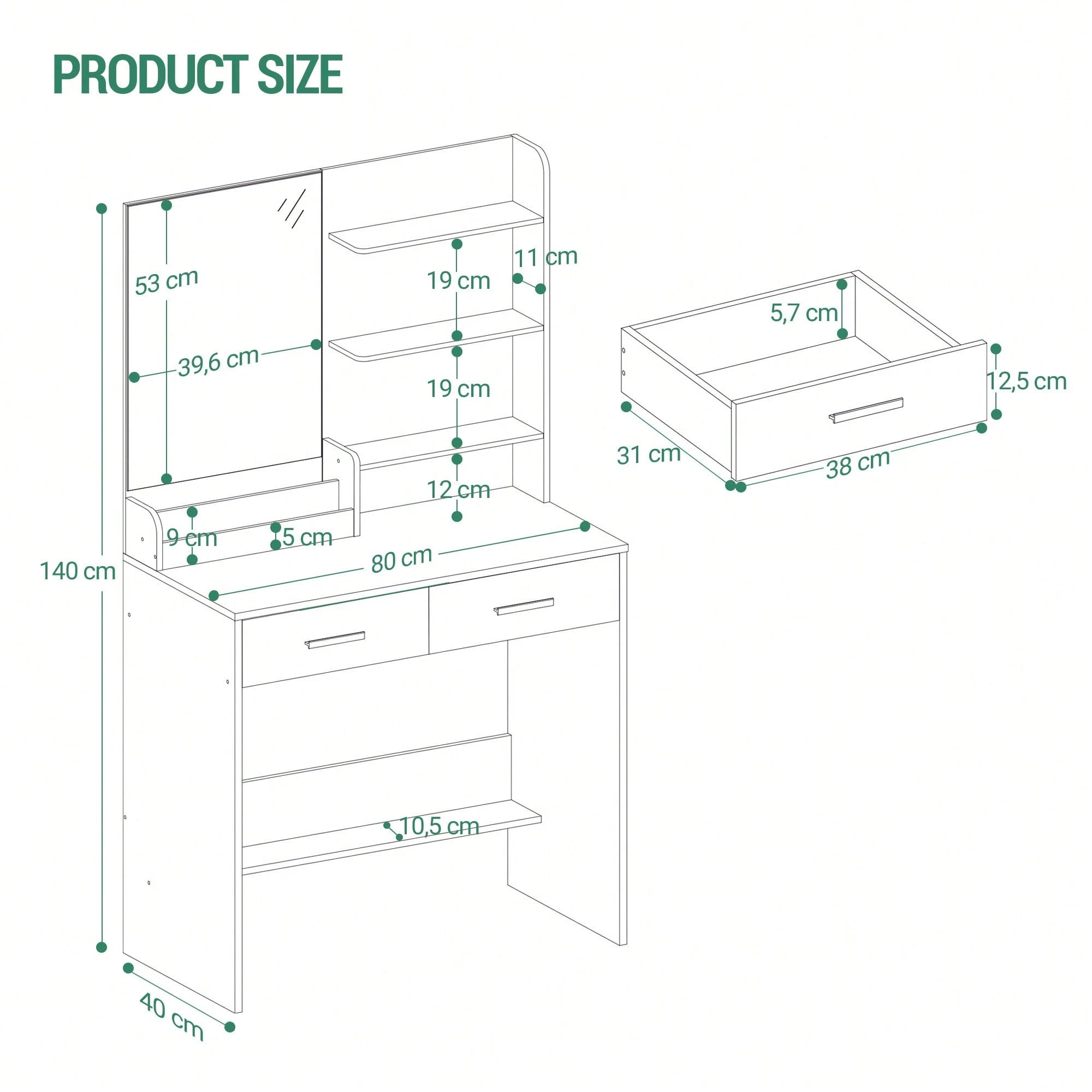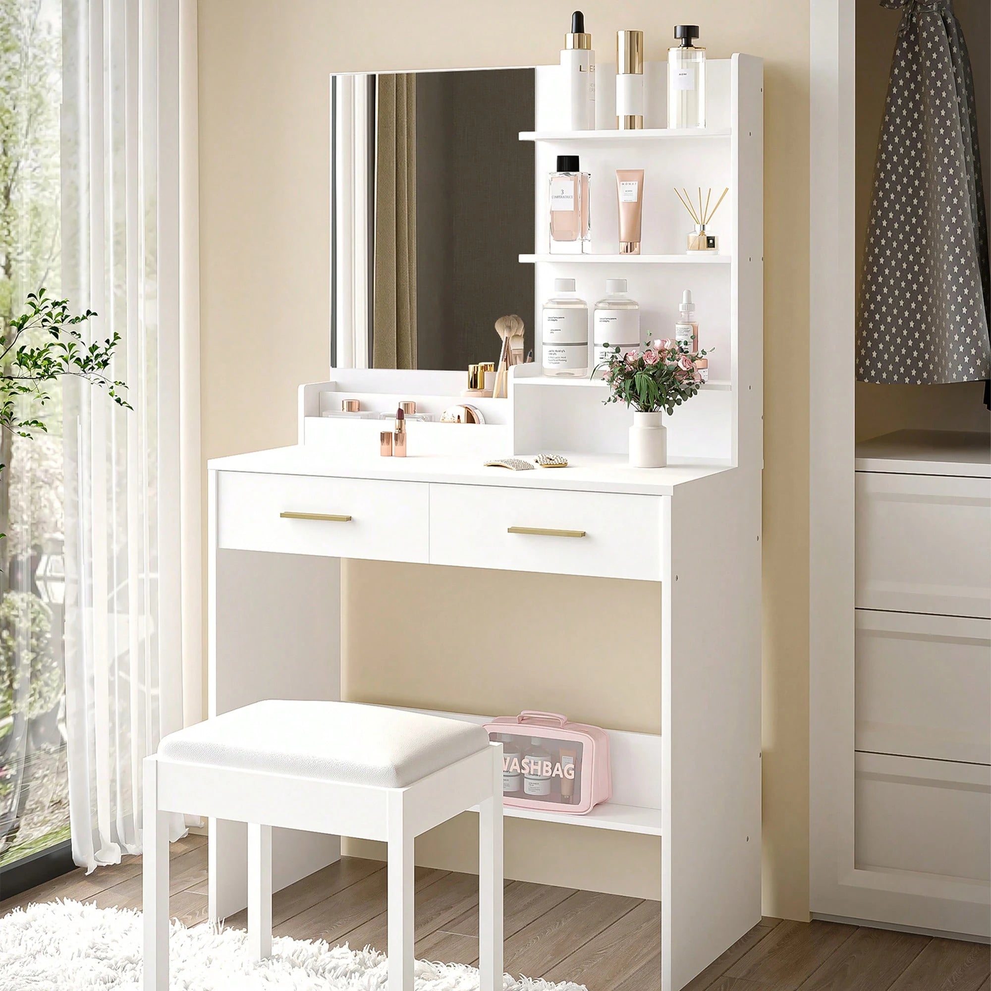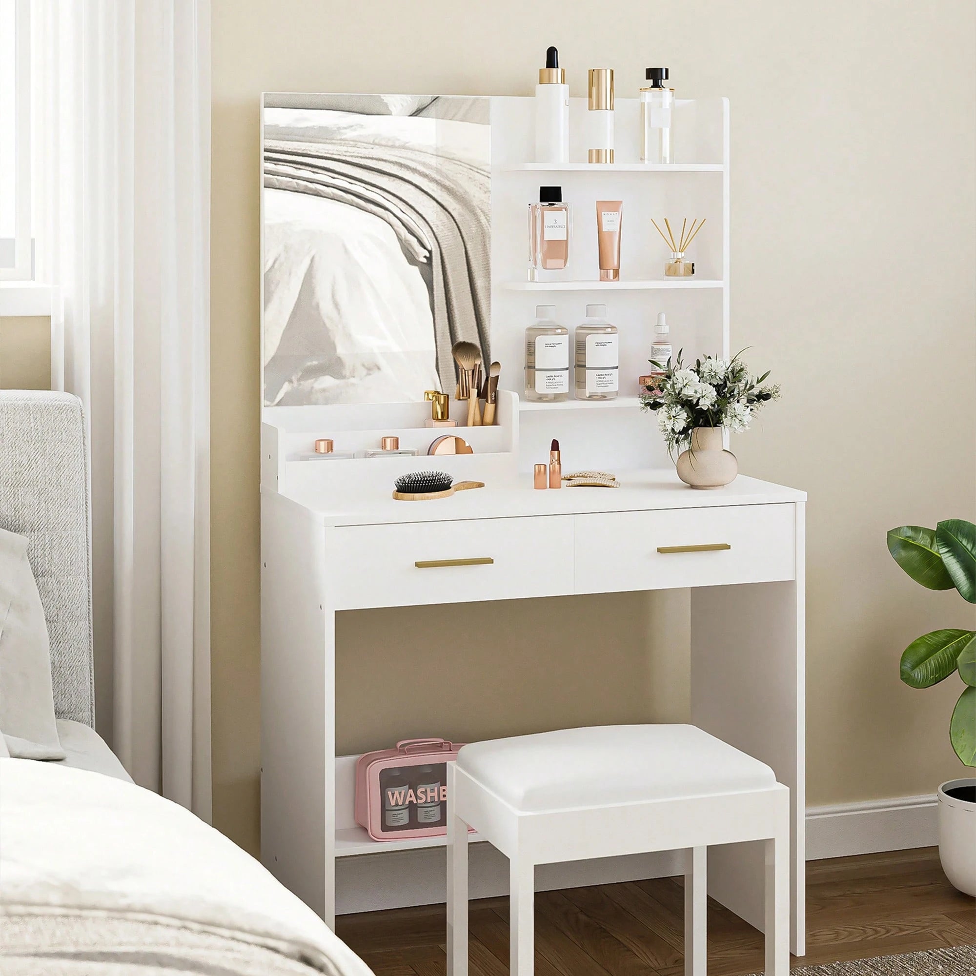 Dotata di uno specchio grande che amplifica la luce naturale, offre 4 ripiani aperti per esporre i tuoi prodotti di bellezza preferiti e 2 cassetti capienti per riporre articoli più delicati.