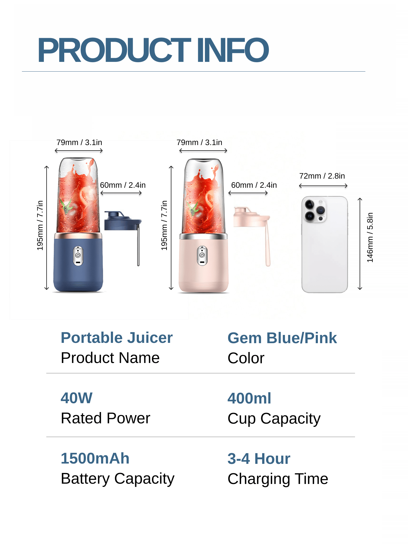 400ml Frullatore portatile ricaricabile di alta capacità con 6 lame per triturare velocemente il ghiaccio, perfetto per frullati, succhi di verdura e frutta, ideale per la cucina e i viaggi