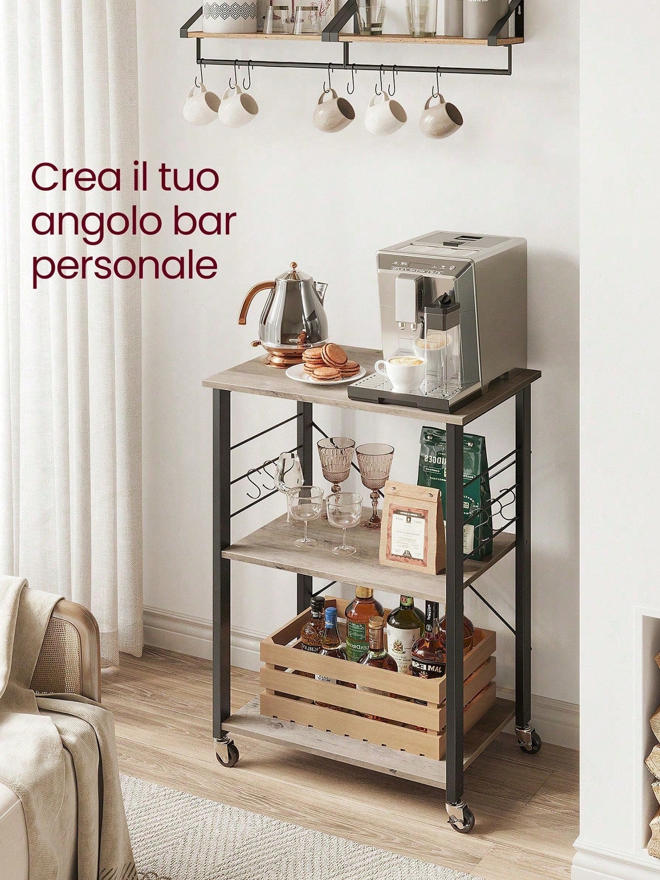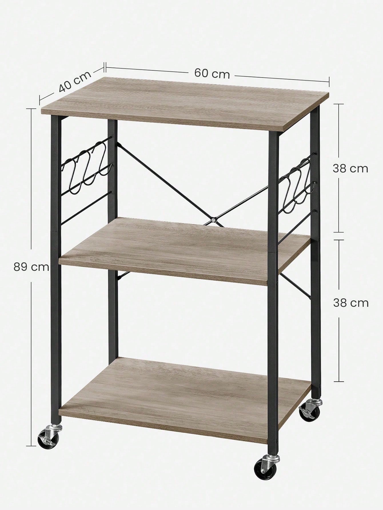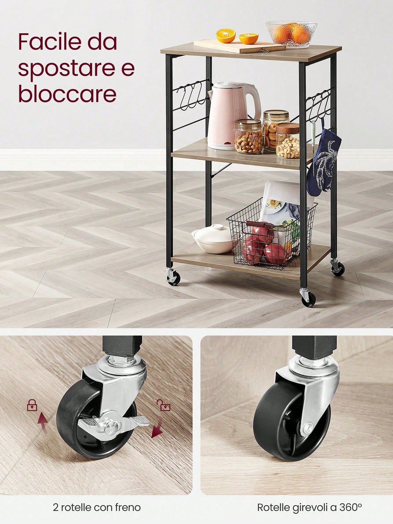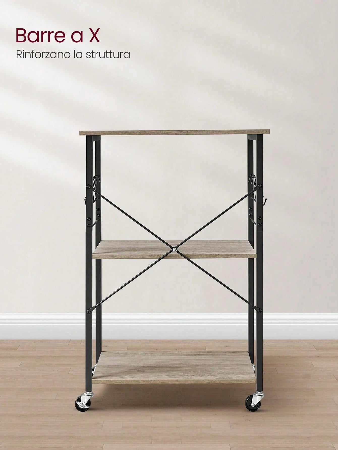 Carrello da cucina multifunzionale con 3 ripiani spaziosi, ideale per organizzare e servire. La struttura metallica robusta supporta microonde, forni e piccoli elettrodomestici, mentre i 6 ganci integrati offrono praticità per appendere utensili e strofinacci.
