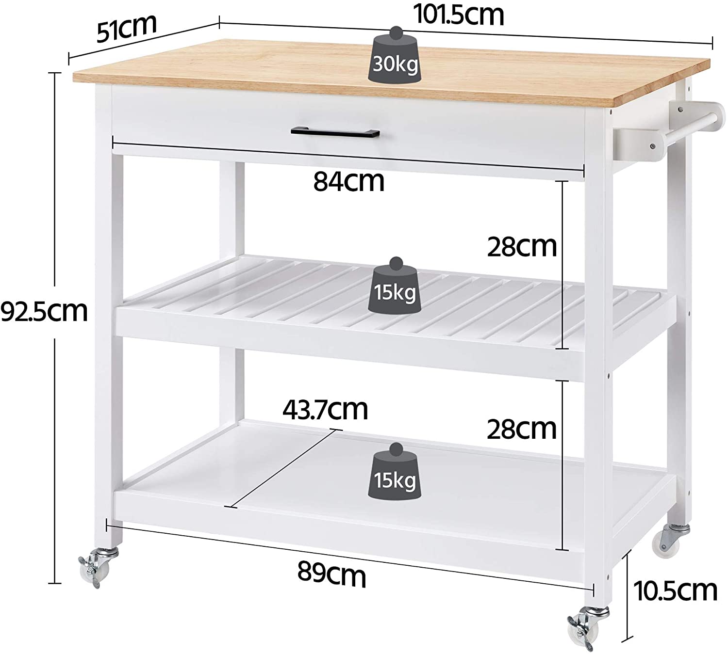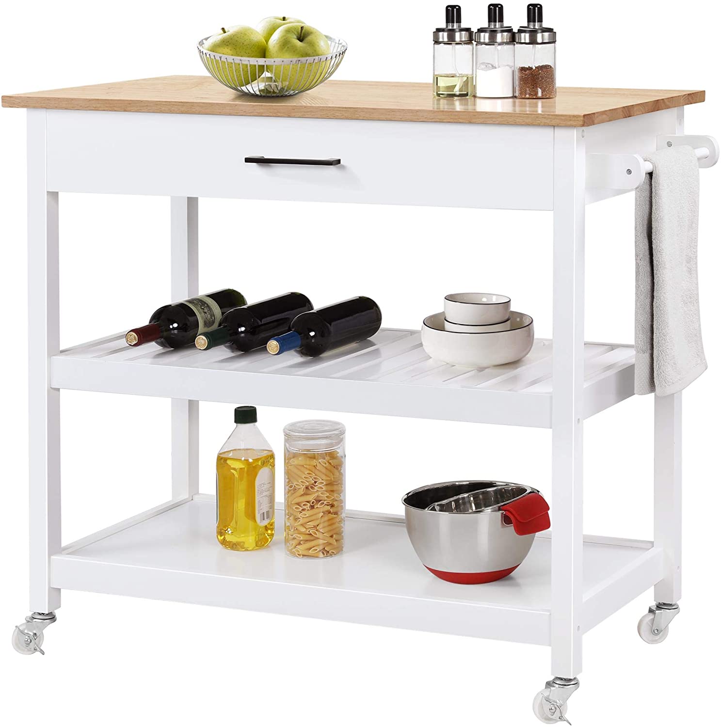 Carrello da Cucina con Ruote Carrellino Portaoggetti Salvaspazio a 3 Ripiani Stile Moderno Porta Microonde Multiuso 102 x 51 x 93 cm Strategico: il piano di lavoro offre uno spazio extra per i gomiti durante la preparazione dei pasti; c'e' un ampio cassetto ti permette di tenere gli elementi essenziali...