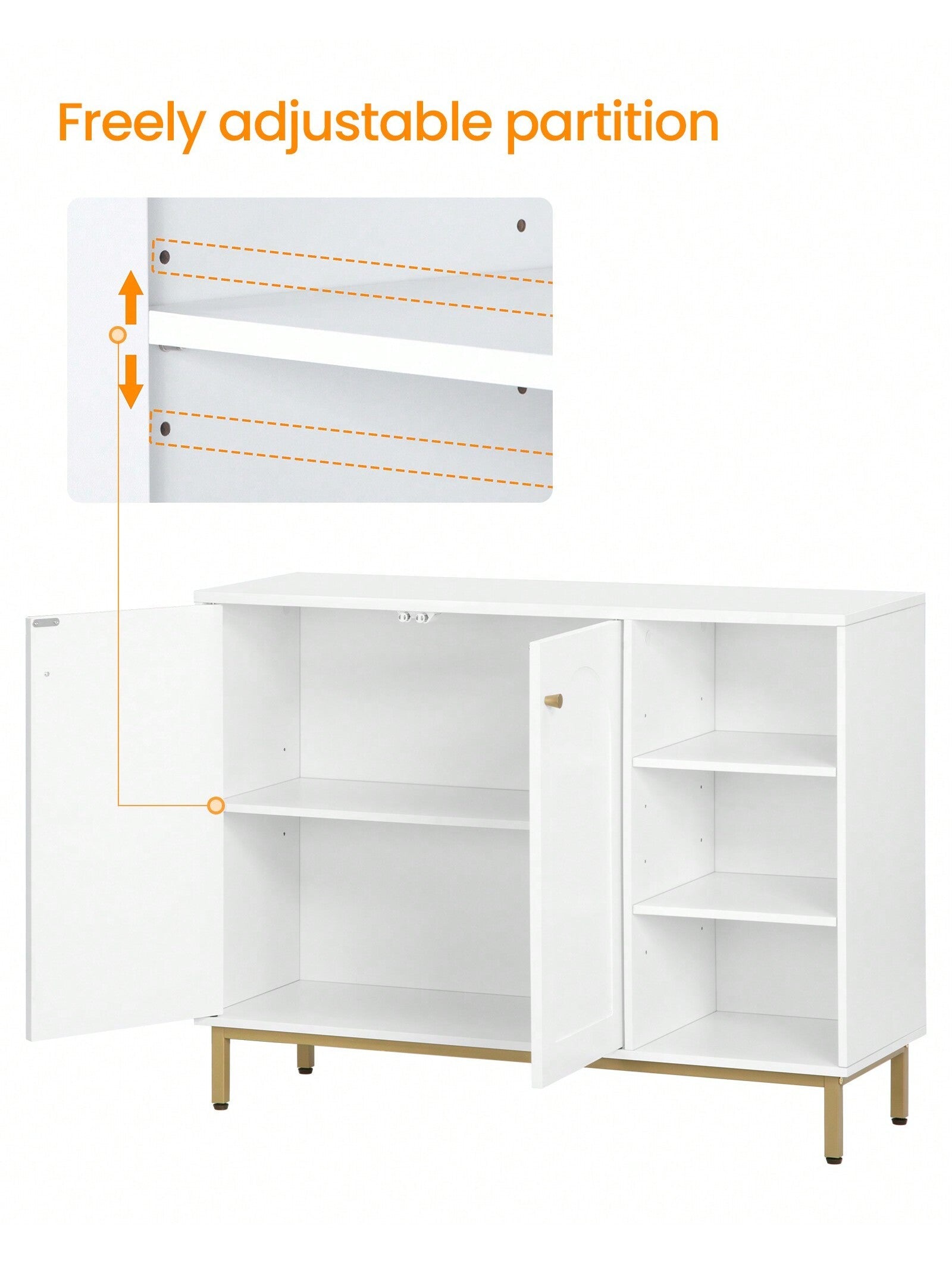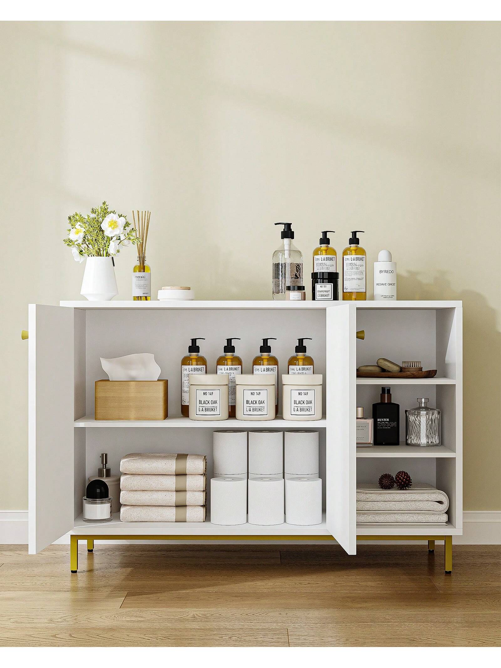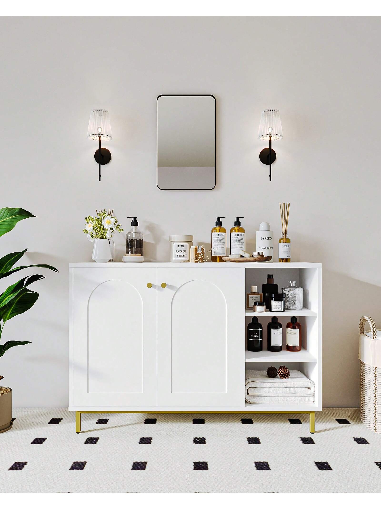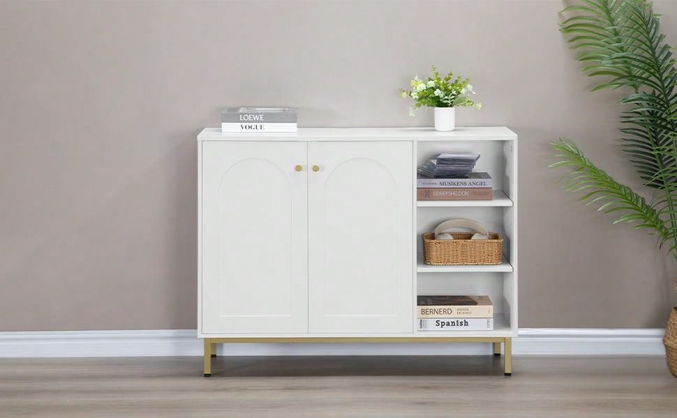 [Design unico]Il classico colore bianco, il design minimalista, le porte ad arco e le gambe dorate rendono questo mobile da pavimento un complemento alla moda per l'arredamento di qualsiasi stanza, sia essa il bagno,