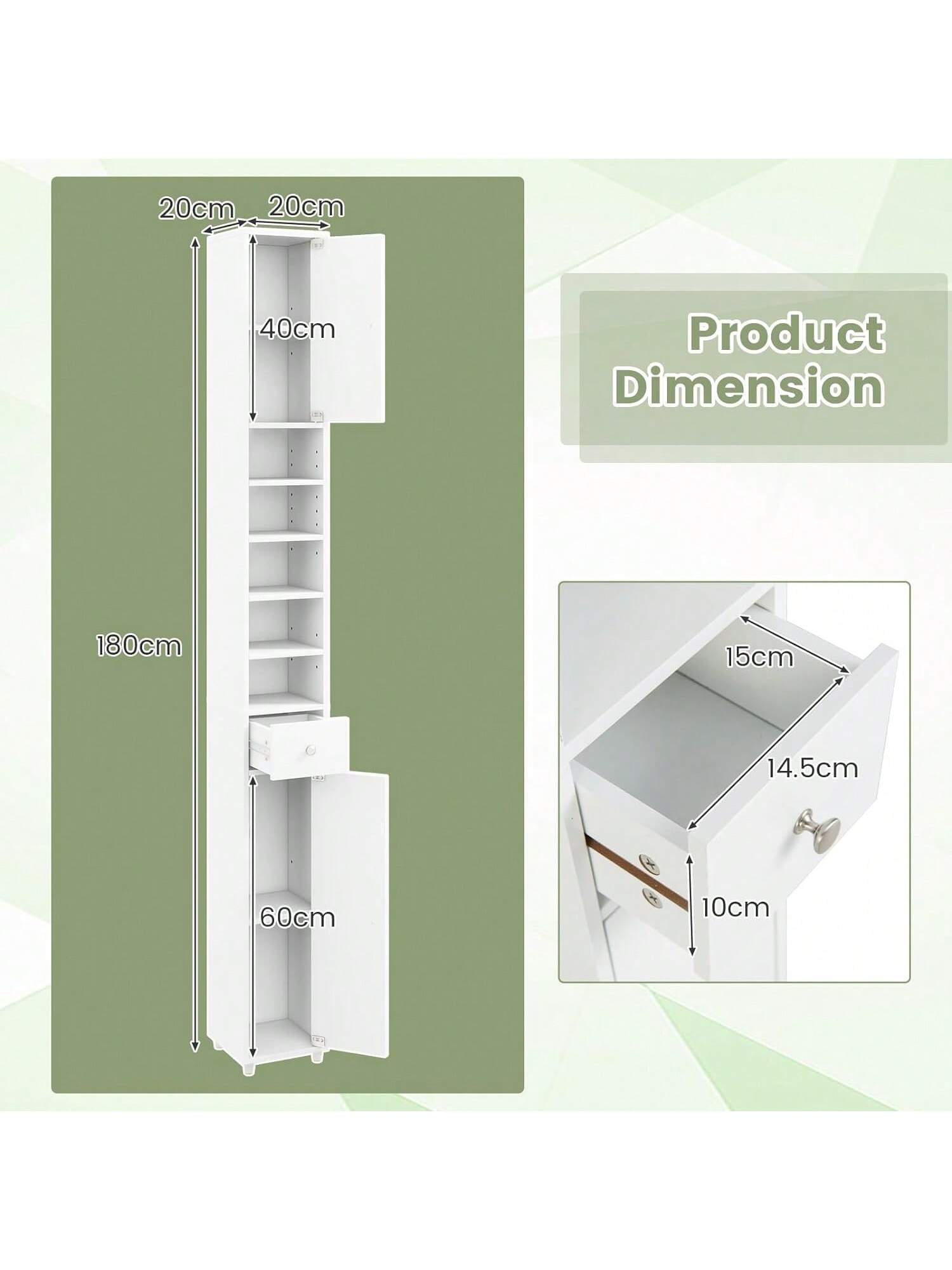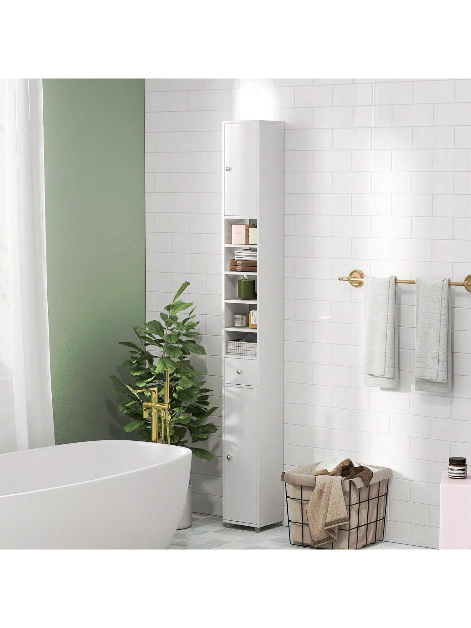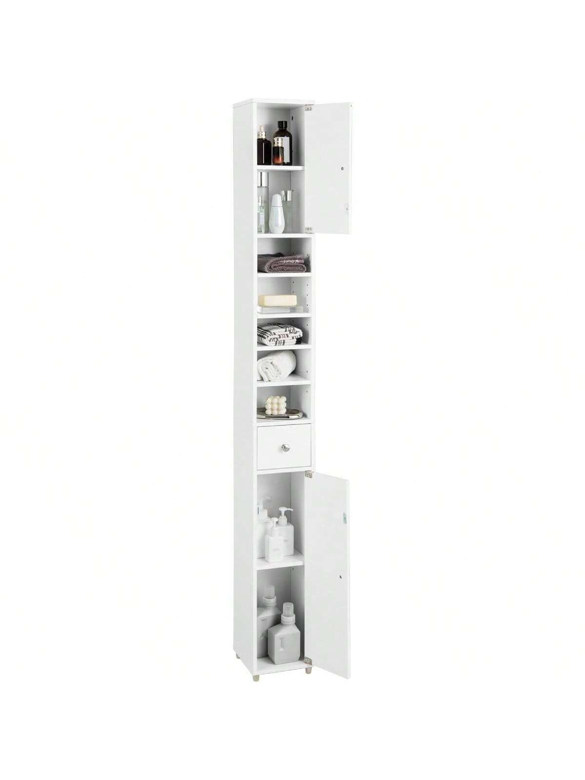 Mobile da bagno stretto, mobile alto con cassetti, ante e ripiani
