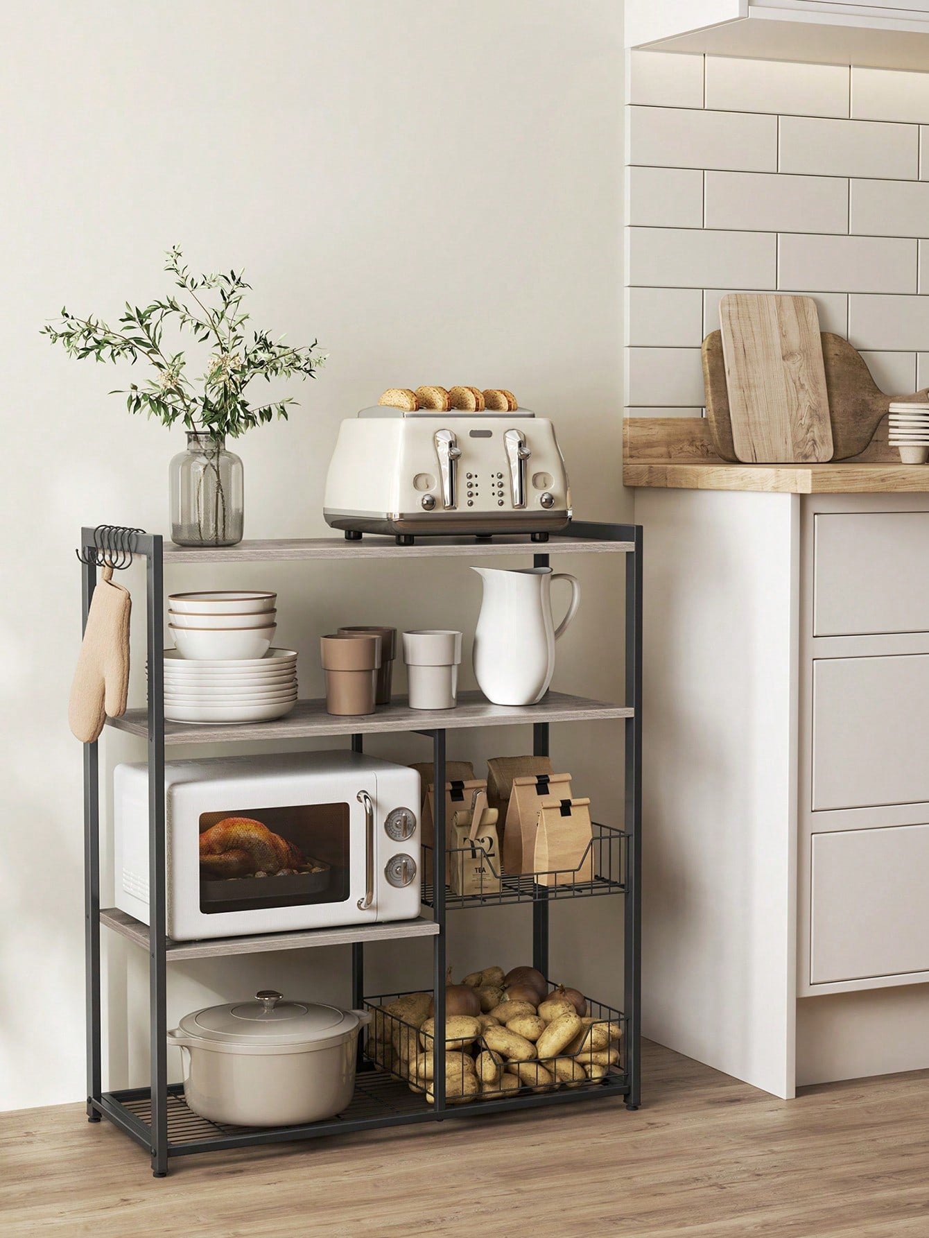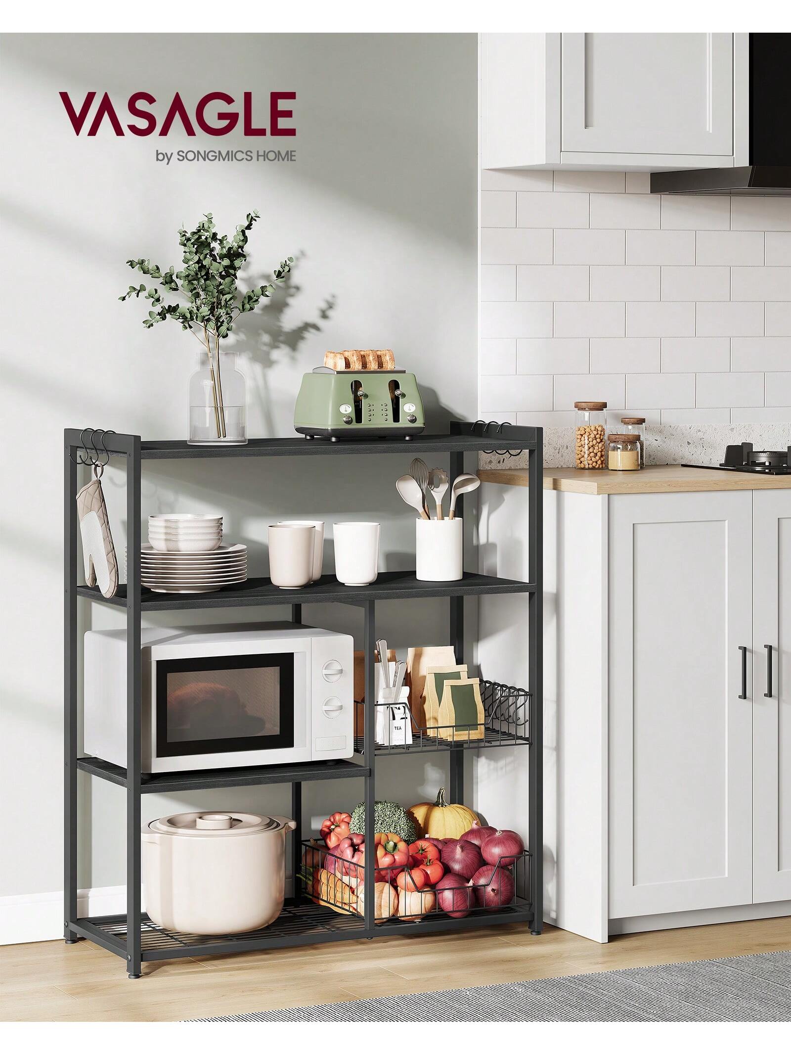 Scaffale per Microonde con 2 Cesti in Rete Metallica, Scaffale da Cucina con Piano d'Appoggio