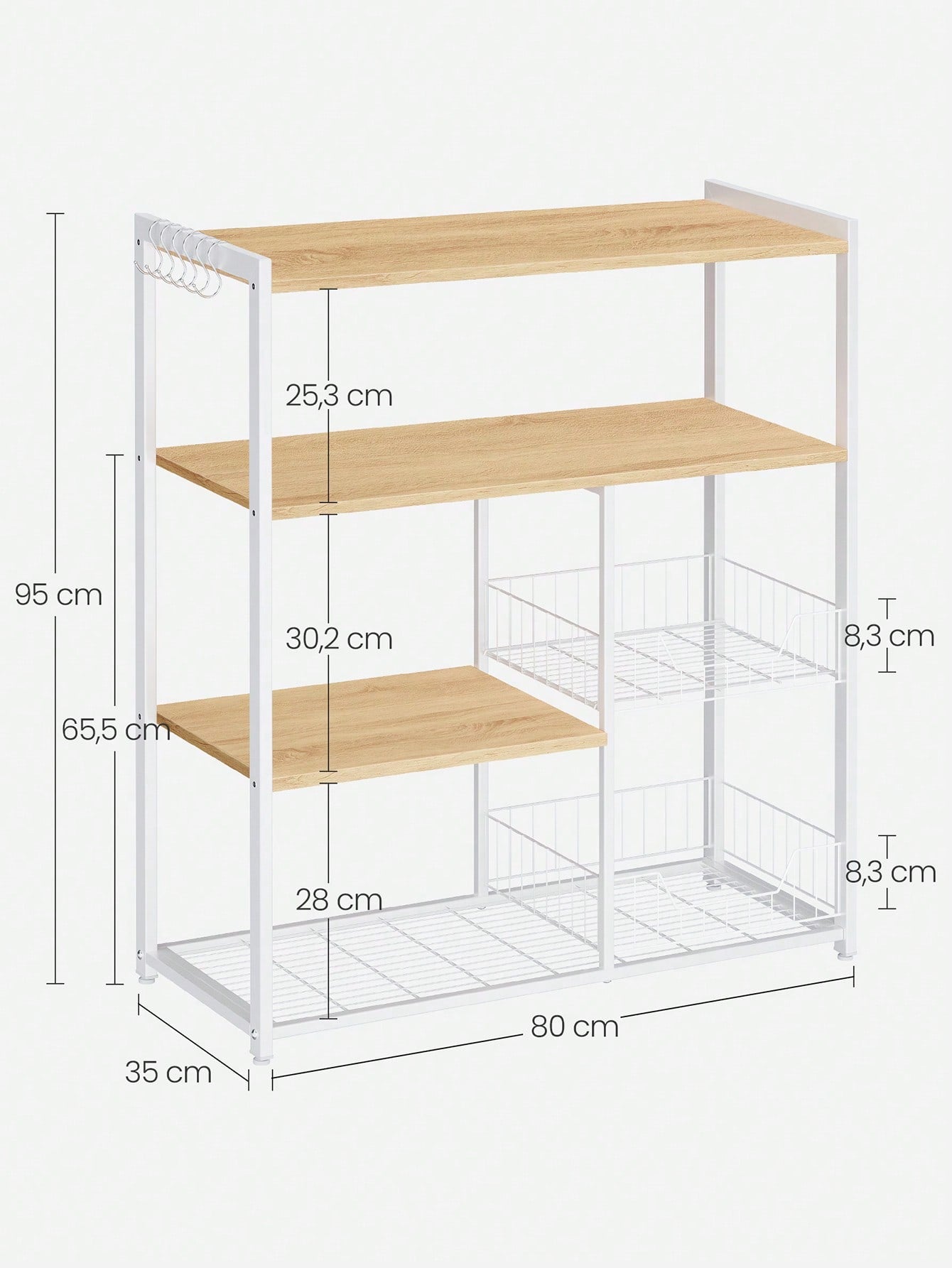 Organizzazione in cucina] La prima regola in cucina è l'ordine. Con questo scaffale dotato di diversi ripiani per barattoli e stoviglie, 2 cestini in rete metallica alti 9 cm per la frutta e 6 ganci a S per gli utensili, sarai già a metà dell'opera