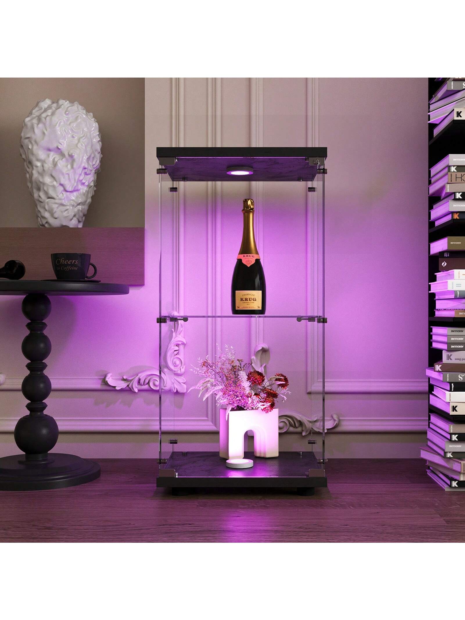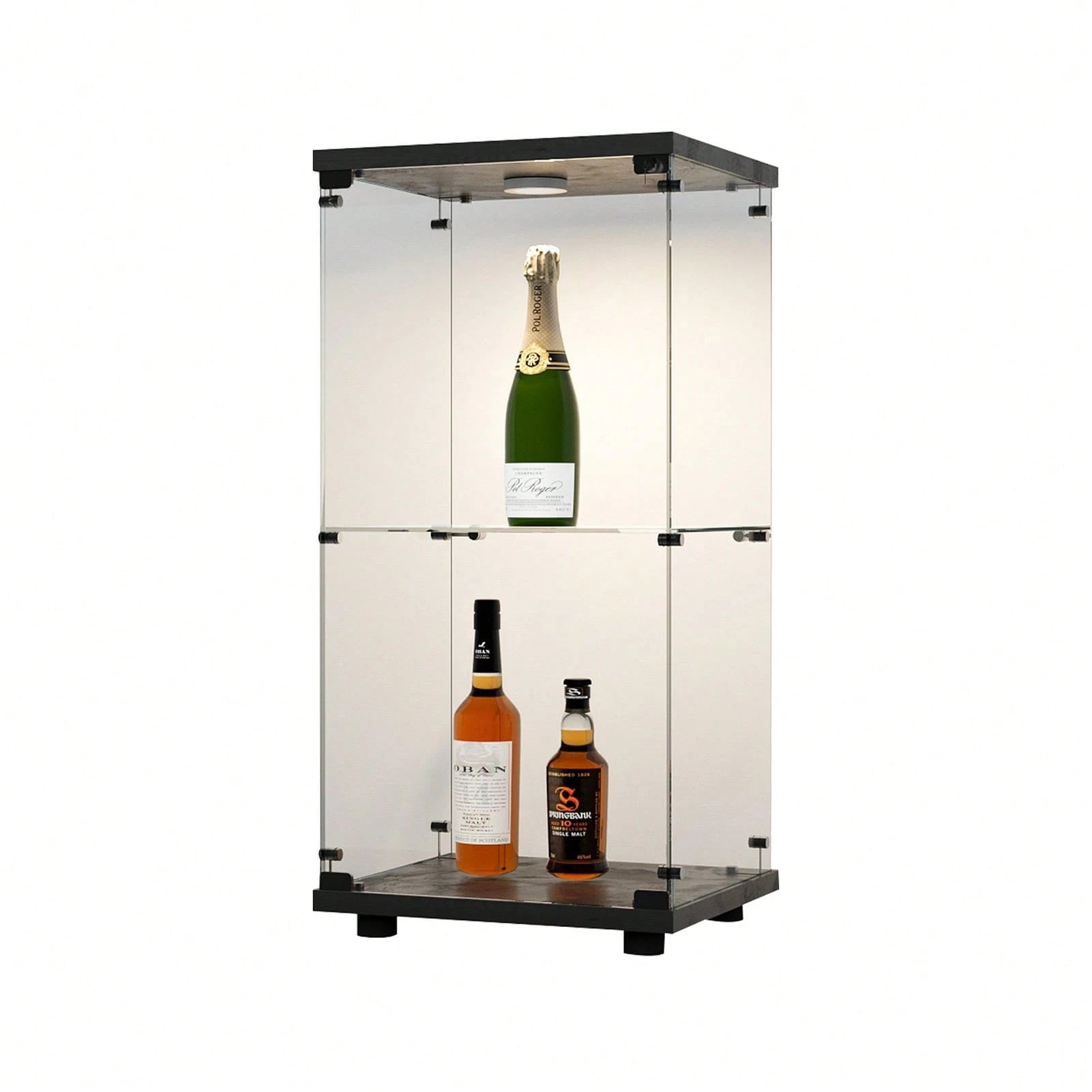 I ripiani in vetro trasparente permettono una visibilità ottimale da ogni angolazione, valorizzando ogni oggetto esposto.