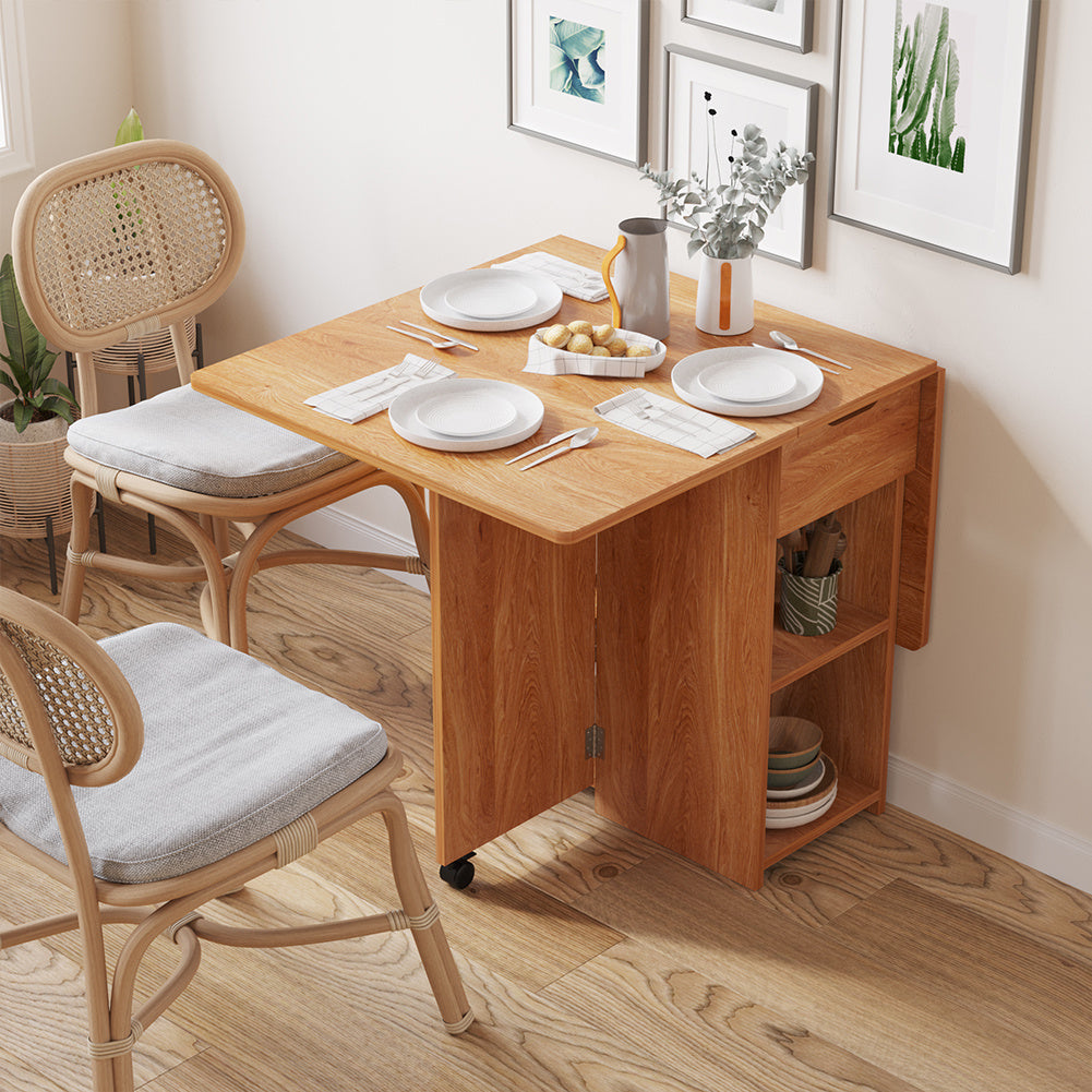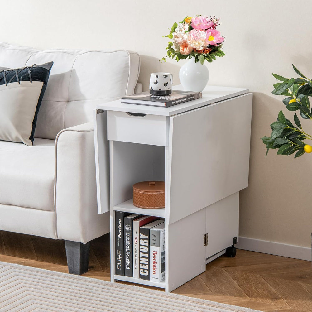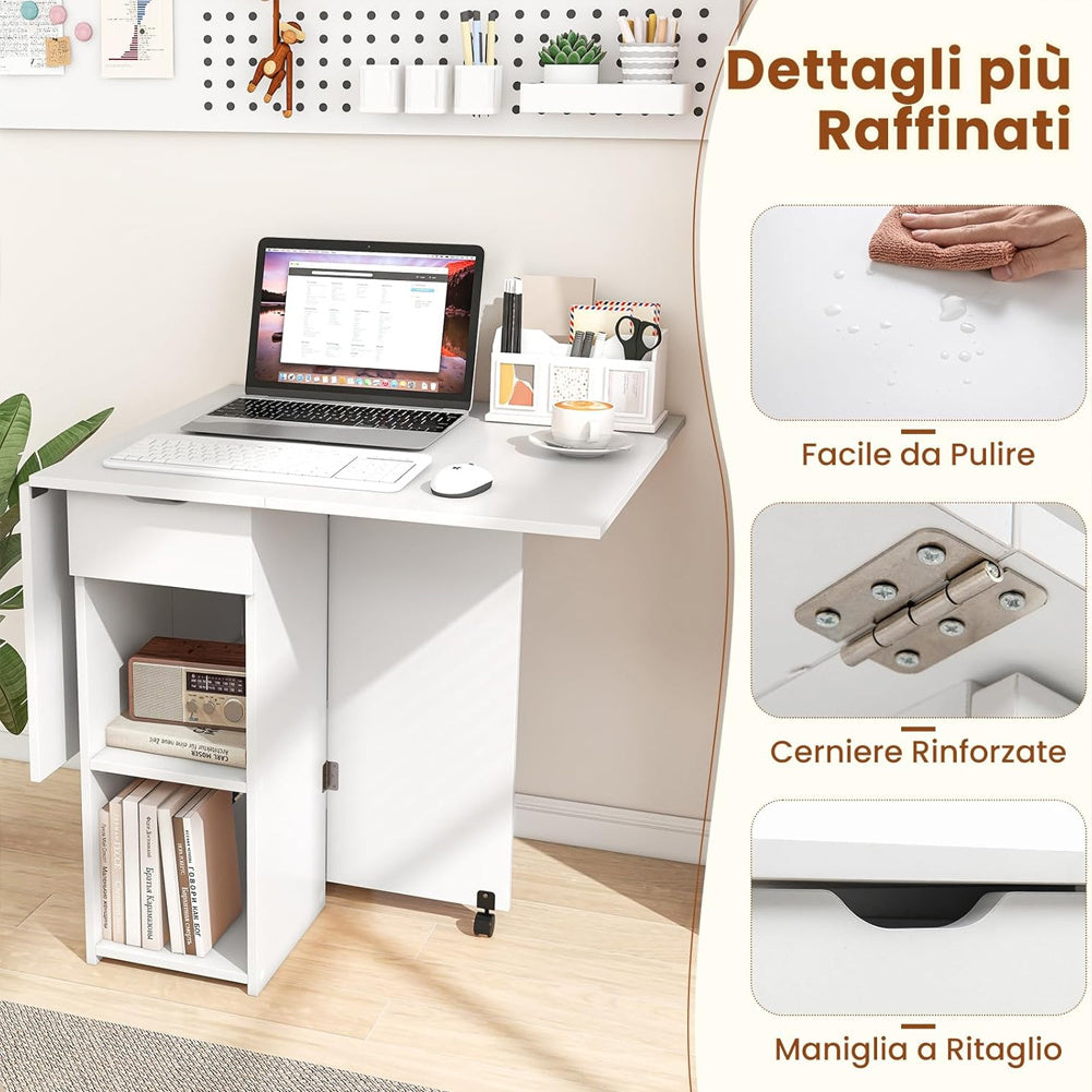 Tavolo da Pranzo Pieghevole Salvaspazio con Ruote, Scrivania Richiudibile con 2 Ripiani e 1 Cassetto