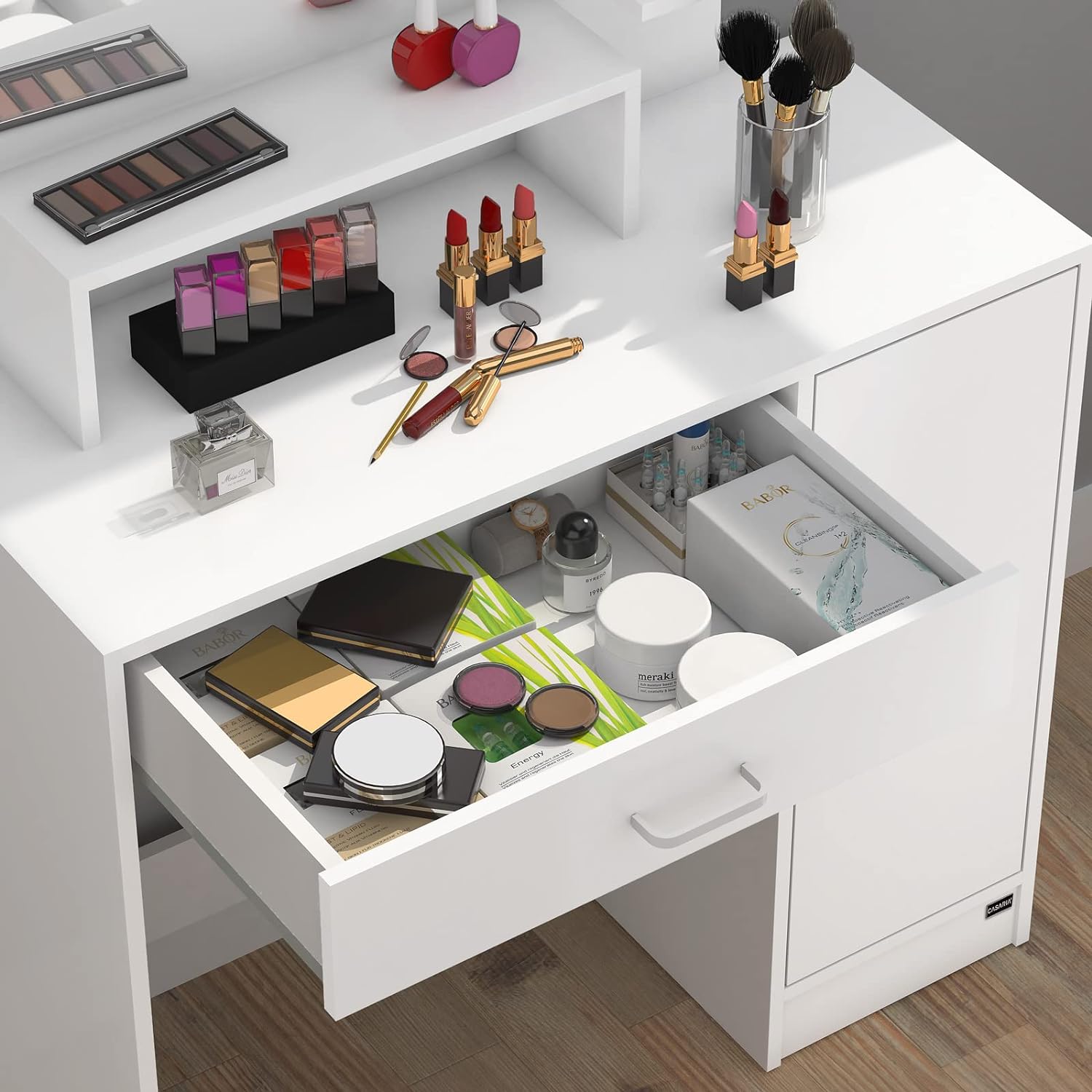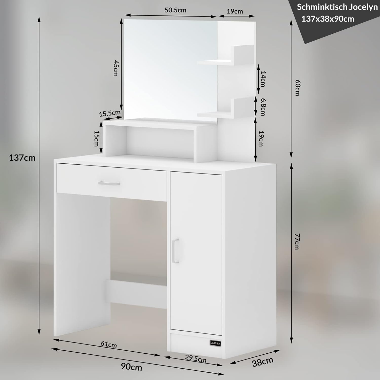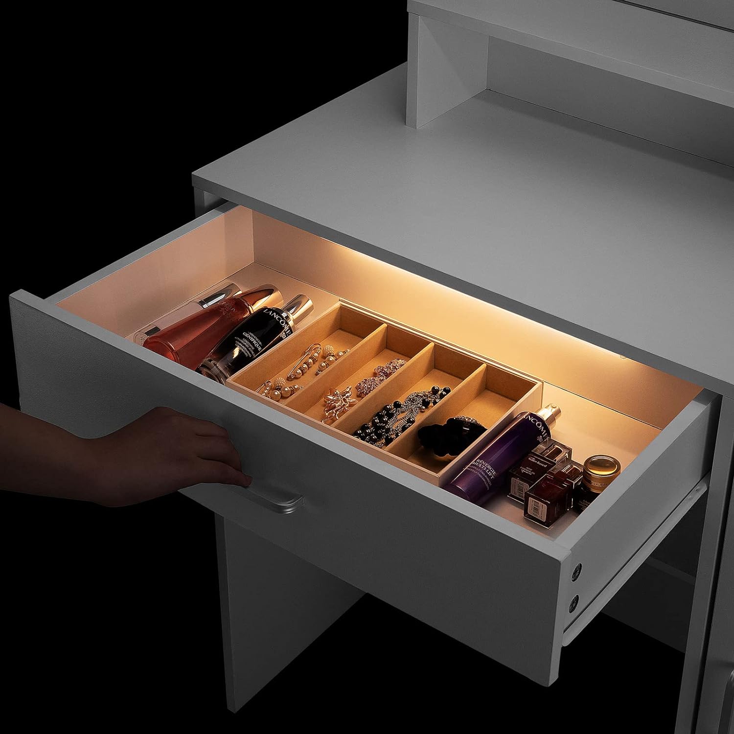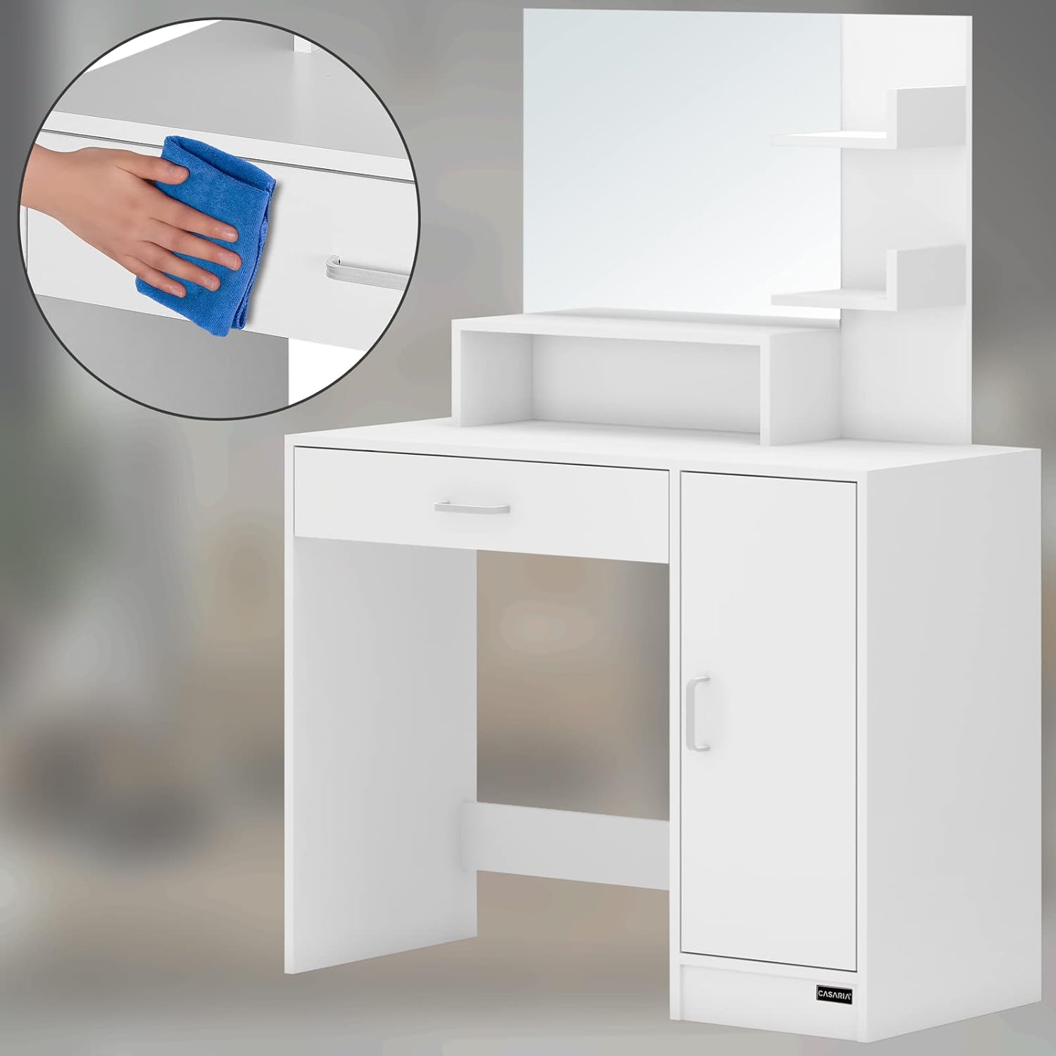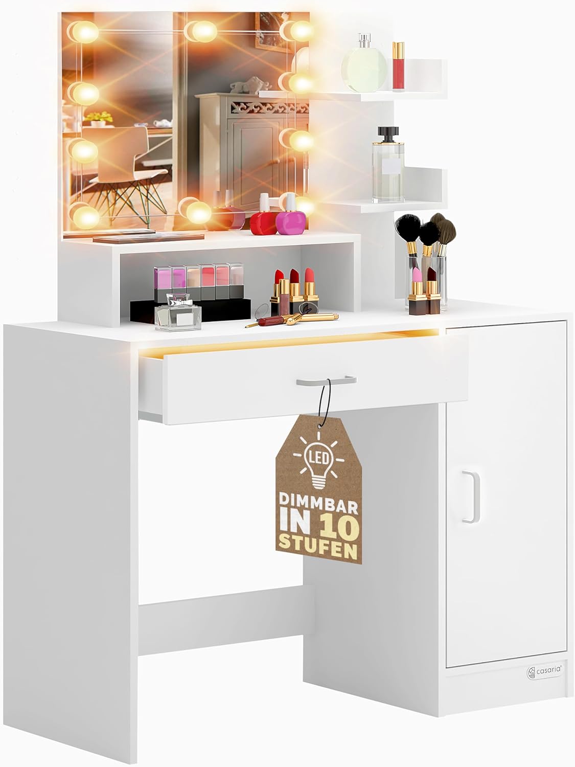 Tavolino da Trucco Vicco con Specchio 1 Cassetto con Luci 3 Ripiani Bianco